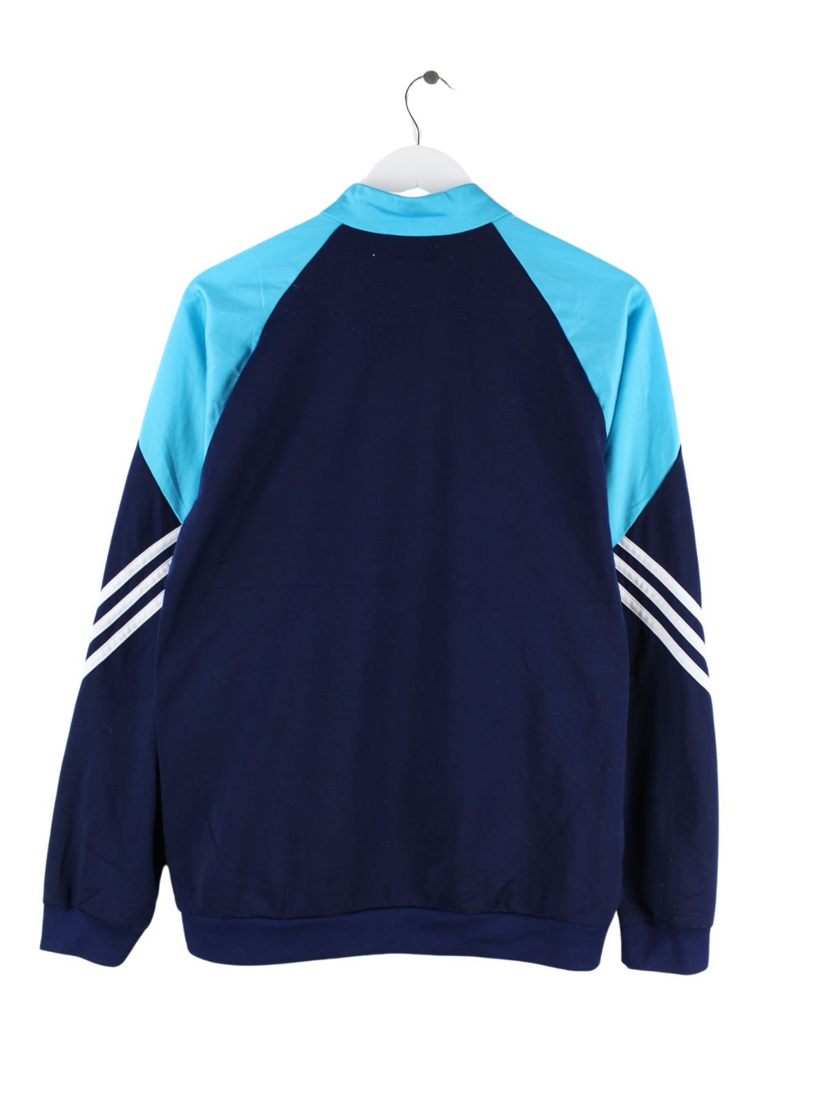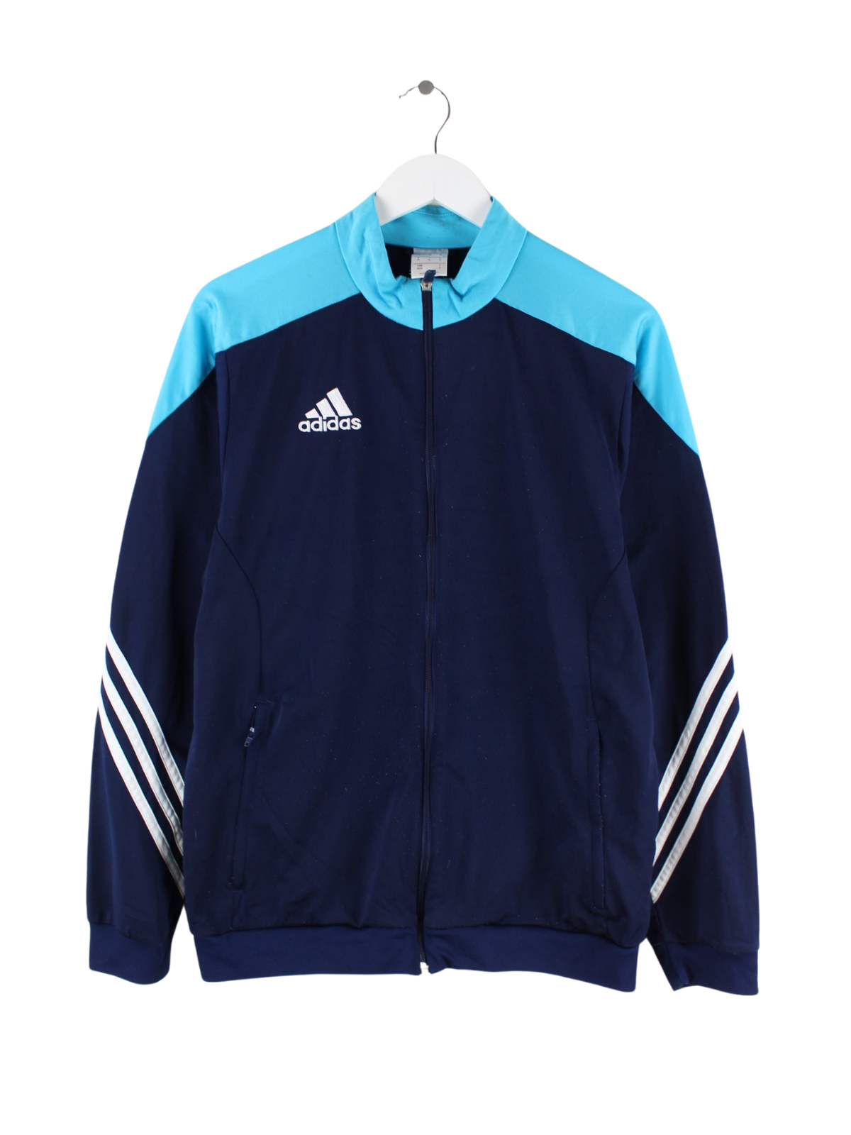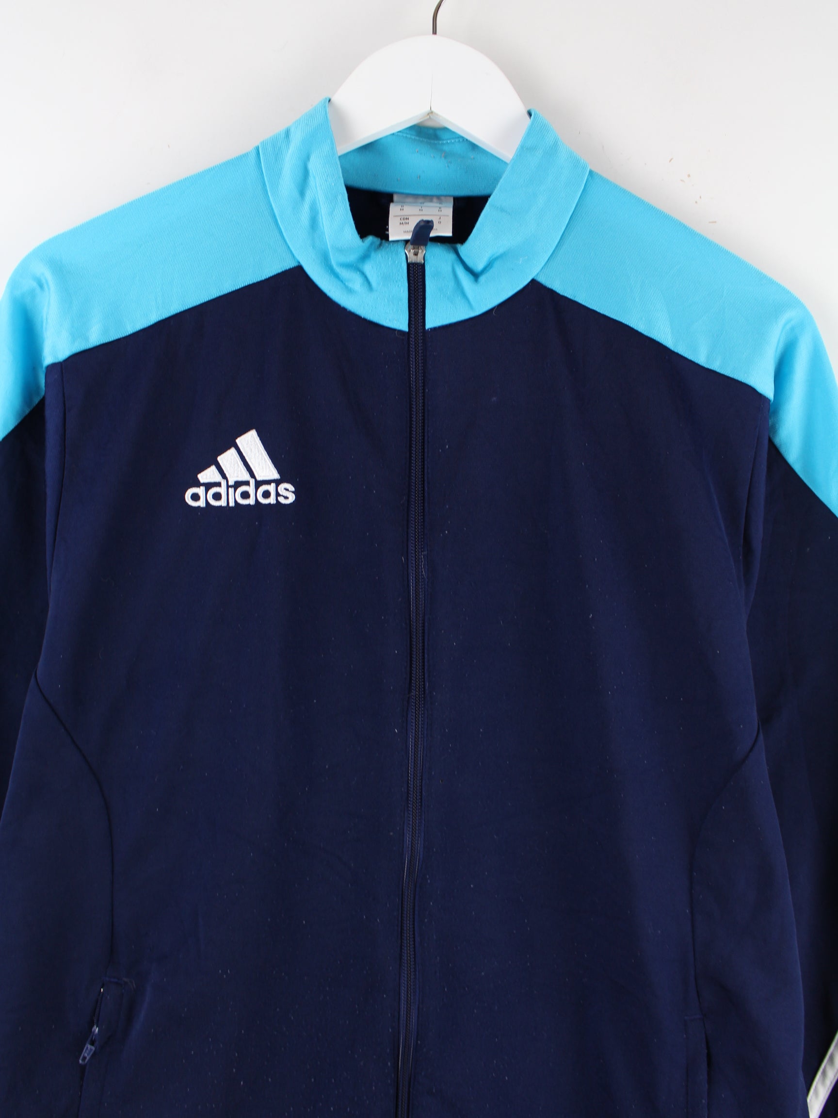 Blaue Trainingsjacke aus dem Hause Adidas in Größe M. Sie ist aus Synthetik gefertigt und in gutem Zustand zu bekommen.