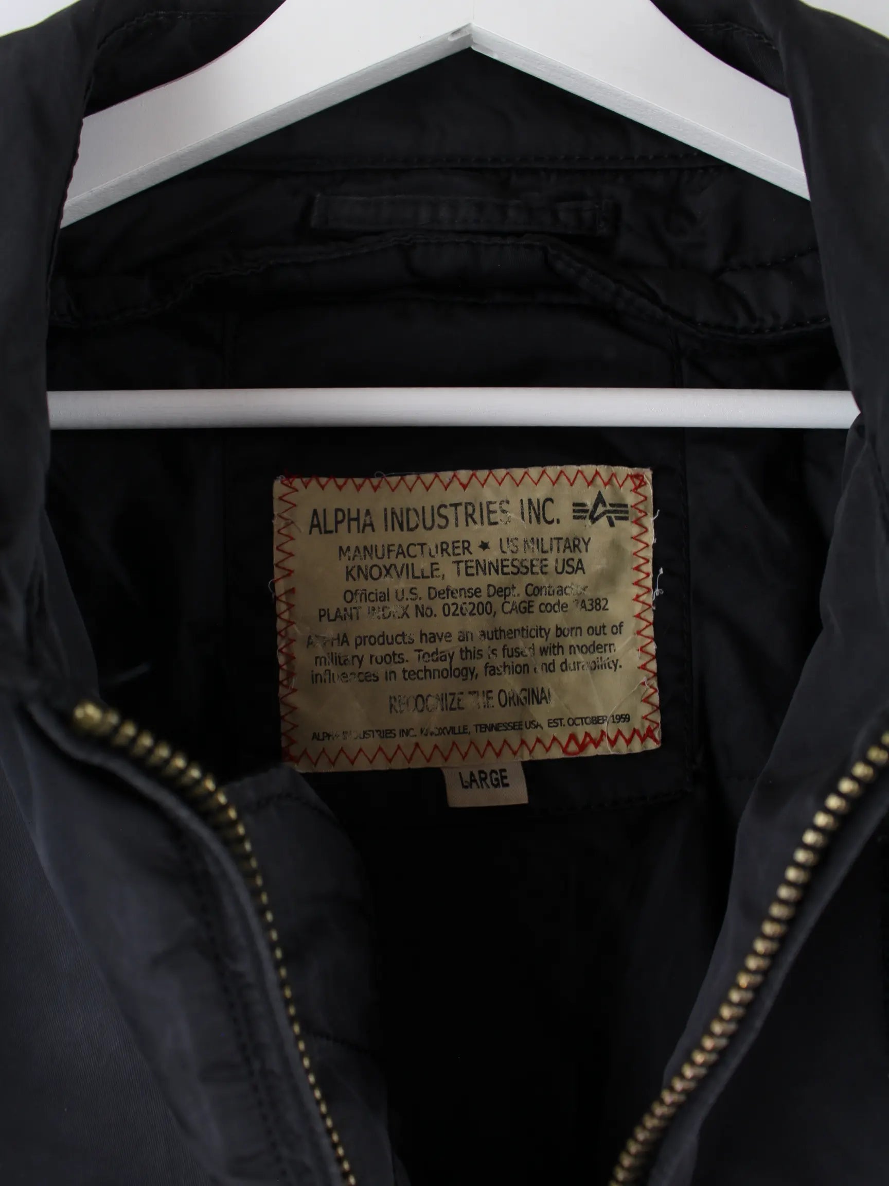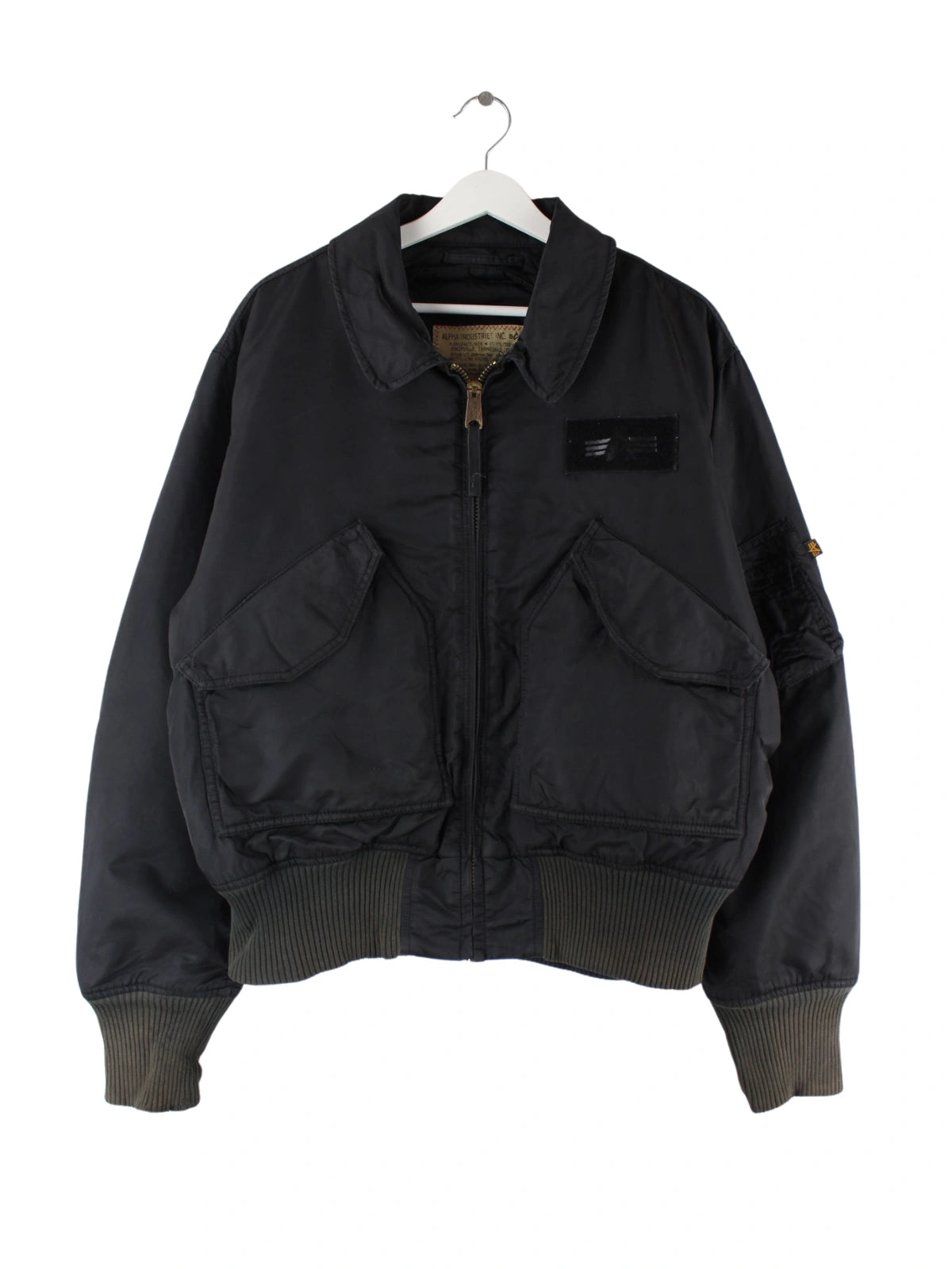 Schwarze Jacke vom Label Alpha Industries in Größe L. Sie ist aus Synthetik angefertigt und in gutem Zustand in Stock.