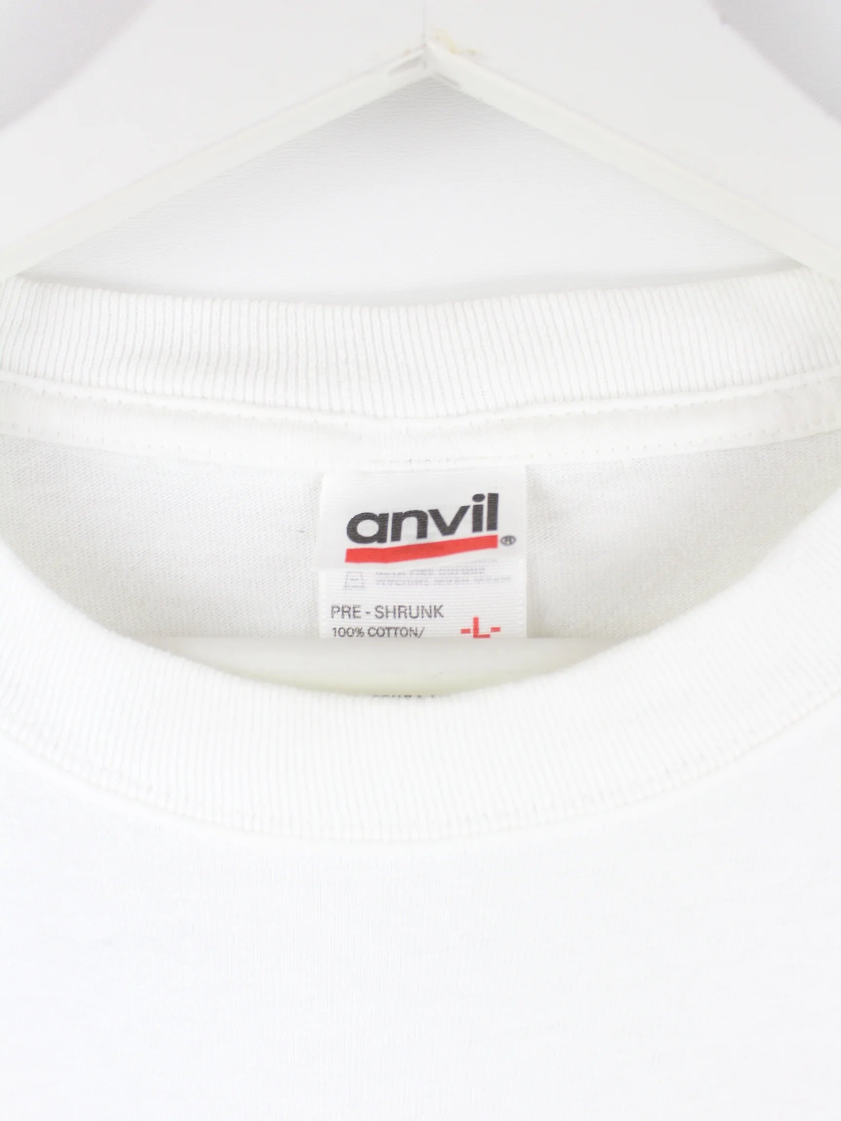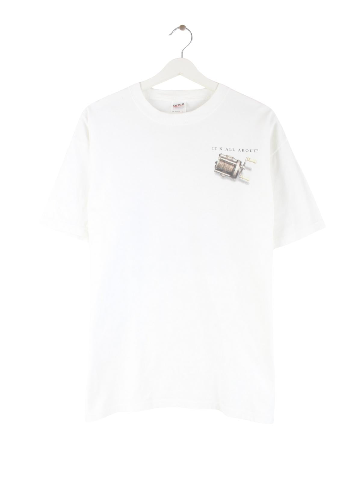 T-Shirt von Anvil in Größe L. Es ist aus Baumwolle angefertigt und in Weiß in Stock. Mit seltenem Fishing Print.