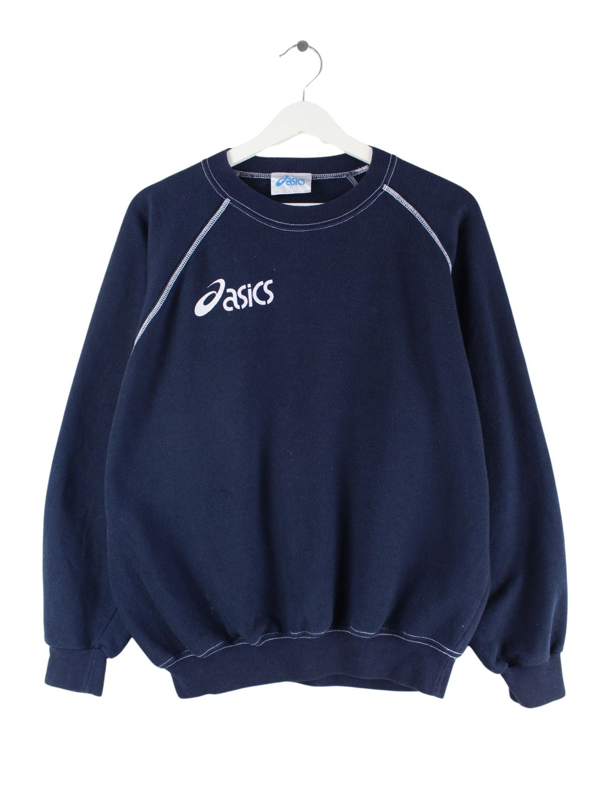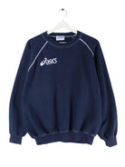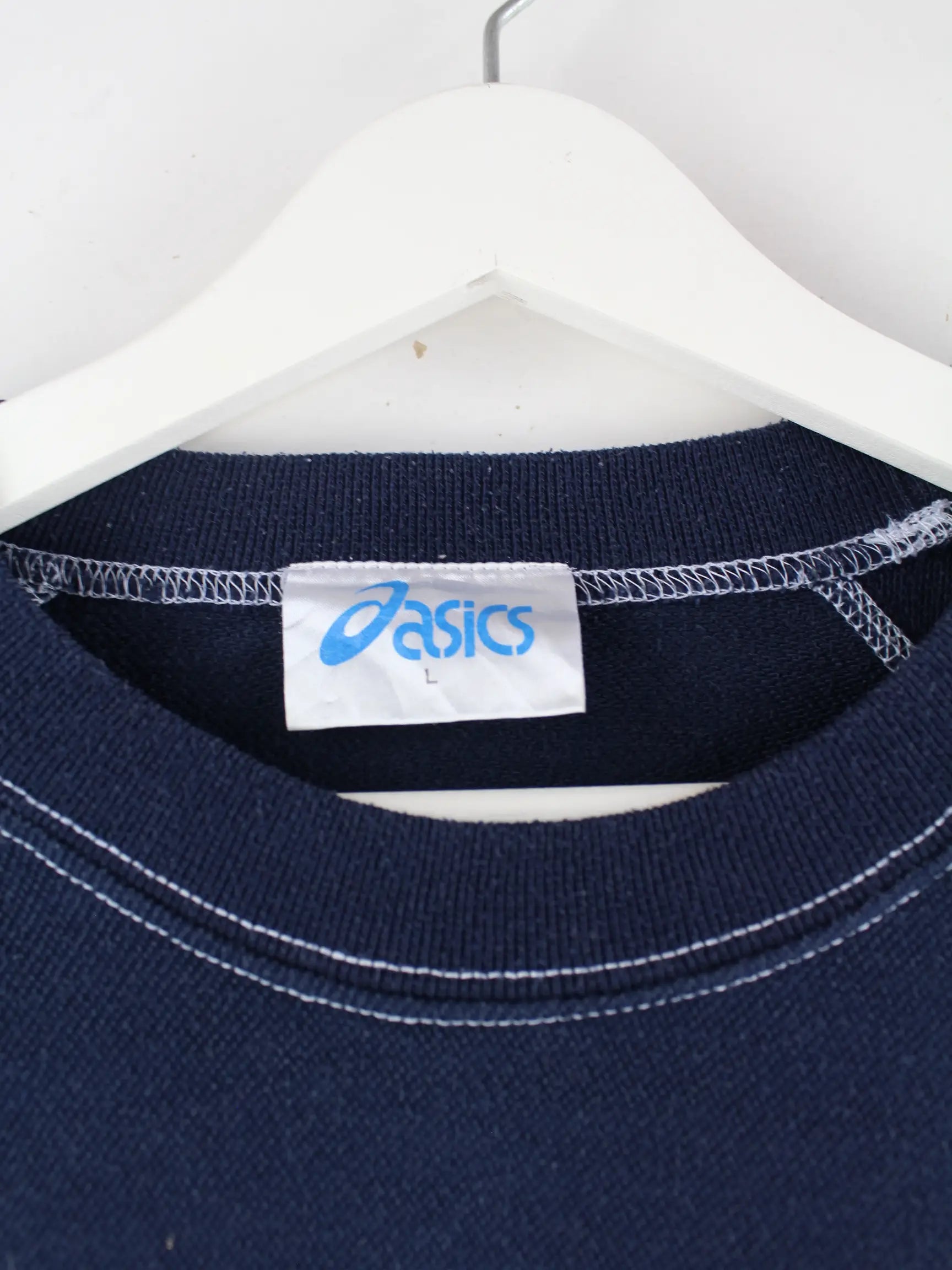 Sweater aus dem Hause Asics in Größe L aus den 90'ern. Er ist aus einer Baumwollmischung produziert und in Blau bei uns zu bekommen. Mit tollem Vintage Print.