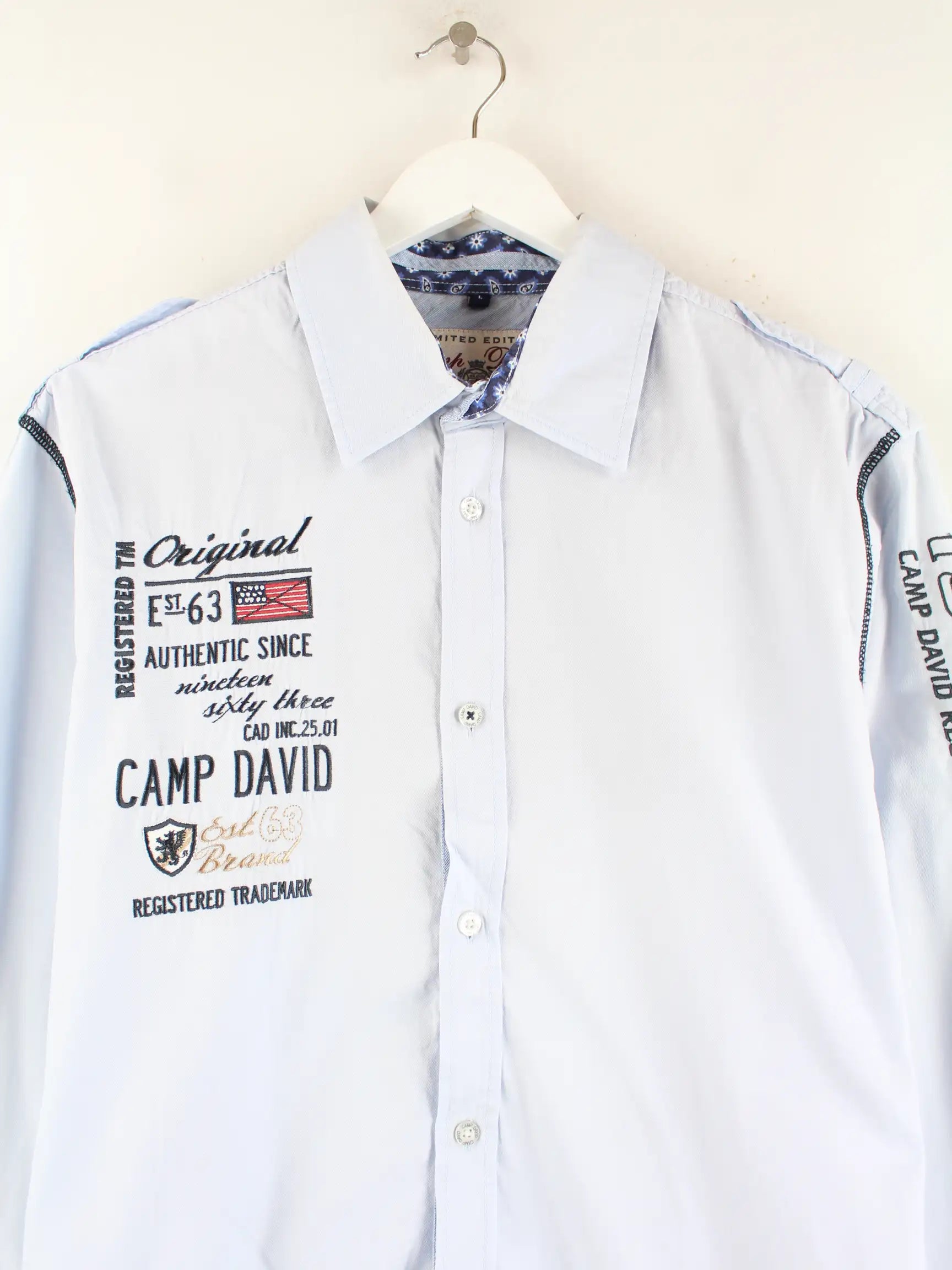 Freizeit Hemd des Labels Camp David mit gesticktem Logo in Größe L. Es ist aus Baumwolle angefertigt und in Blau vorrätig.