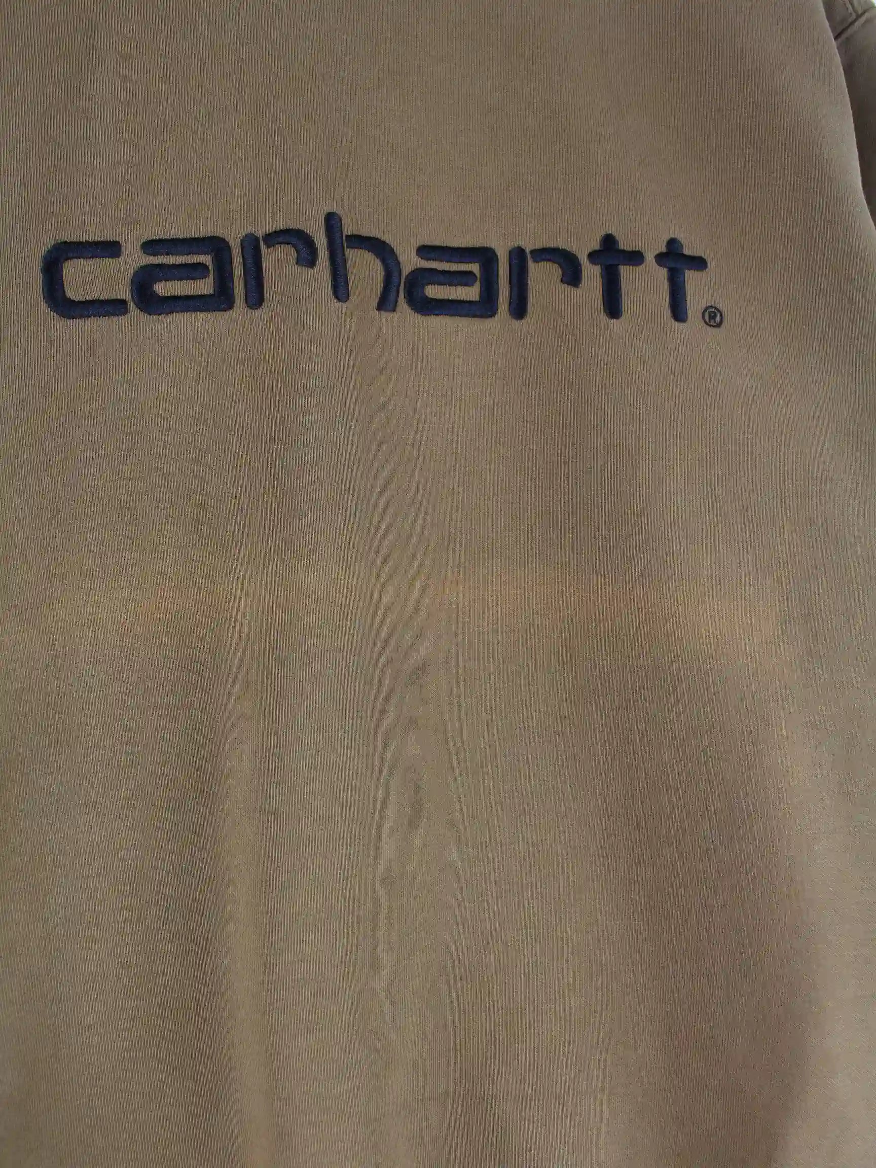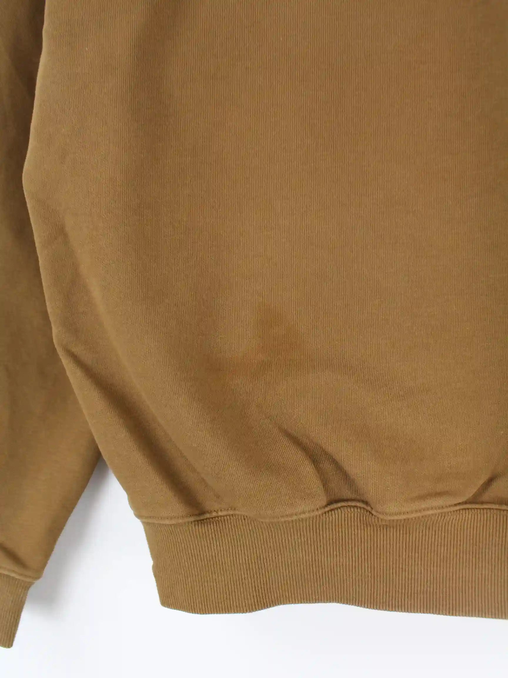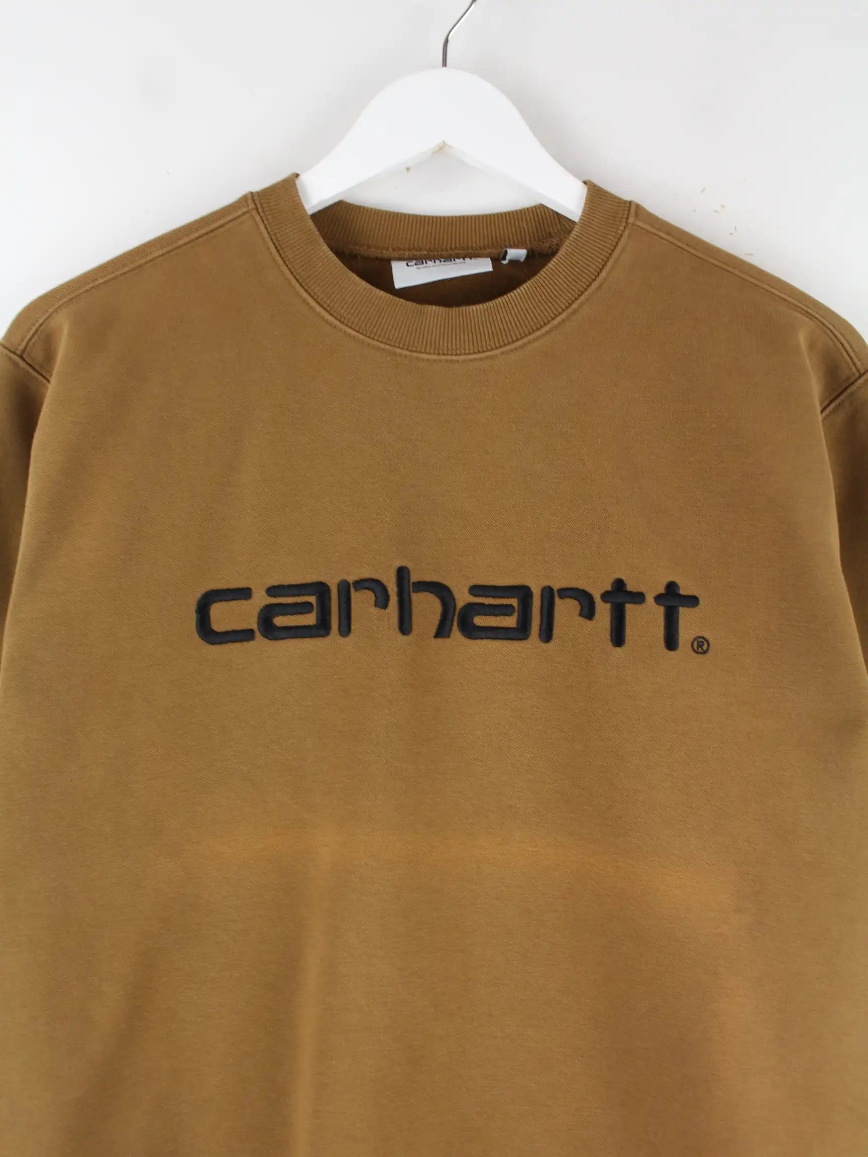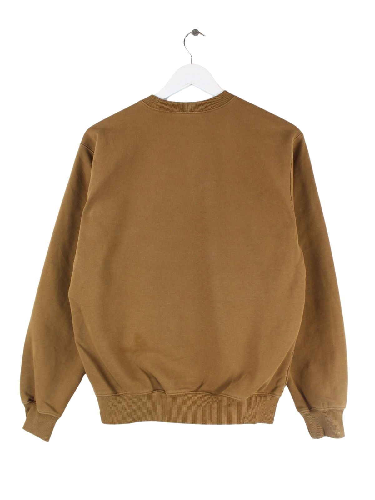 Brauner Sweater mit gesticktem Logo vom Label Carhartt in Größe XS. Er ist aus einer Baumwollmischung gefertigt. Den Zustand würden wir als 'In Ordnung' bezeichnen (vergl. Bilder).
