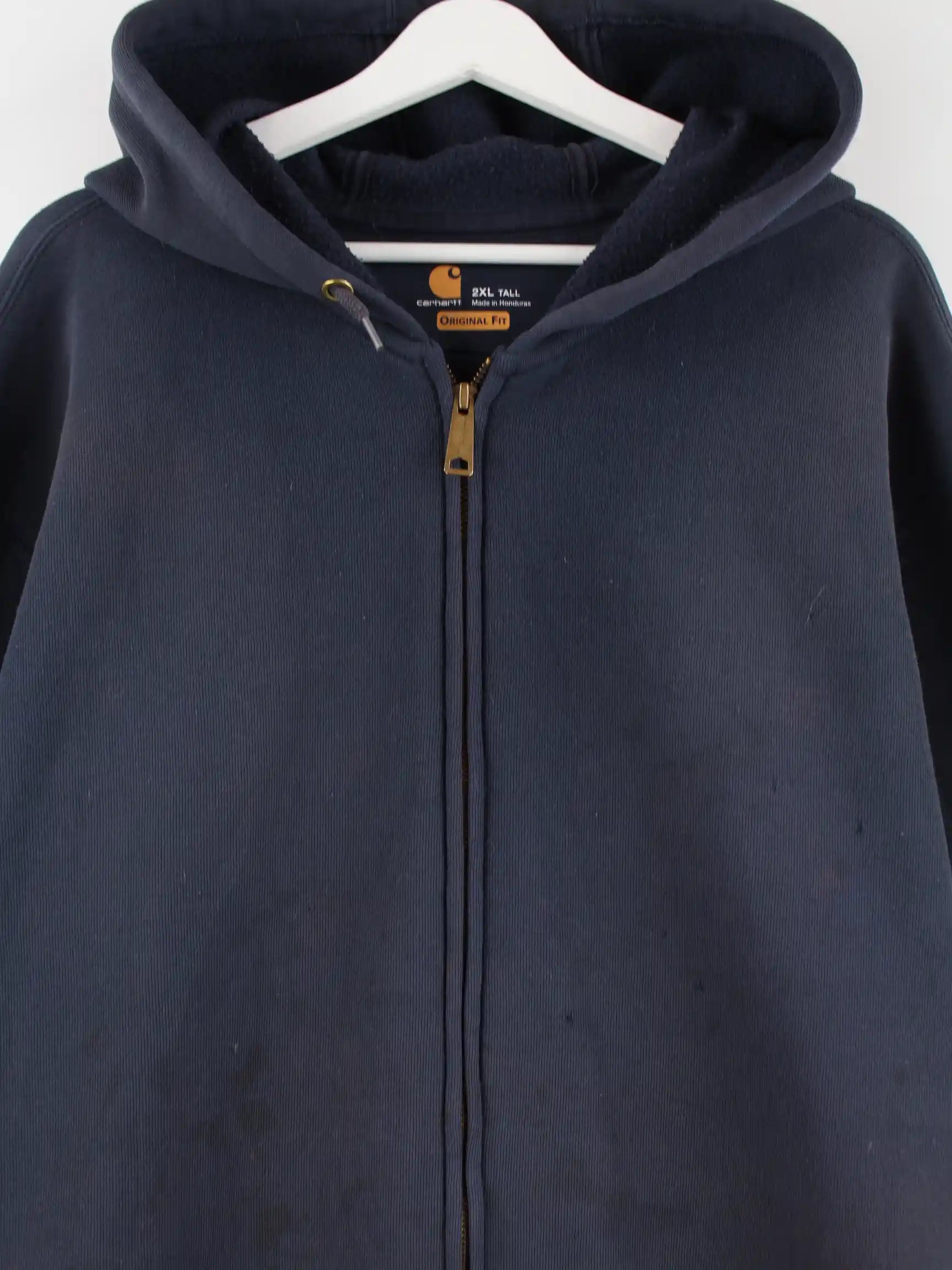 Blauer Hoodie mit durchgehendem Reißverschluß vom Brand Carhartt in Größe XXL. Er ist aus einer Baumwollmischung produziert. Den Zustand würden wir als 'In Ordnung' bezeichnen (vergl. Bilder).