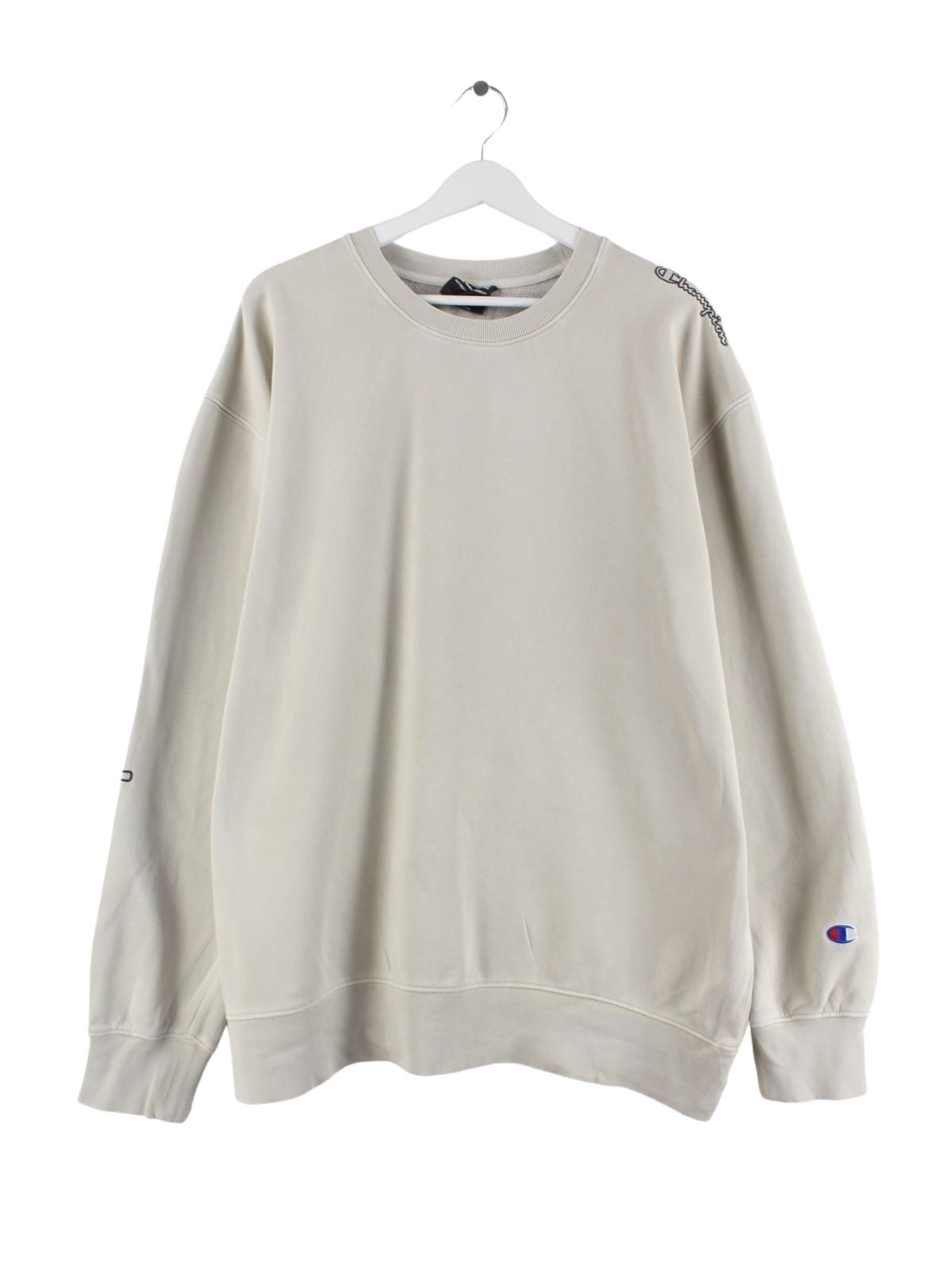 Grauer Sweater mit Stick von Champion in Größe L. Er ist aus einer Baumwollmischung angefertigt und in sehr gutem Zustand in Stock.