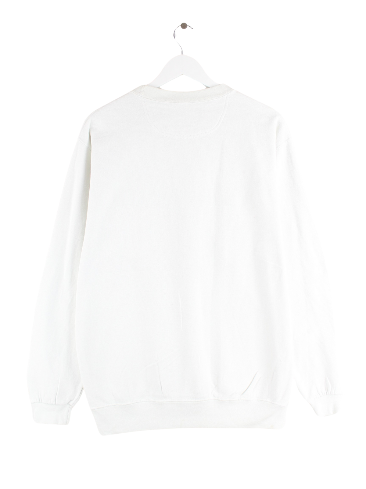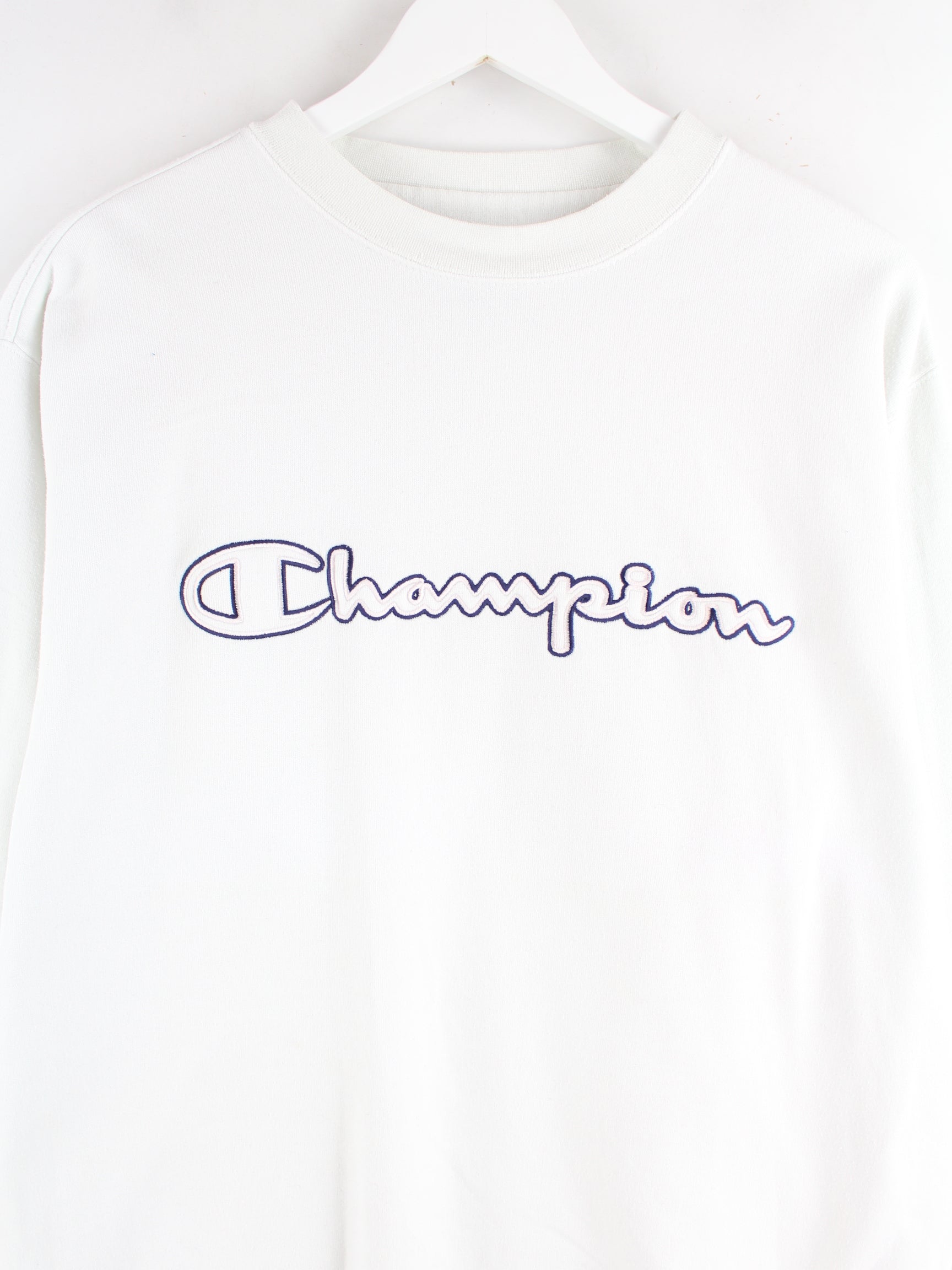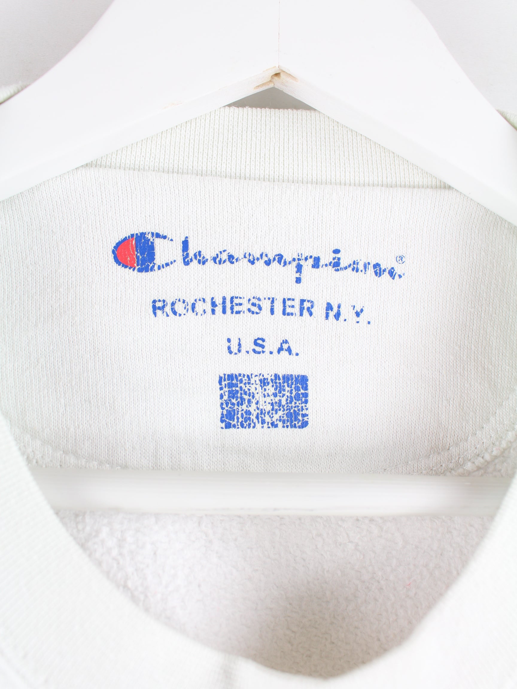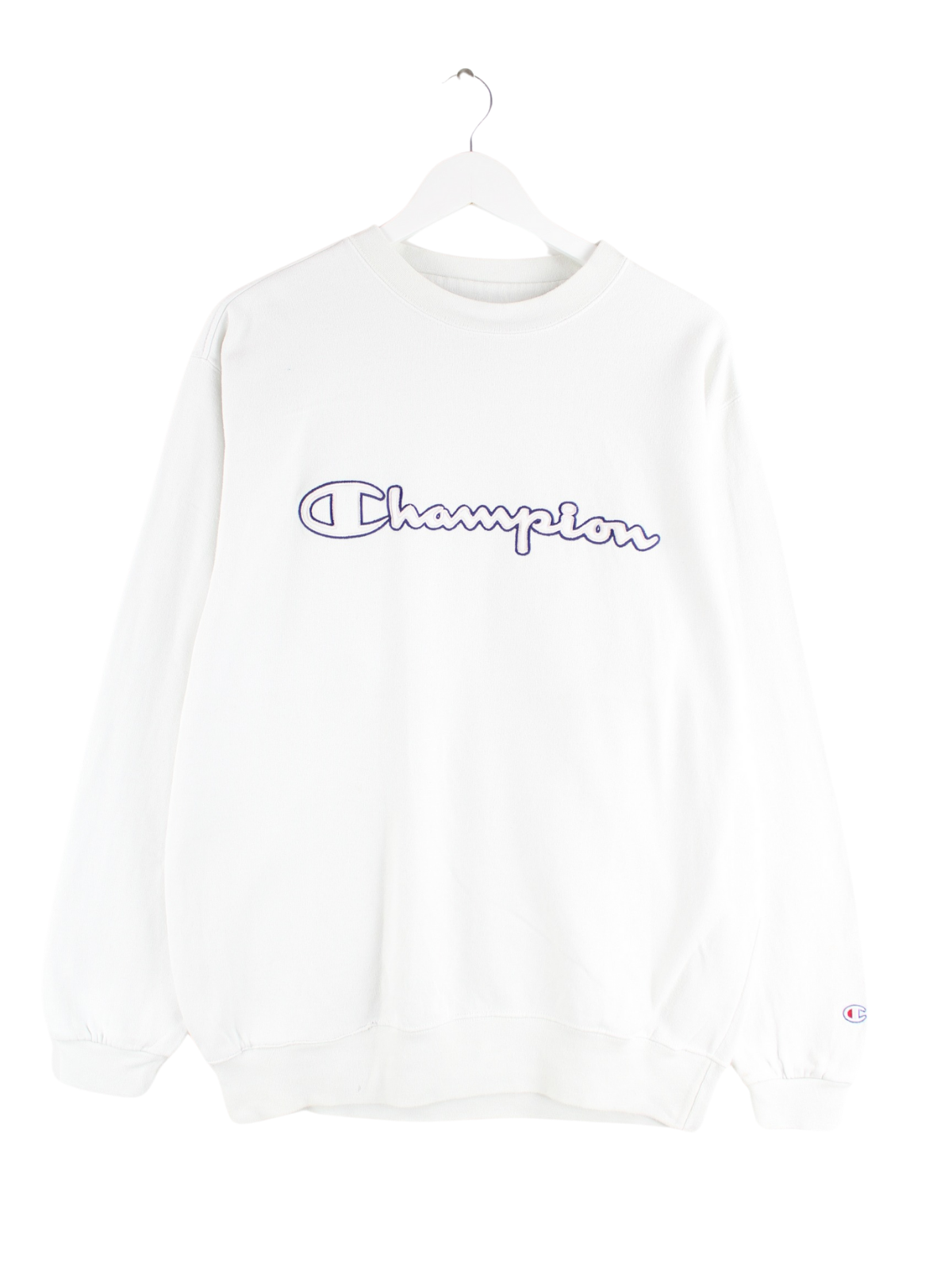 Weißer Sweater mit Stickereien von Champion in Größe L. Er ist aus einer Baumwollmischung und in gutem Zustand zu bekommen.