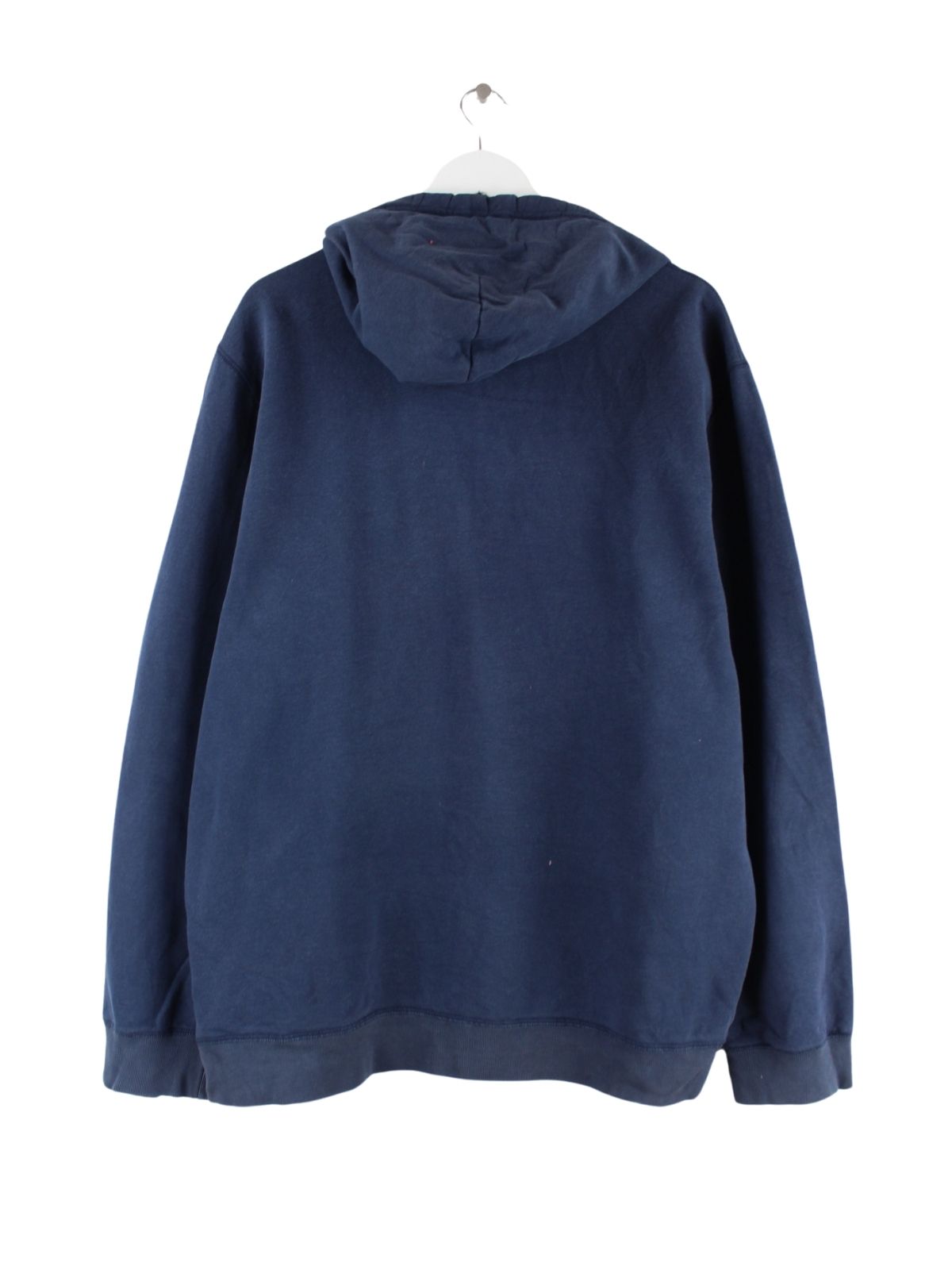 Blauer Hoodie mit gestickten Motiven und Reißverschluß von Champion in Größe 3XL. Er ist aus einer Baumwollmischung gemacht und in sehr gutem Zustand vorrätig.