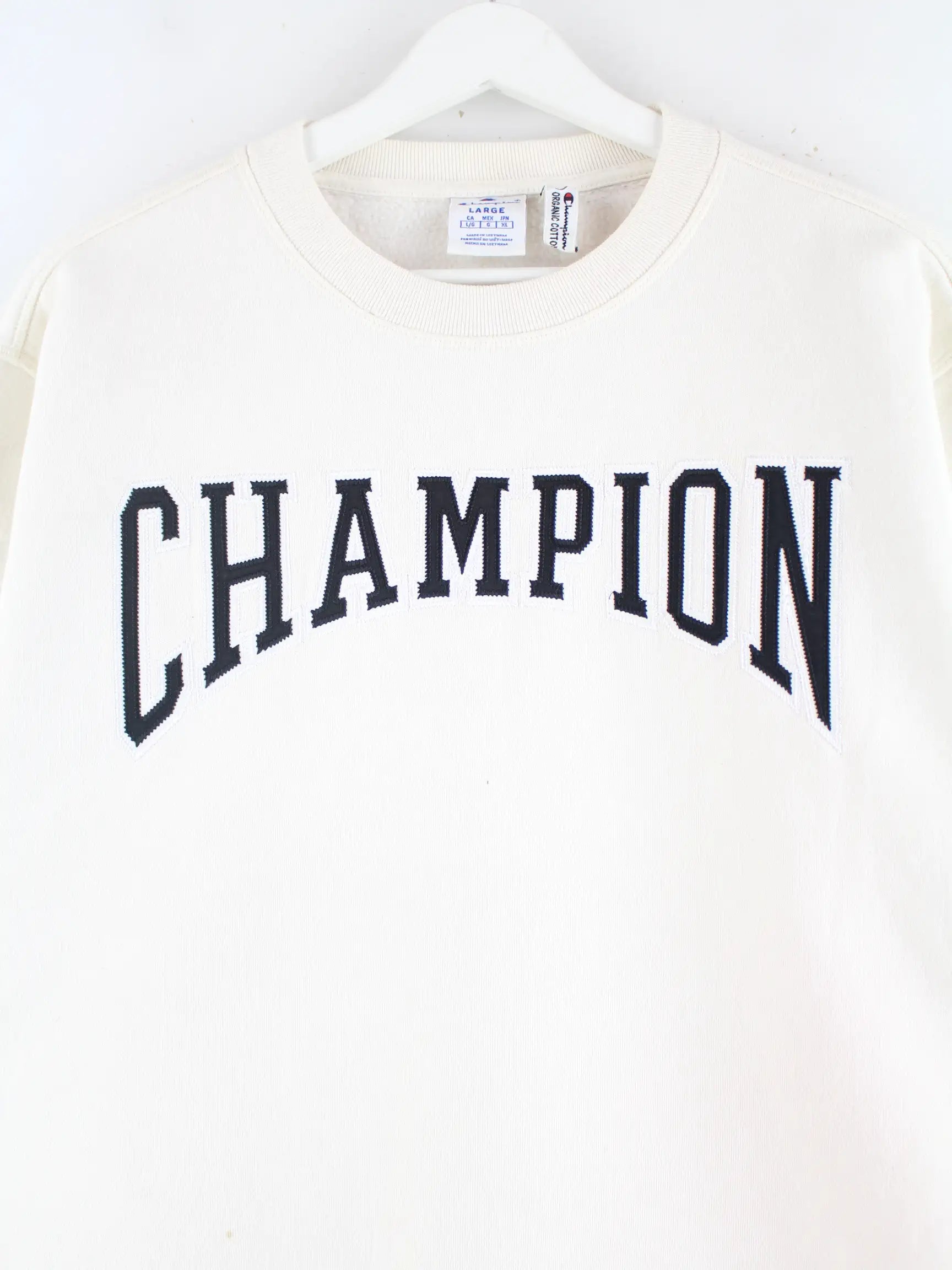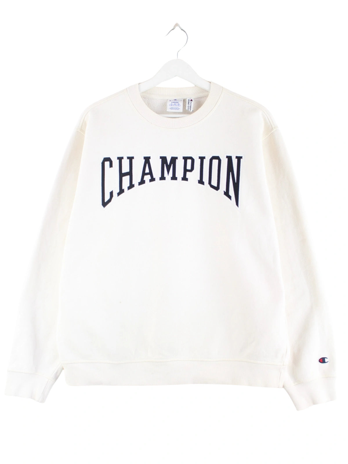 Sweater des Labels Champion mit Stick in Größe L. Er ist aus einer Baumwollmischung und in Weiß in Stock.