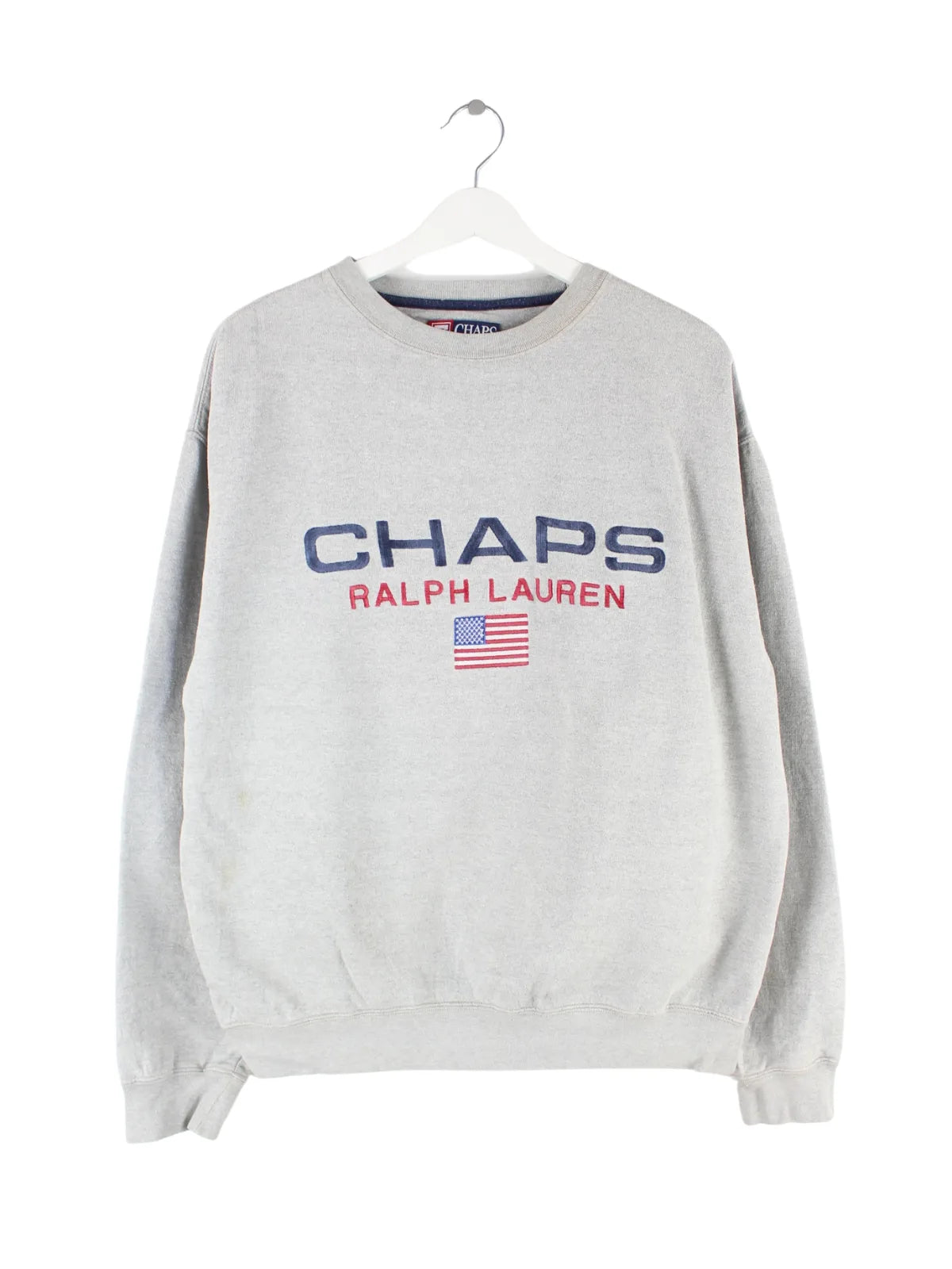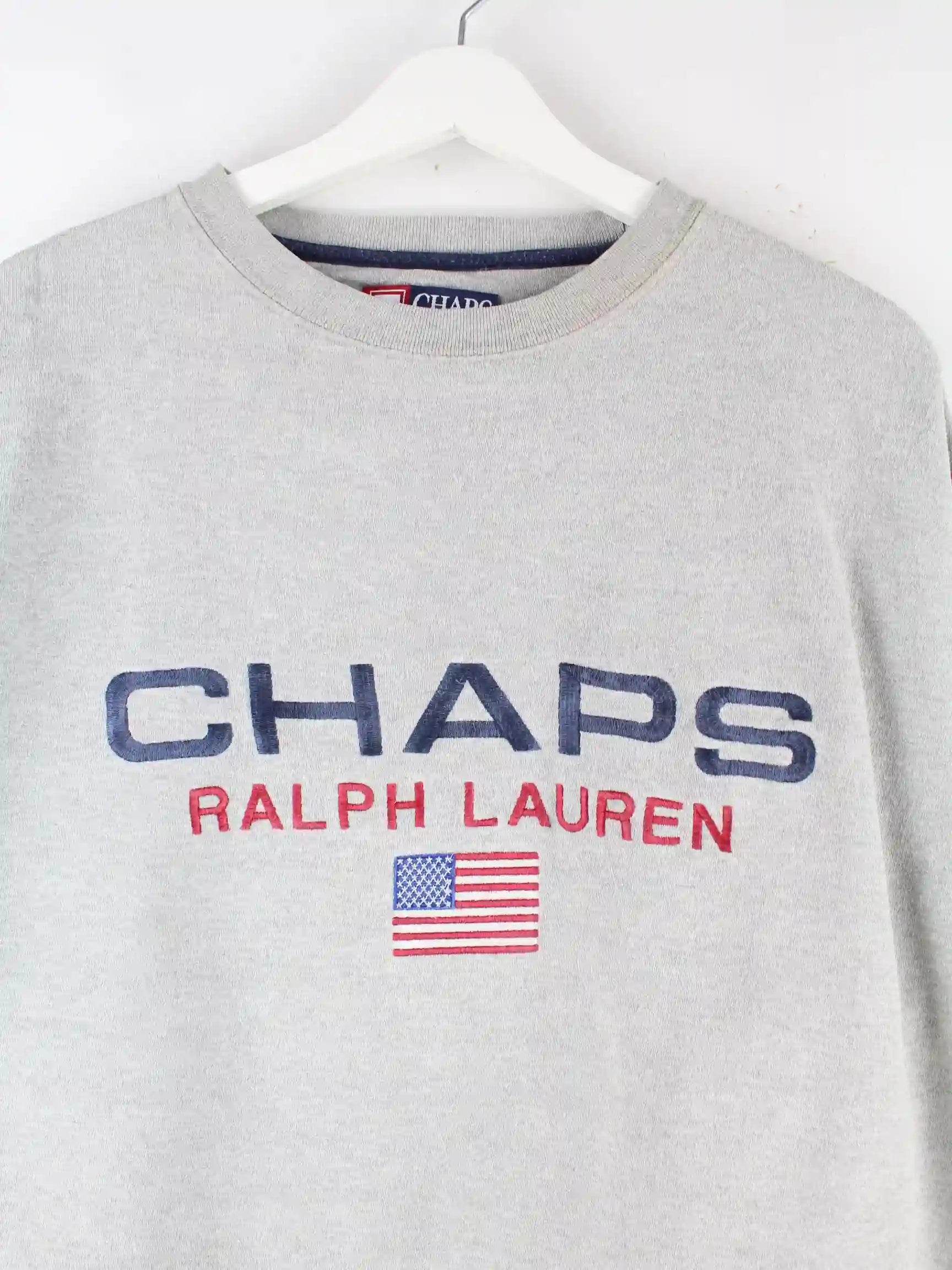 Grauer Sweater mit gesticktem Logo von Chaps by Ralph Lauren in Größe S. Er ist aus einer Baumwollmischung produziert. Den Zustand würden wir als 'In Ordnung' bezeichnen (vergl. Bilder).