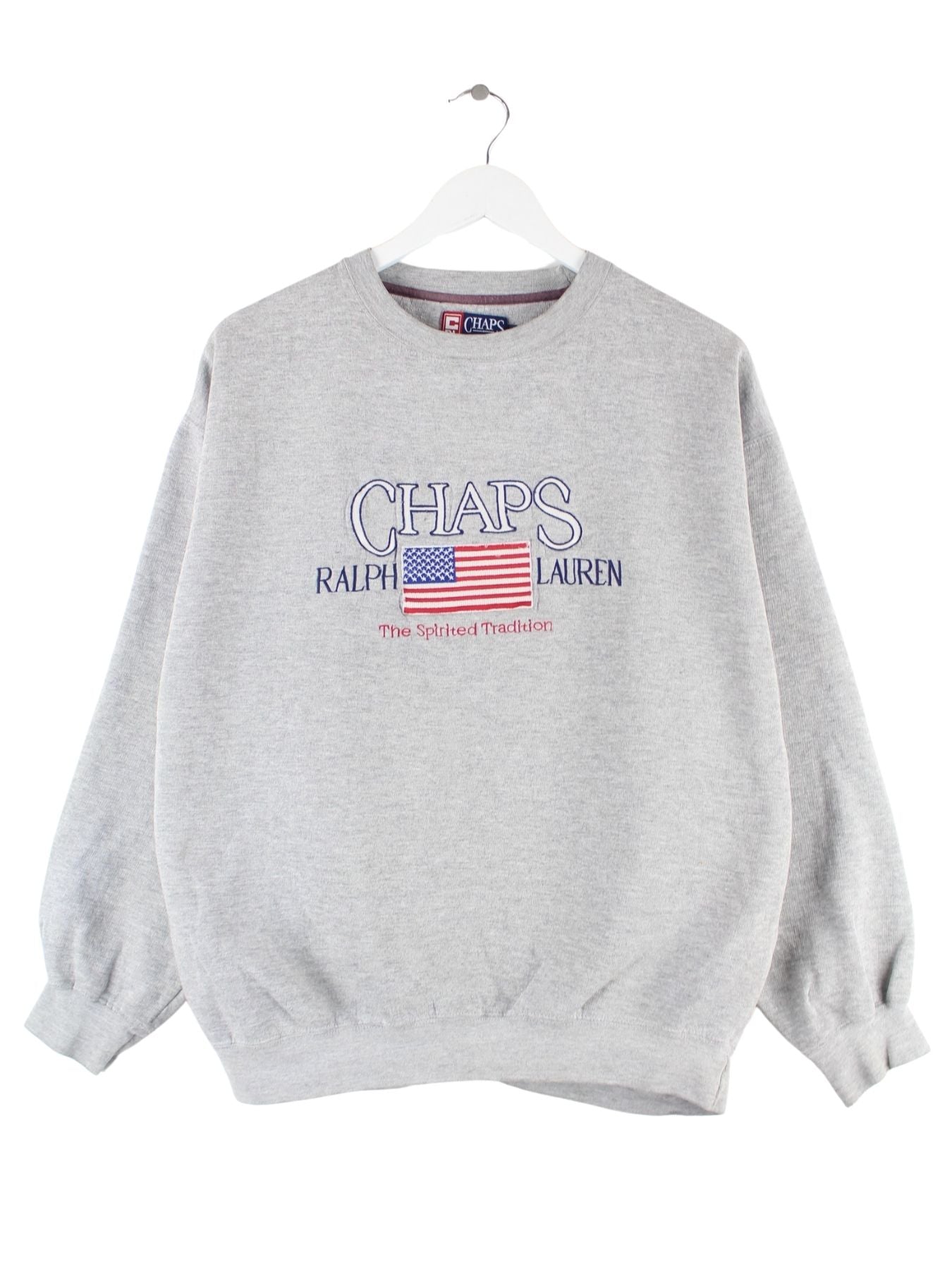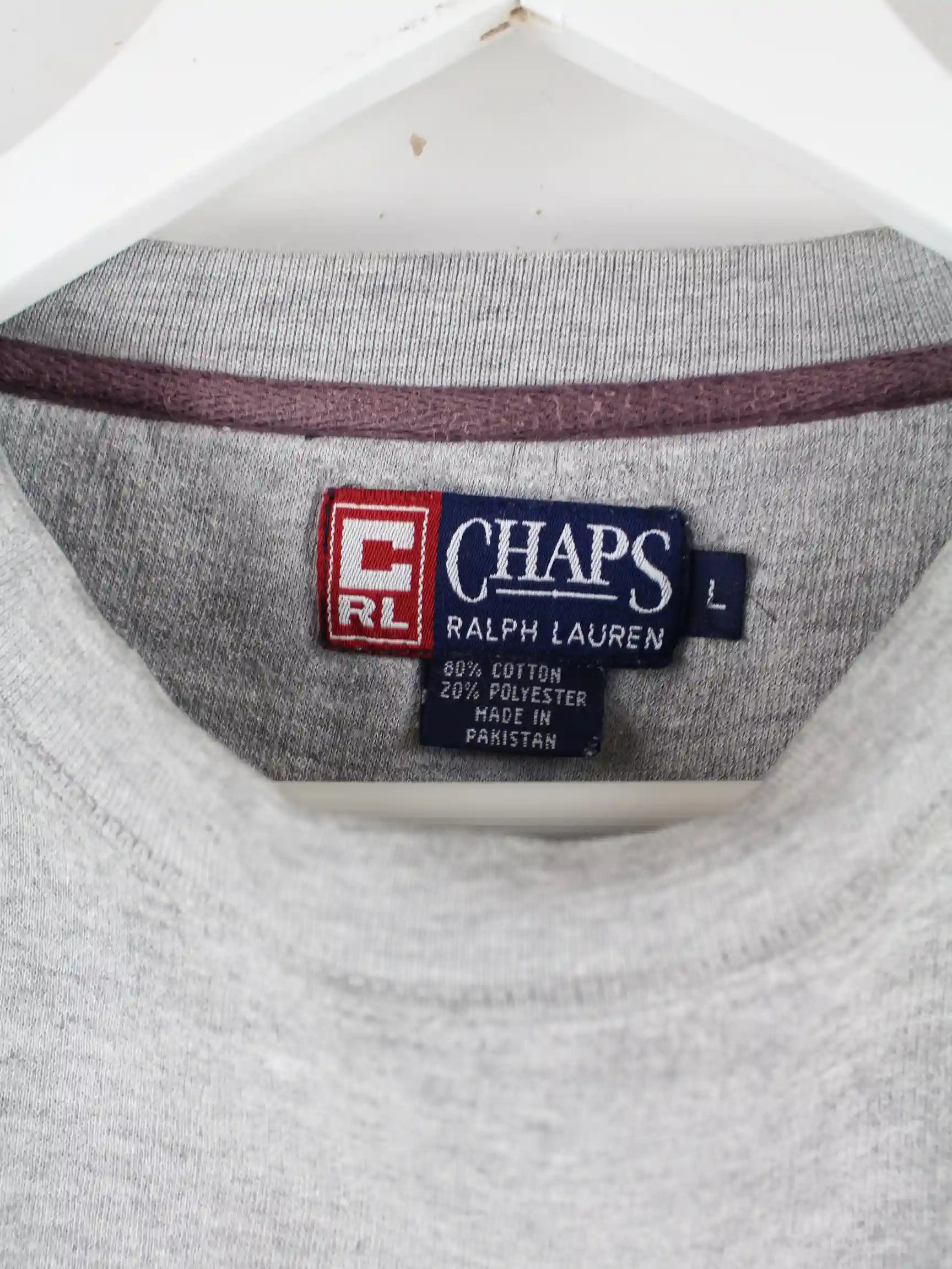 Grauer Sweater mit Stick der Marke Chaps by Ralph Lauren aus den 90'ern in Größe L. Er ist aus einer Baumwollmischung angefertigt und in gutem Zustand zu bekommen.