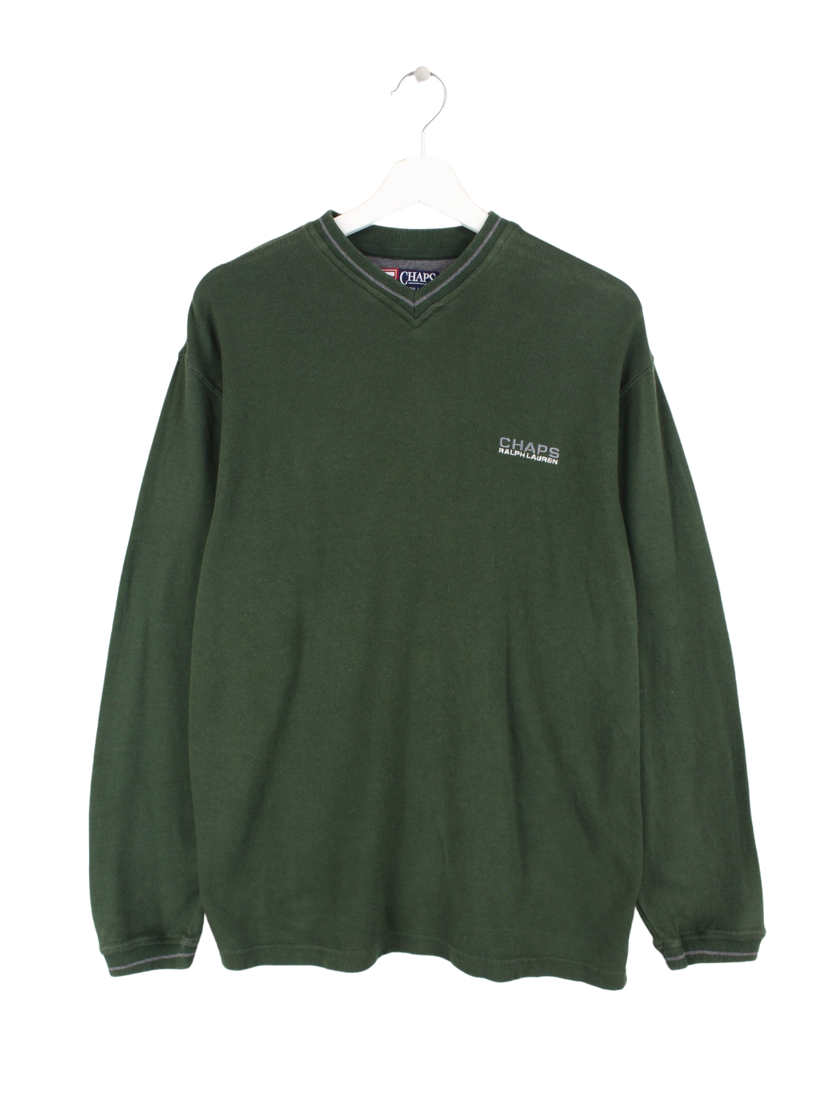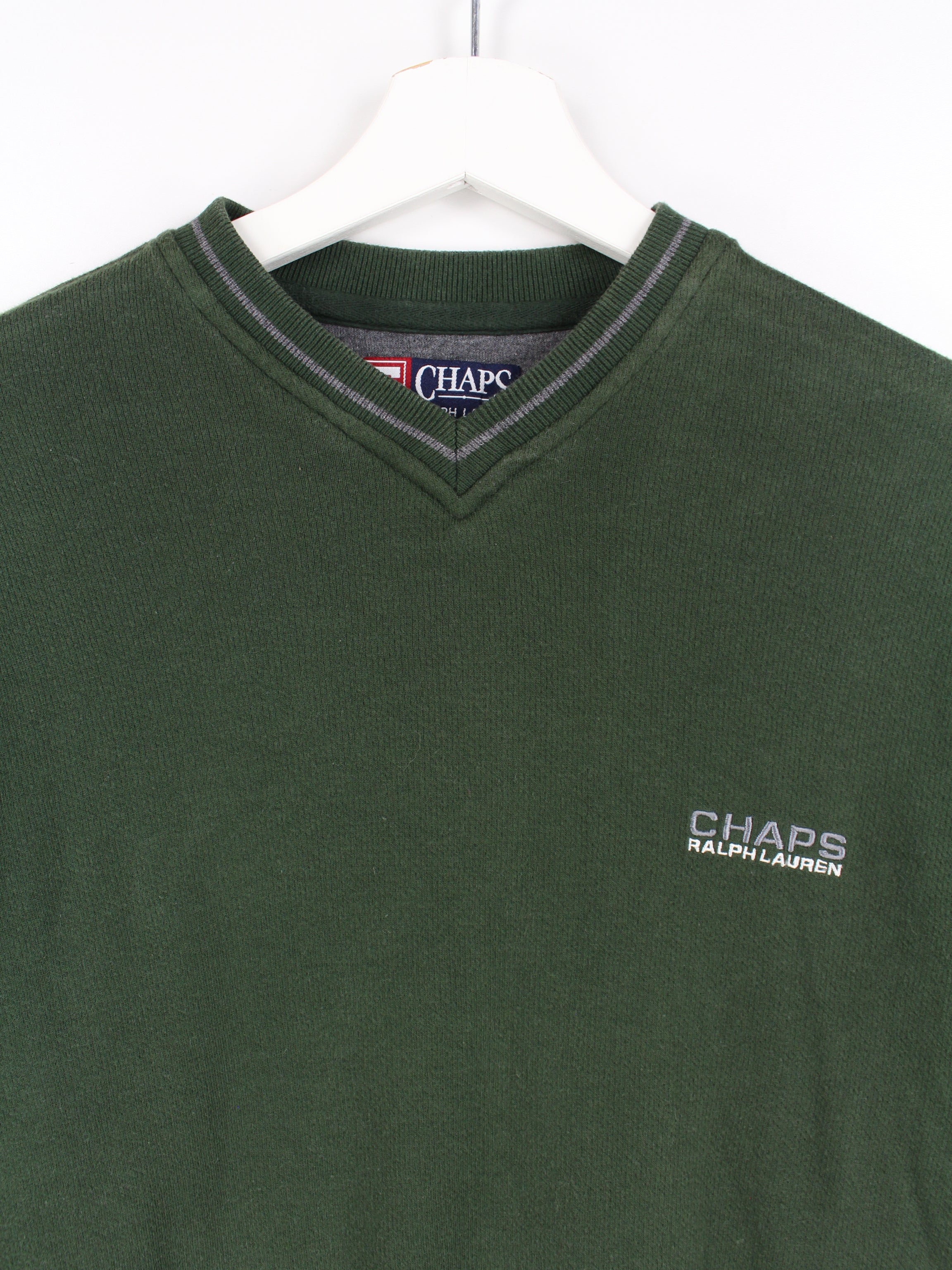 Green V-neck sweater from Chaps, with embroidered logo on the chest.