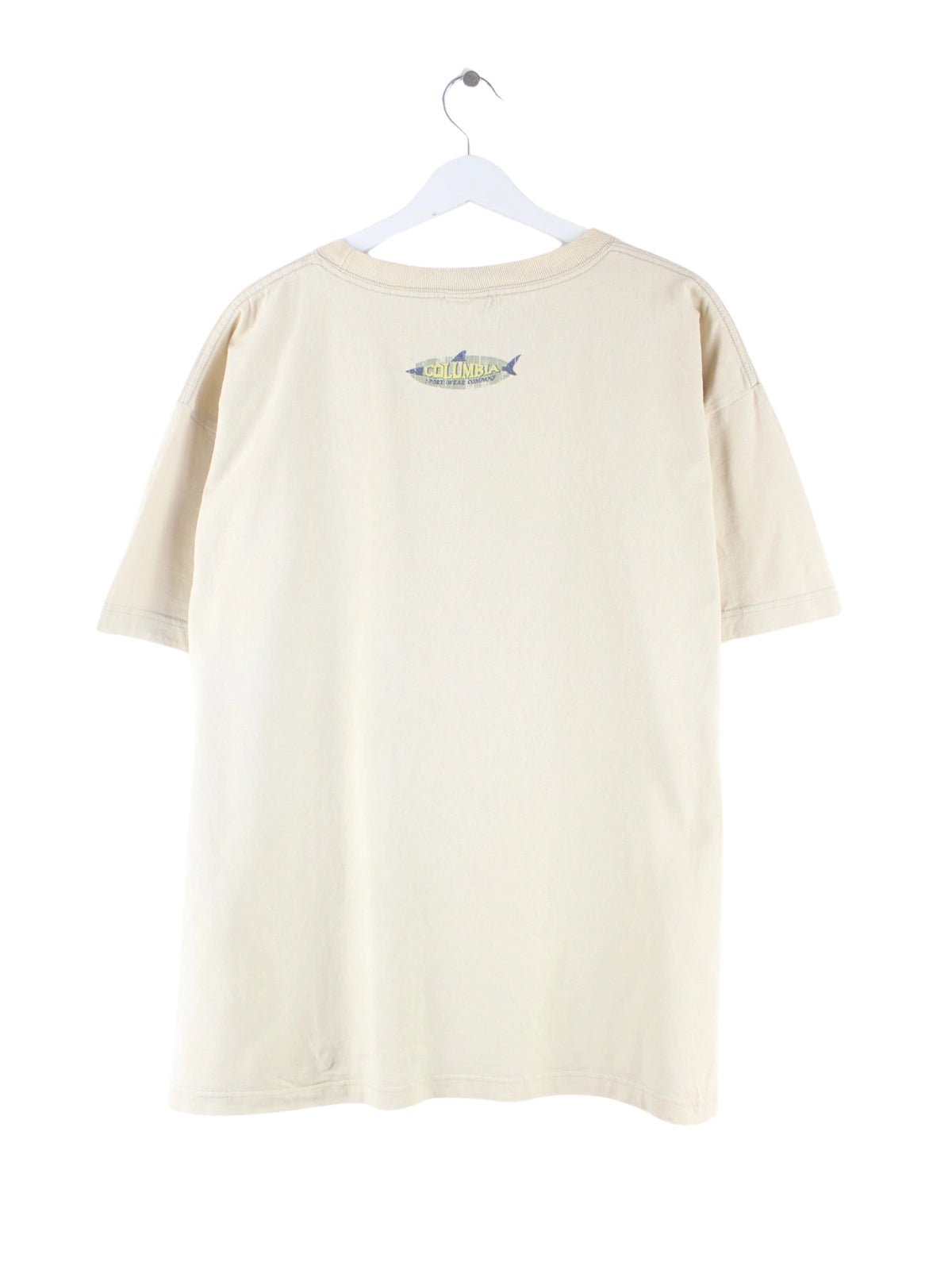 Beigefarbenes T-Shirt des Labels Columbia in Größe XL. Es ist aus einer Baumwollmischung hergestellt und in gutem Zustand im Bestand. Mit chiquem Shack Print.