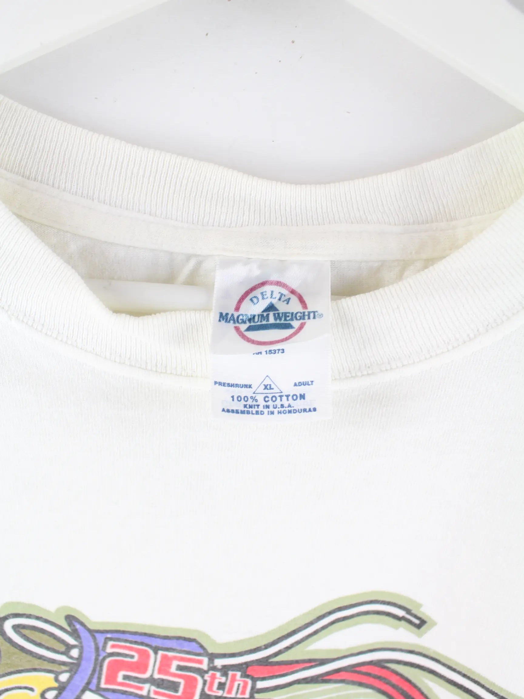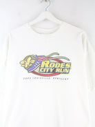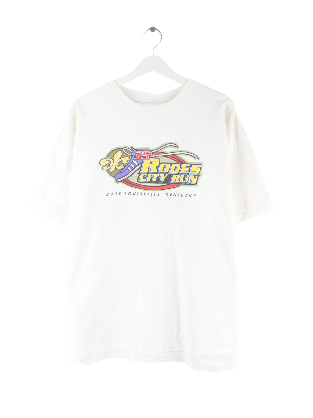 Weißes T-Shirt vom Brand Delta in Größe XL. Es ist aus einer Baumwollmischung gefertigt und in gutem Zustand auf Lager. Mit seltenem Run Print.