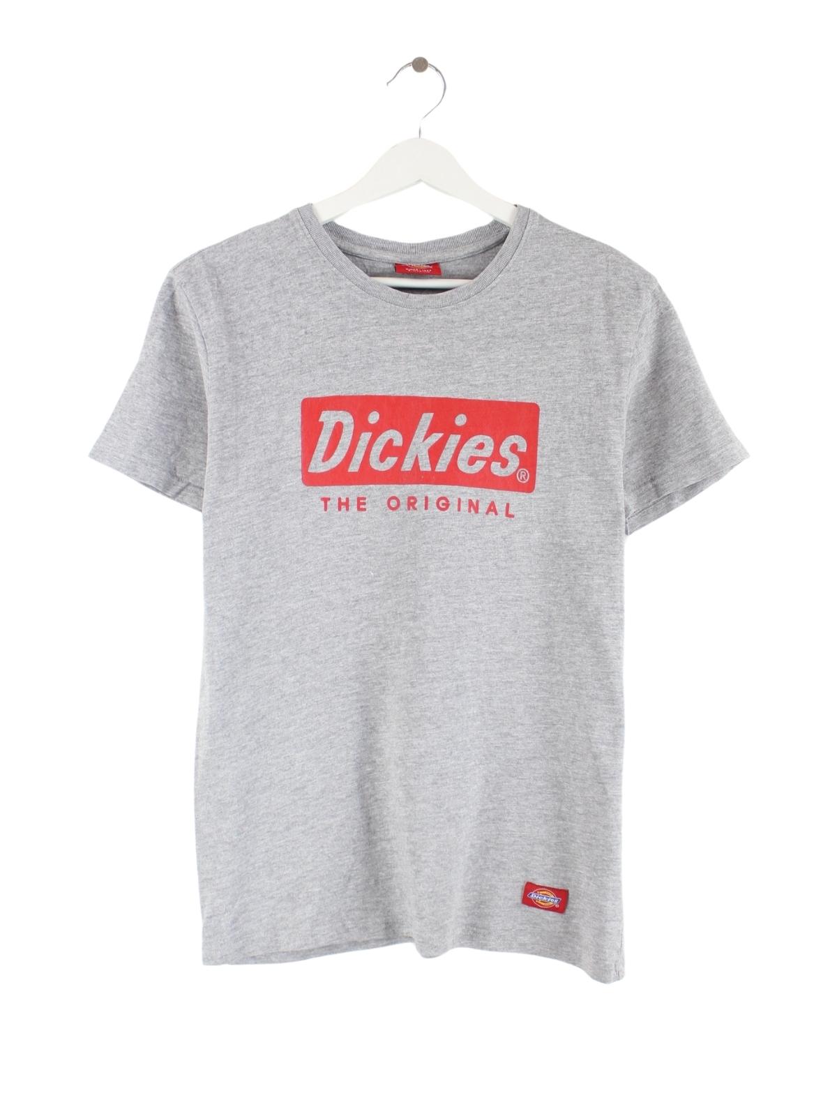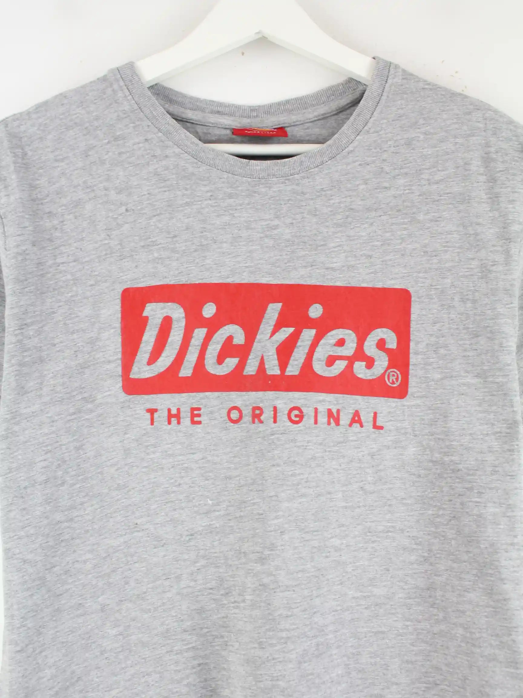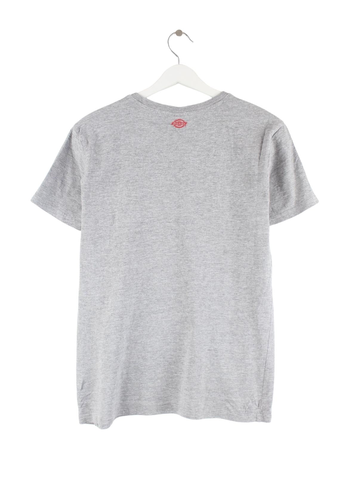 Graues T-Shirt der Marke Dickies in Größe M. Es ist aus Baumwolle gefertigt und in sehr gutem Zustand auf Lager. Mit tollem 00s Print.