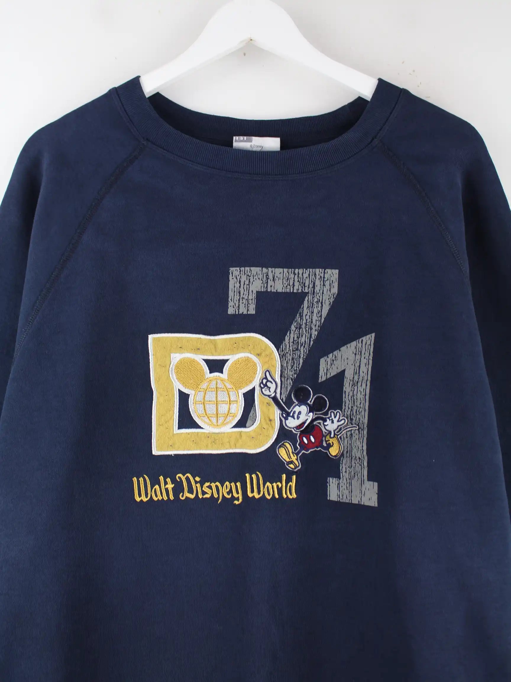 Sweater des Labels Disney mit gesticktem Logo in Größe XL aus den 90'ern. Er ist aus einer Baumwollmischung produziert und in Blau auf Lager.