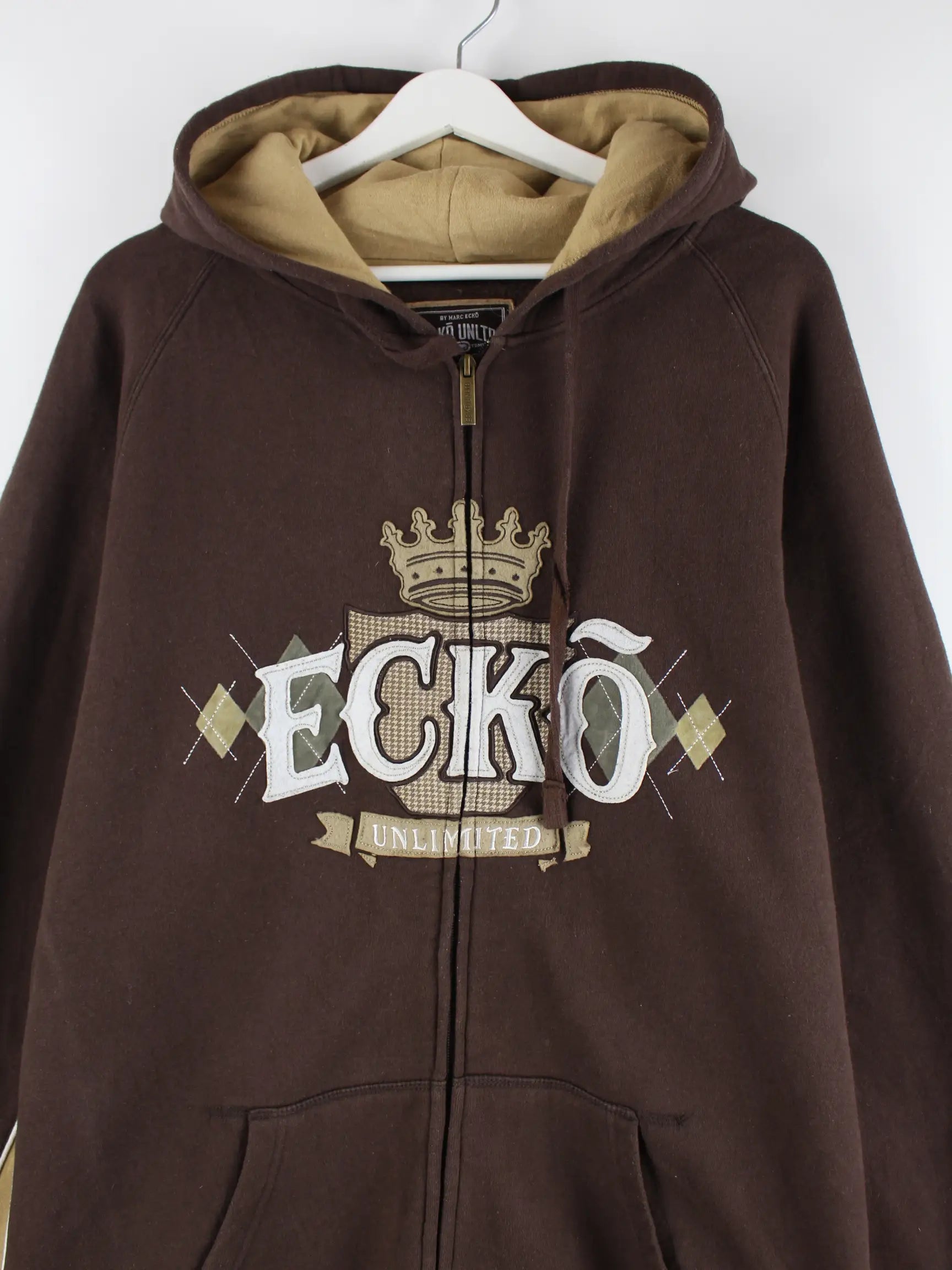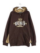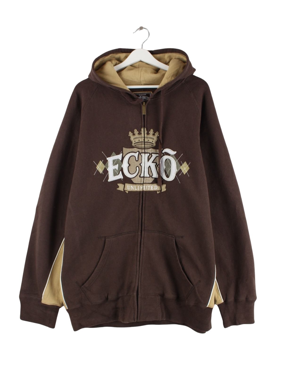 Hoodie vom Label Ecko mit durchgehendem Reißverschluß in Größe XXL aus Anfang der 2000'er. Er ist aus einer Baumwollmischung und in Braun lieferbar.