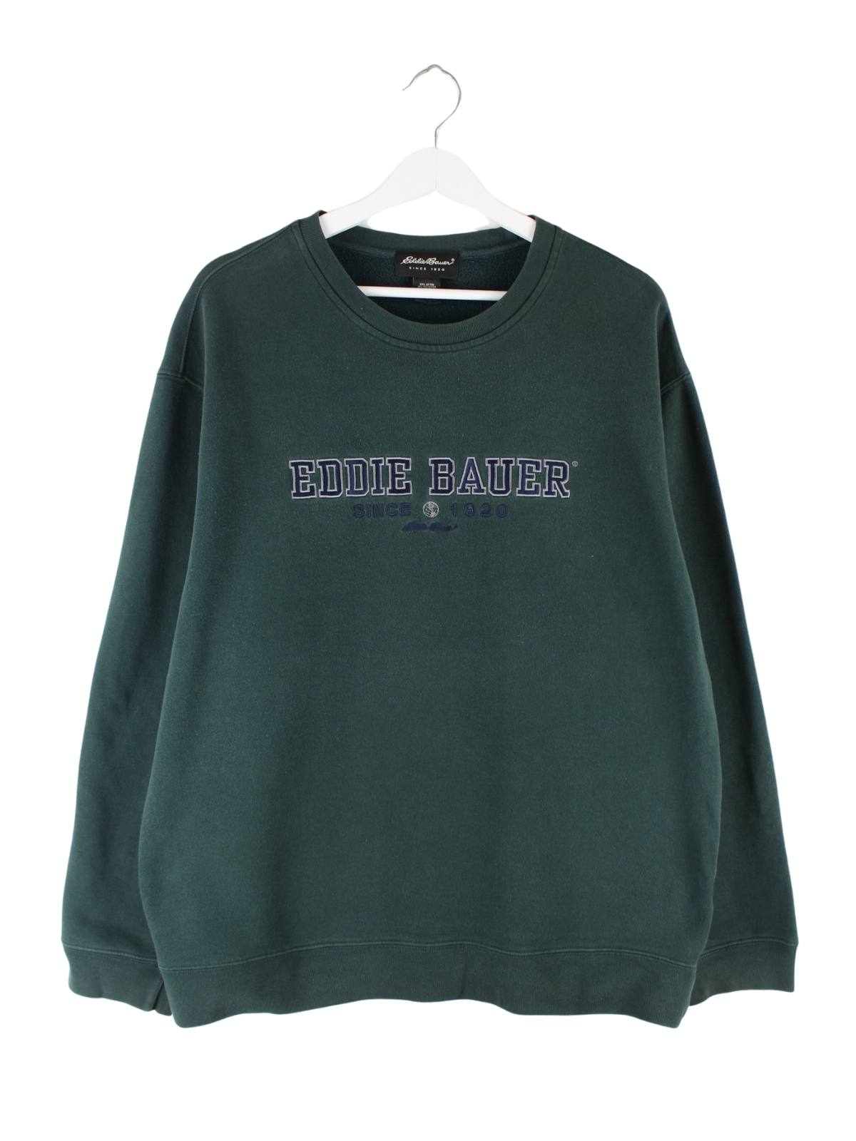 Grüner Sweater mit gesticktem Logo aus dem Hause Eddie Bauer in Größe L. Er ist aus Baumwolle gefertigt und in sehr gutem Zustand bei uns vorrätig.