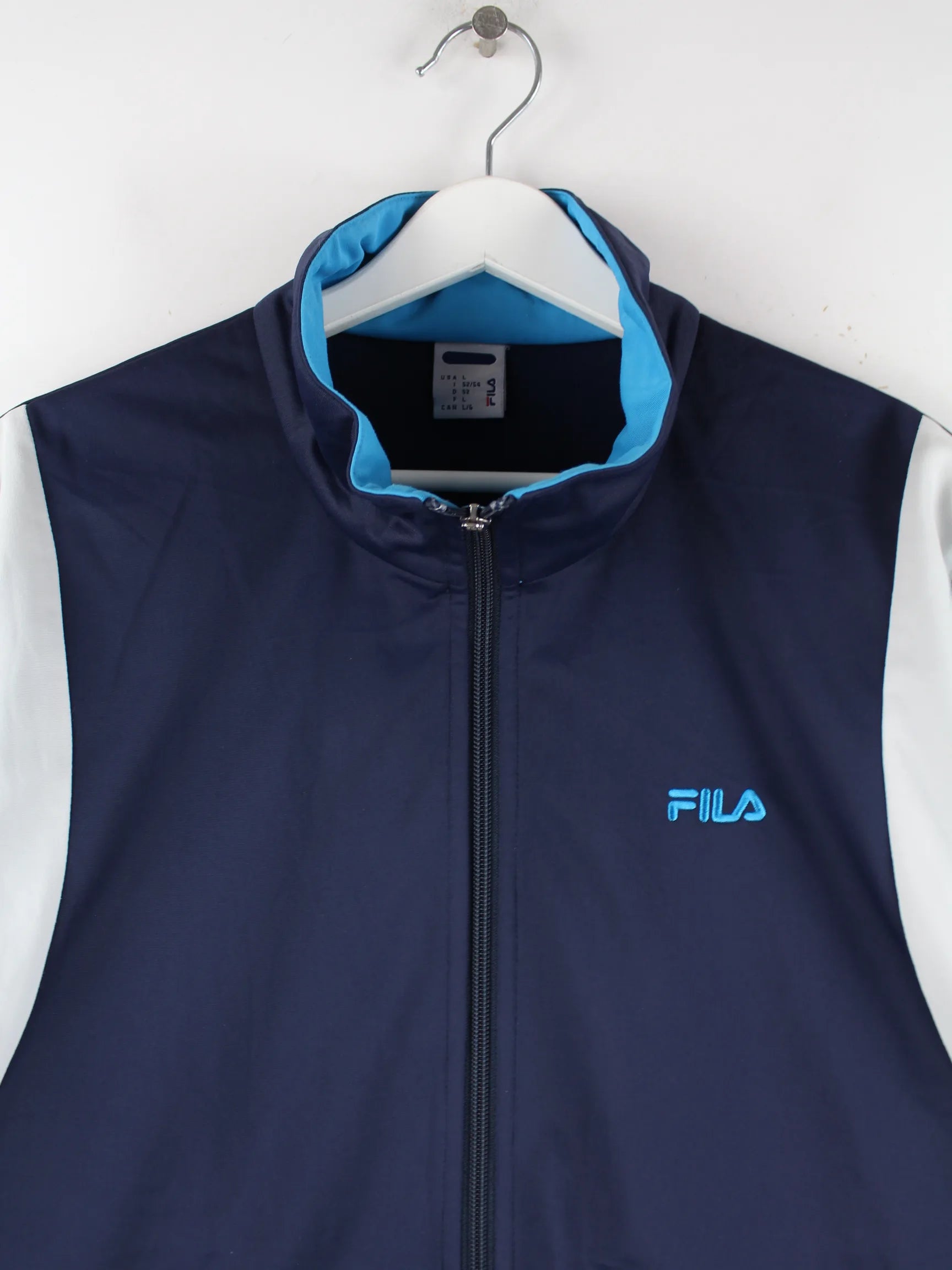 Blaue Trainingsjacke vom Brand Fila in Größe L. Sie ist aus Synthetik produziert und in sehr gutem Zustand im Bestand.