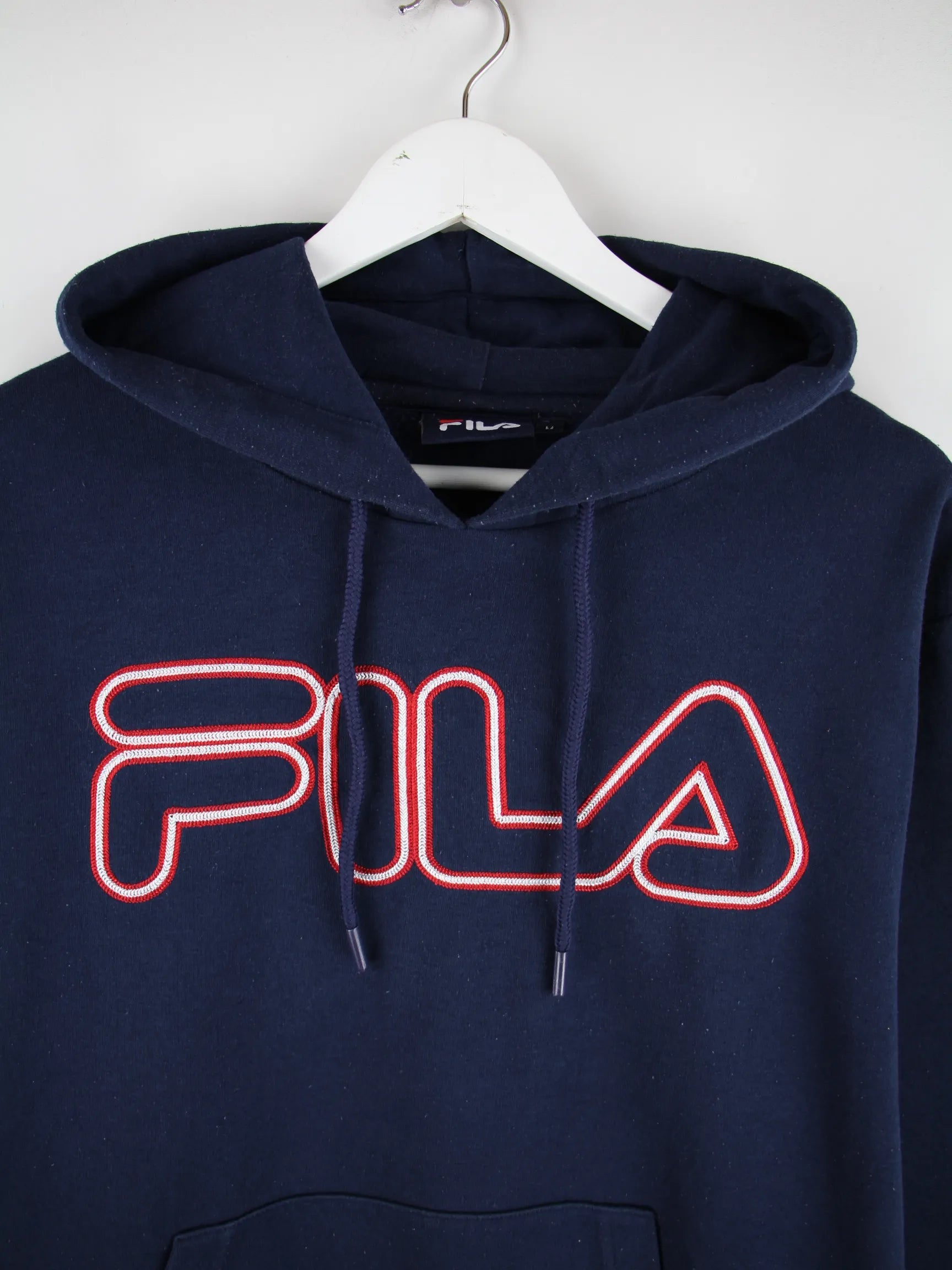 Hoodie der Marke Fila in Größe M. Er ist aus einer Baumwollmischung hergestellt und in Blau im Bestand.