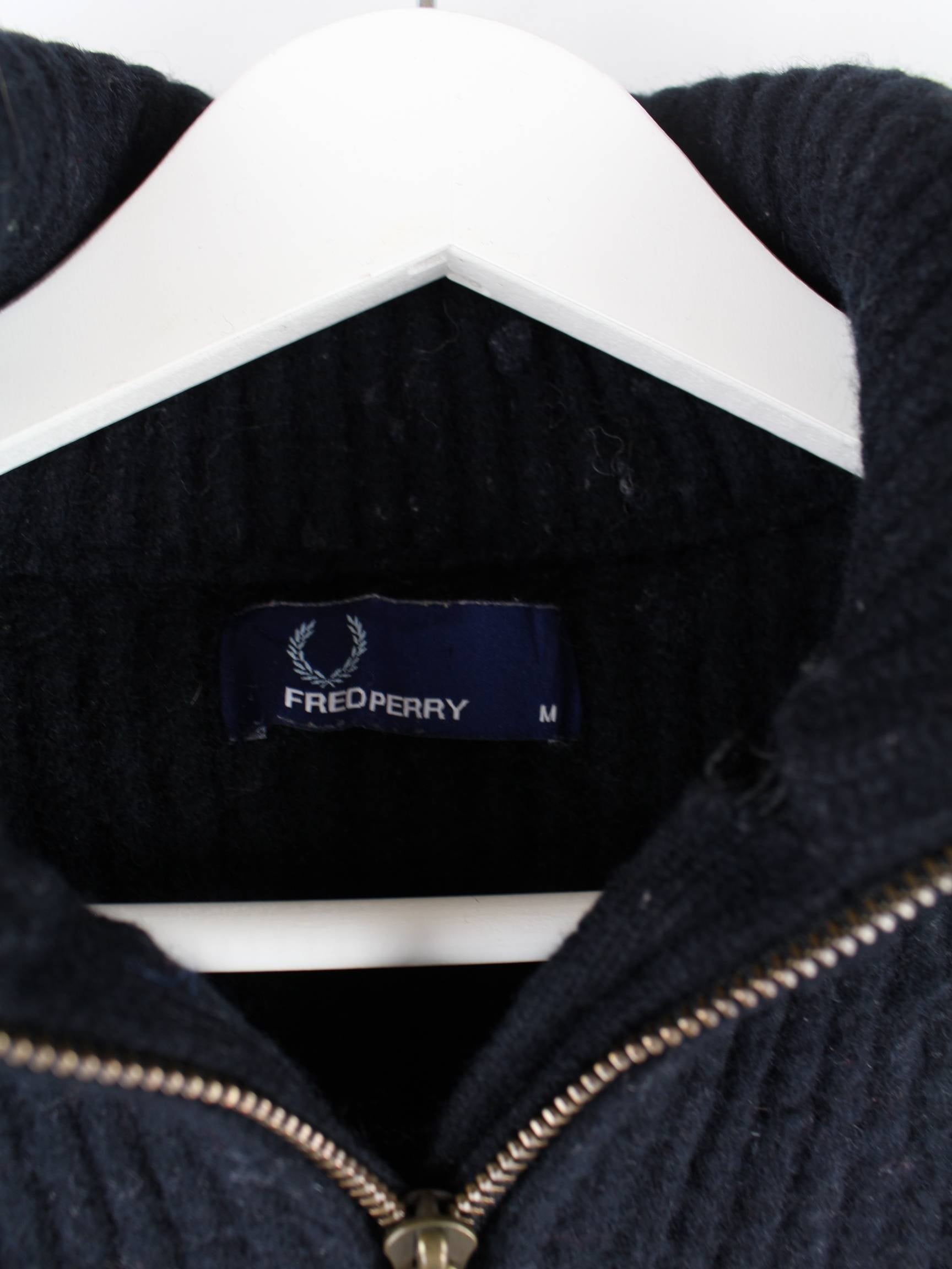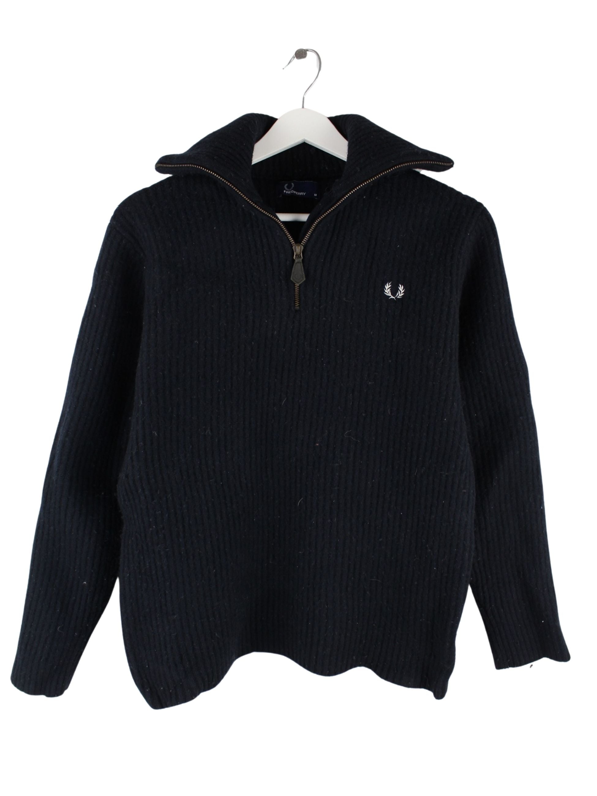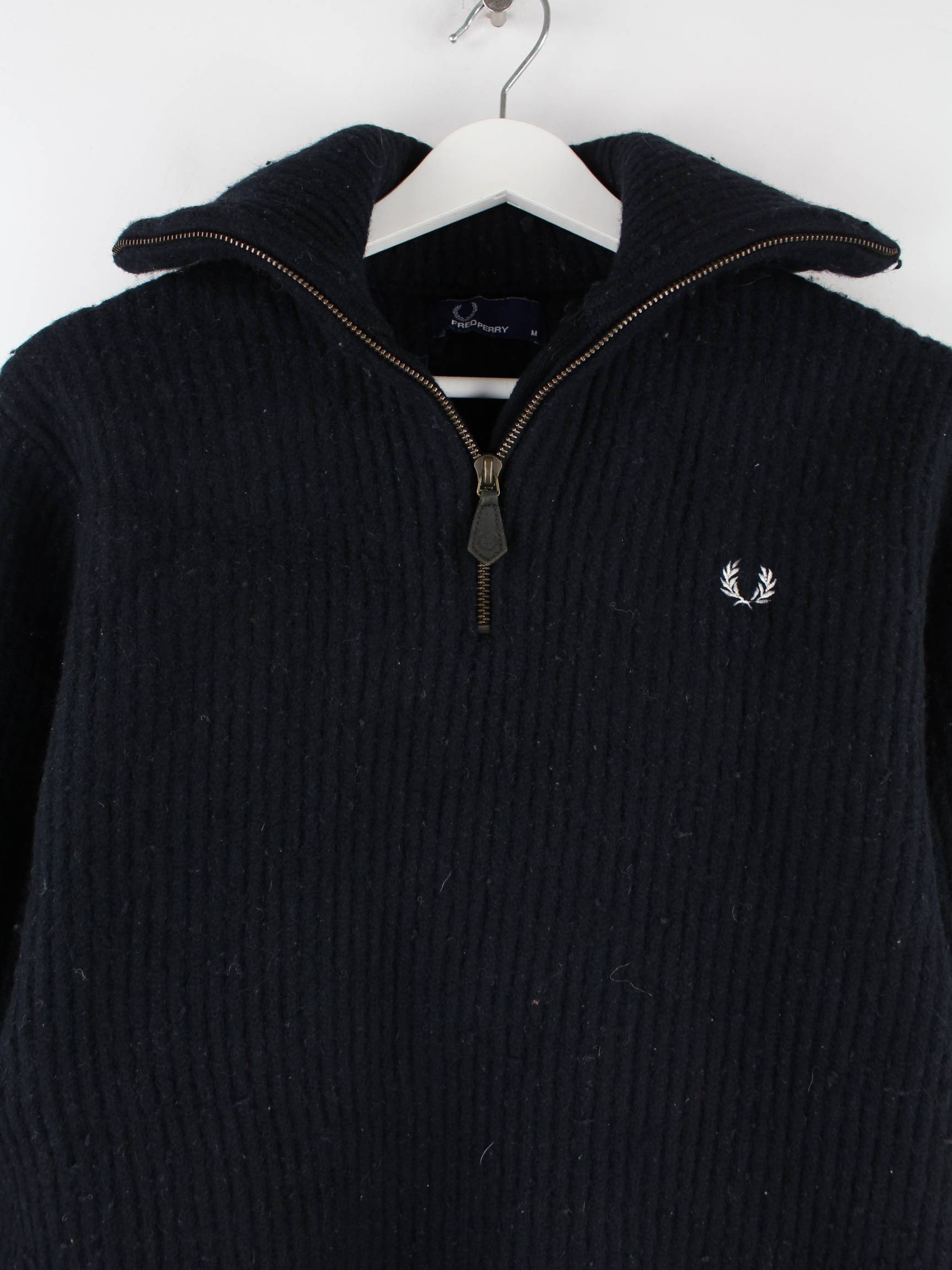Pullover vom Label Fred Perry mit halbem Reißverschluß in Größe M. Er ist aus einer Wollmischung gemacht und in Schwarz vorrätig.