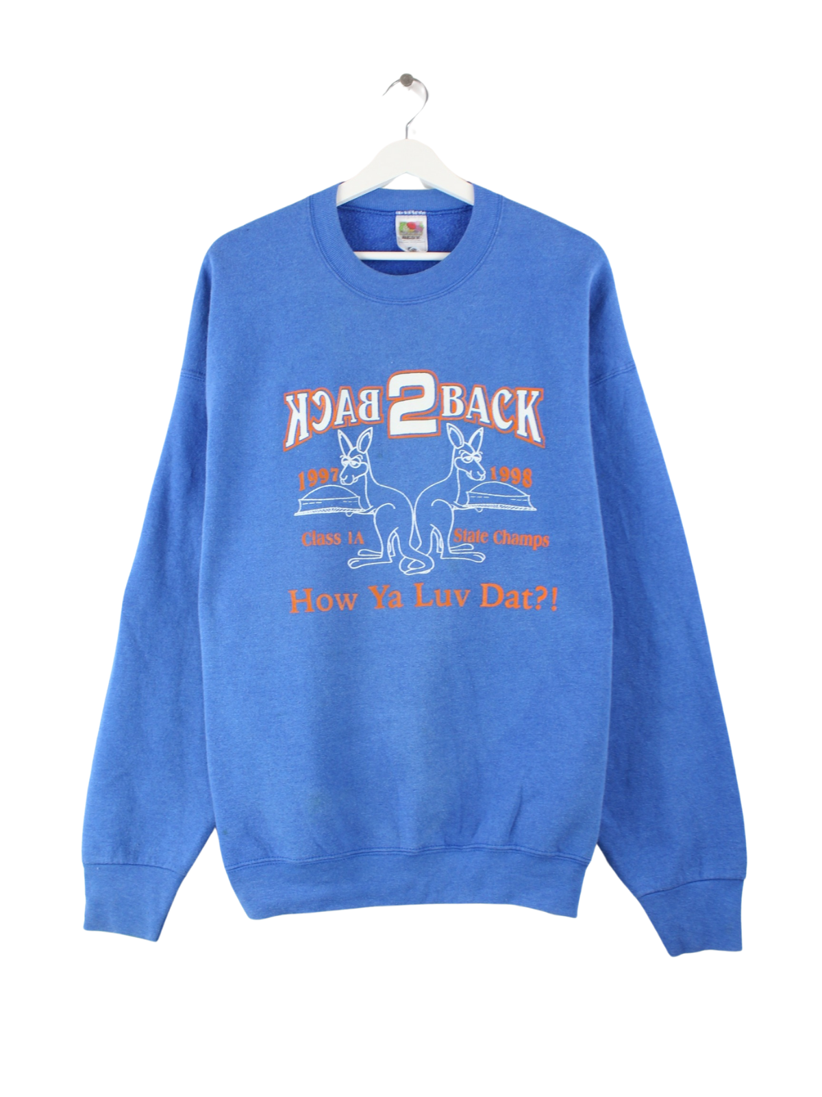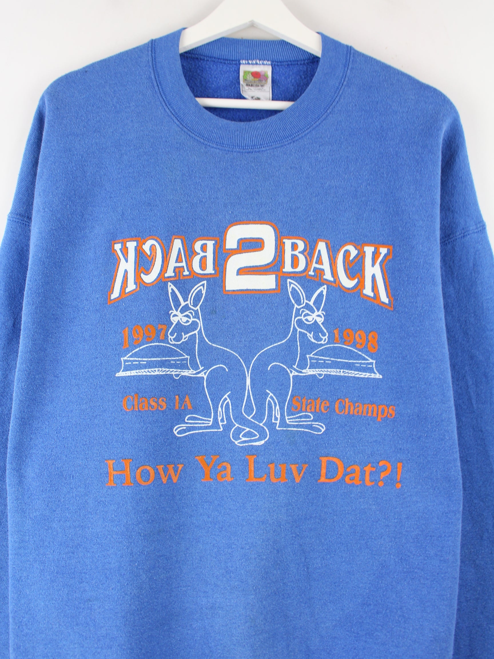 Fruit of the Loom 1997 Vintage Back To Back Print Sweater Blue XL