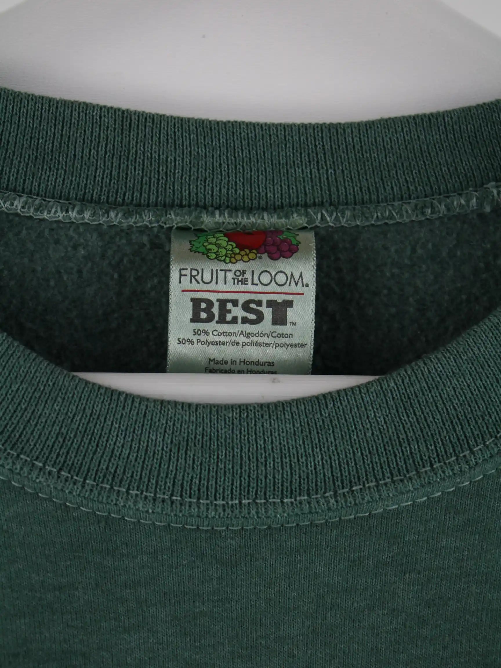 Sweater aus dem Hause Fruit of the Loom in Größe XL aus den 90'ern. Er ist aus einer Baumwollmischung angefertigt und in Grün lieferbar.