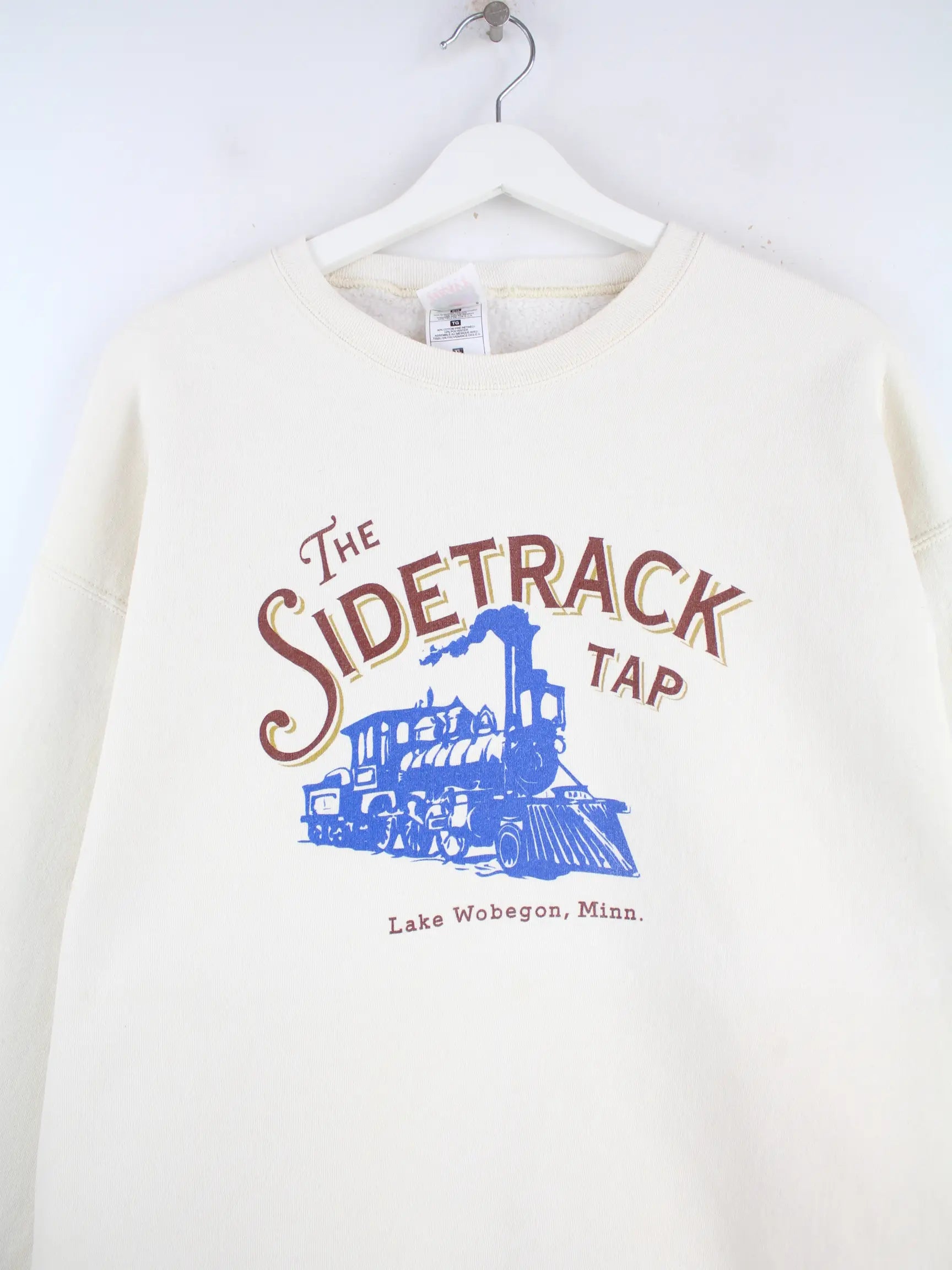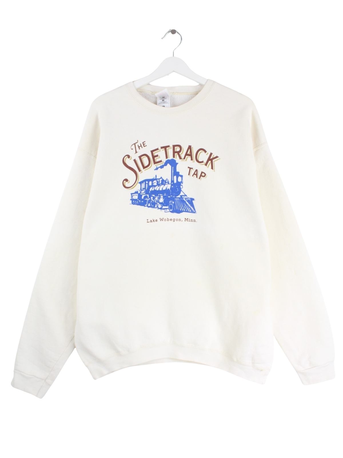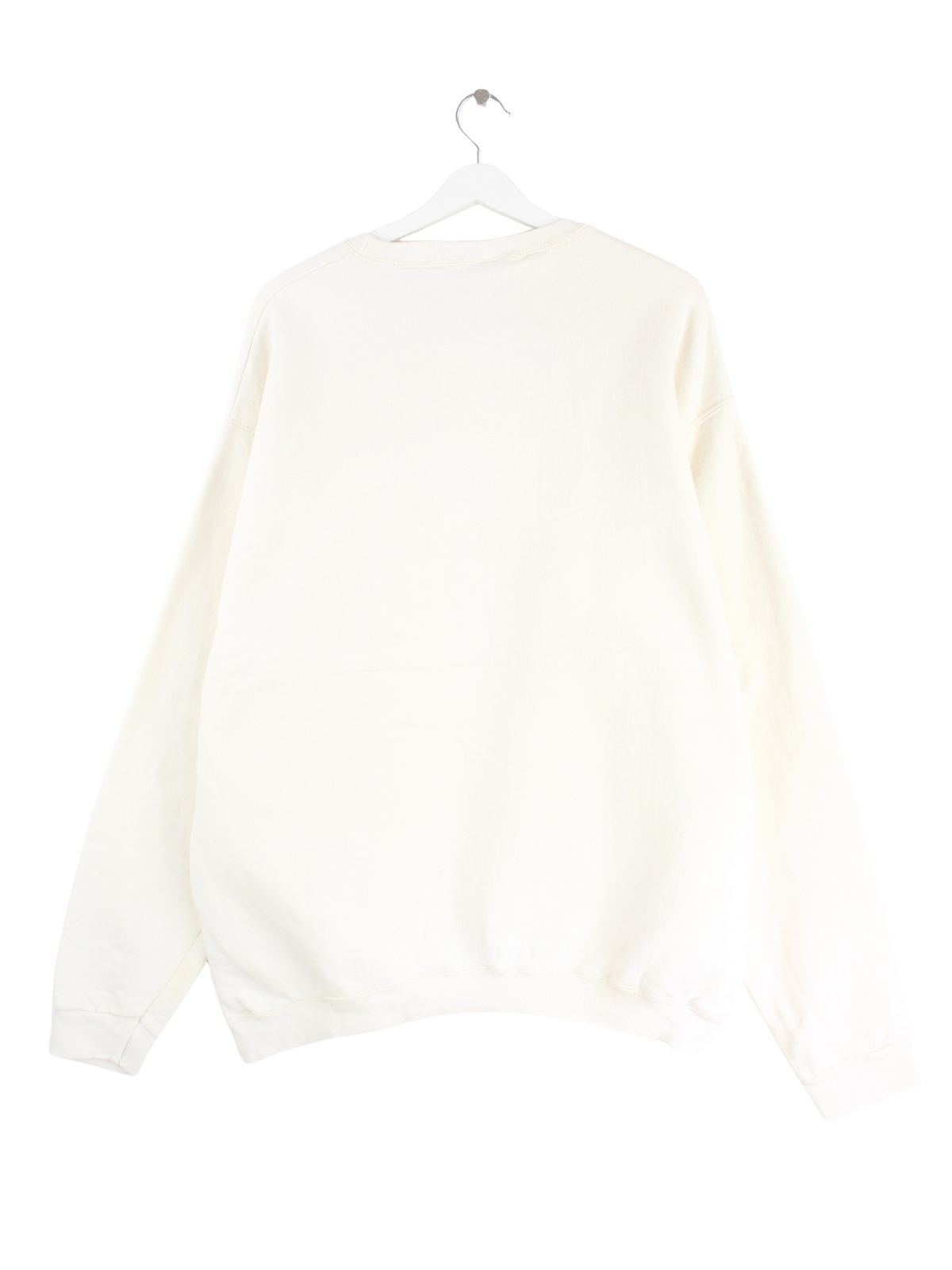 Sweater von Fruit of the Loom in Größe XL aus den 90'ern. Er ist aus einer Baumwollmischung angefertigt und in Beige zu haben. Mit chiquem Sidetrack Print.