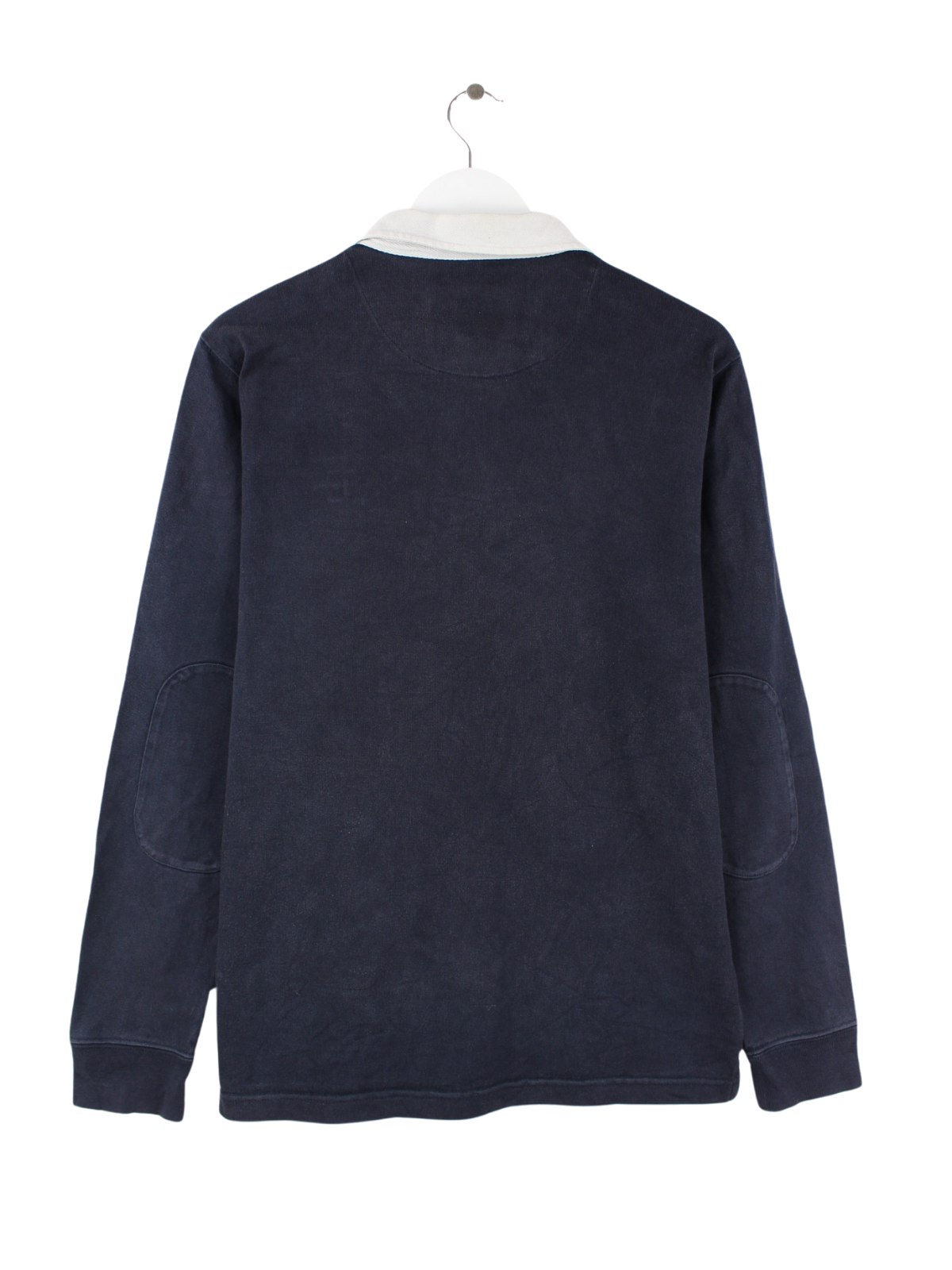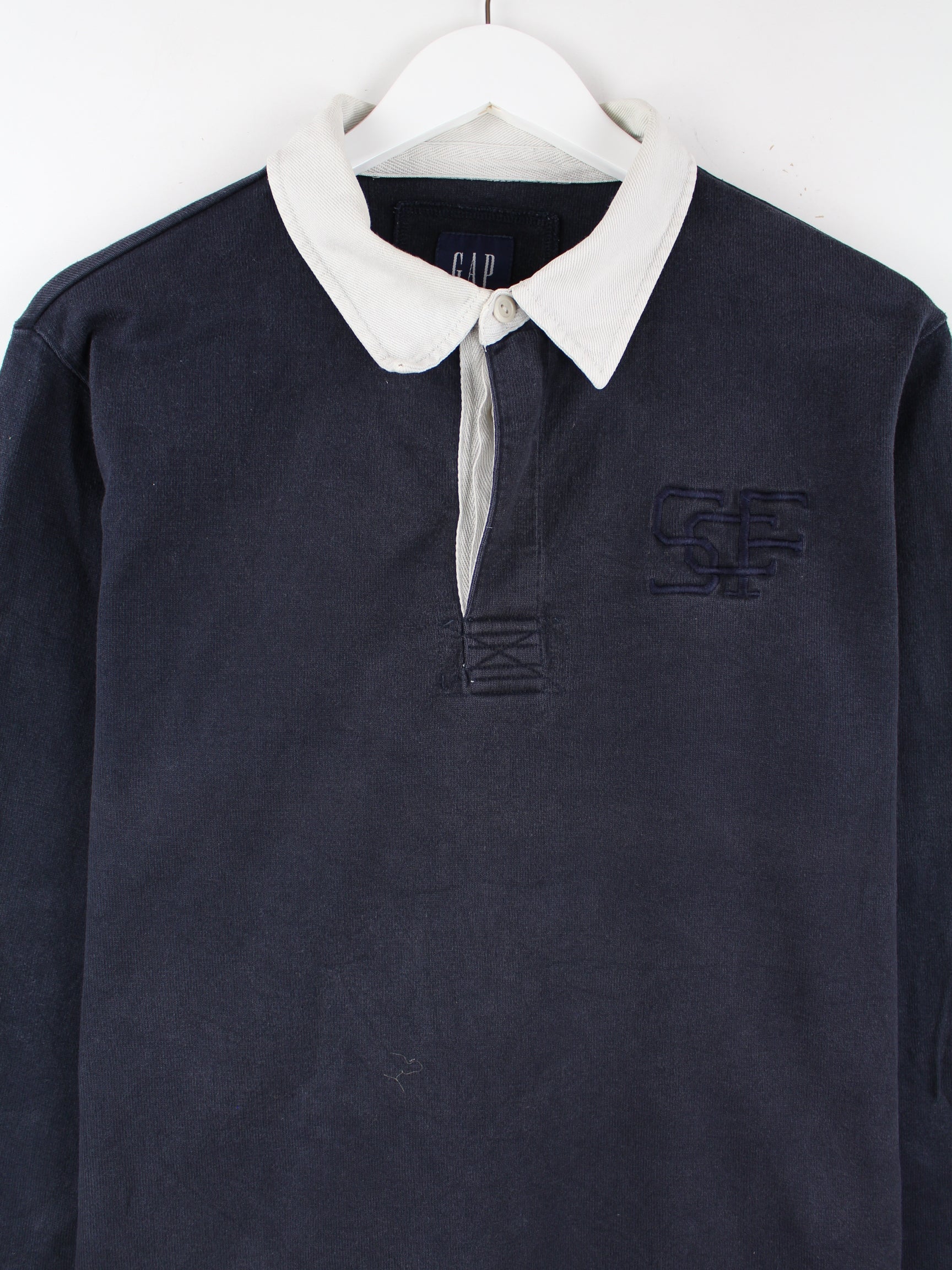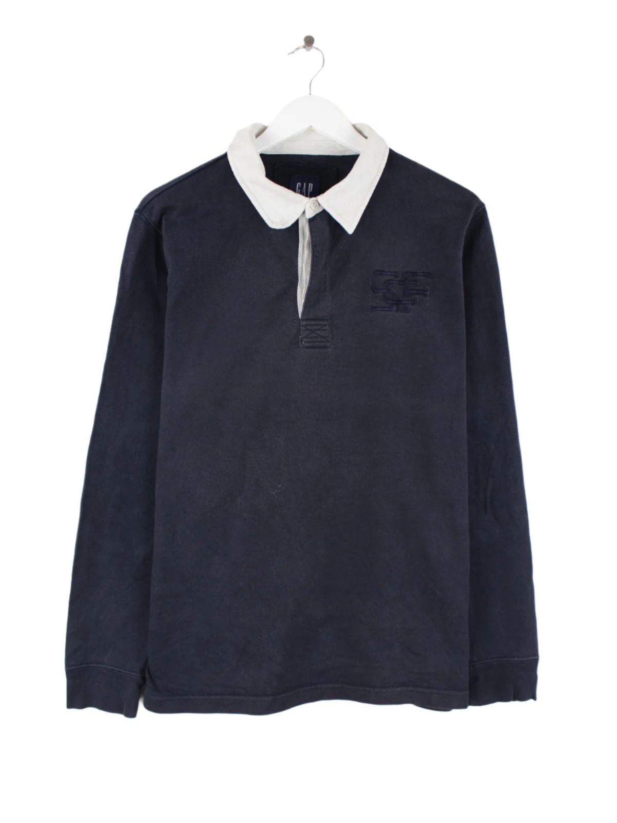 Blaues Poloshirt mit Stickereien des Labels GAP in Größe L. Es ist aus Baumwolle hergestellt und in gutem Zustand bei uns zu bekommen.