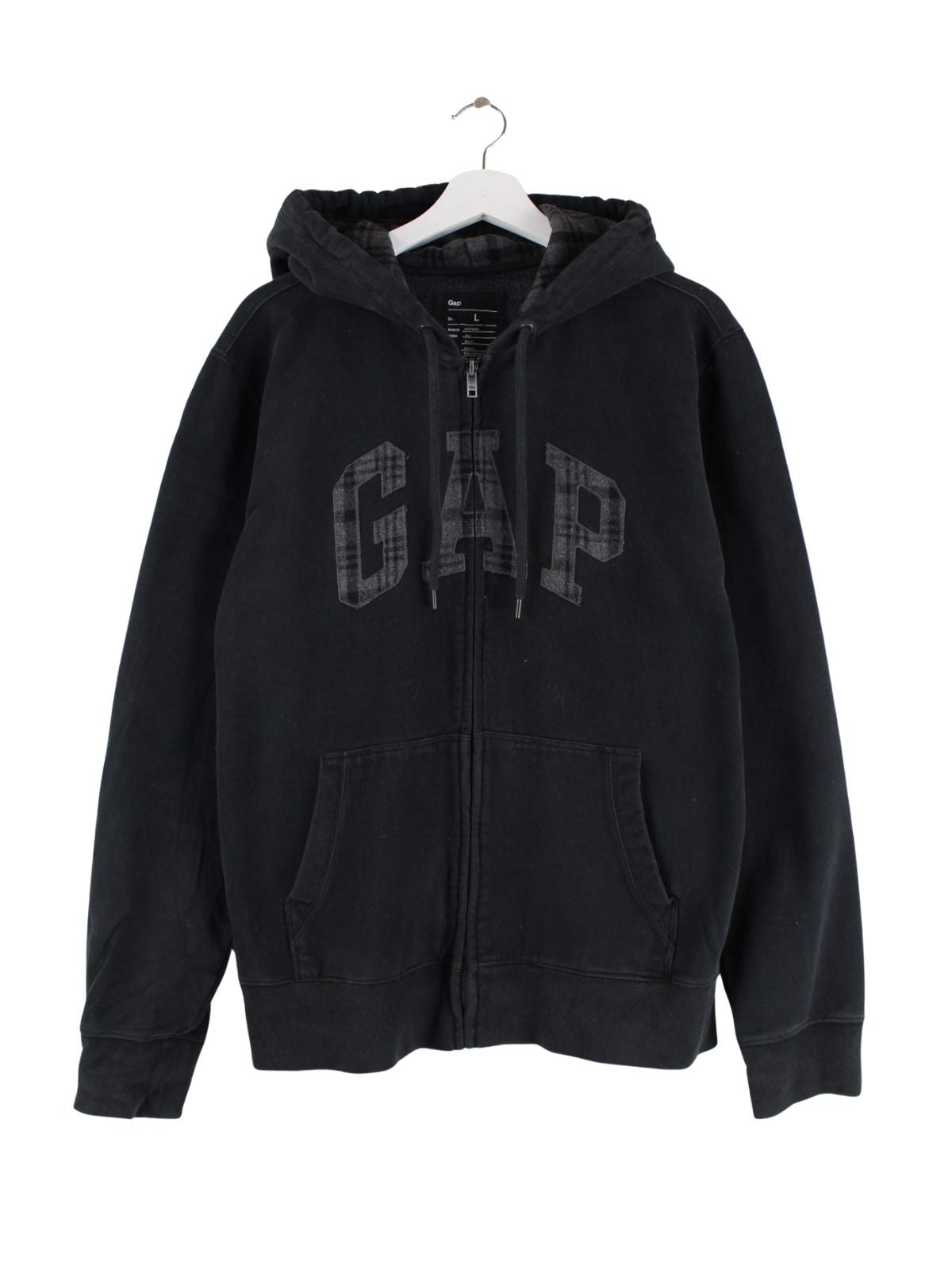Schwarzer Hoodie mit Zip des Labels GAP in Größe L. Er ist aus einer Baumwollmischung gemacht und in gutem Zustand bei uns zu bekommen.