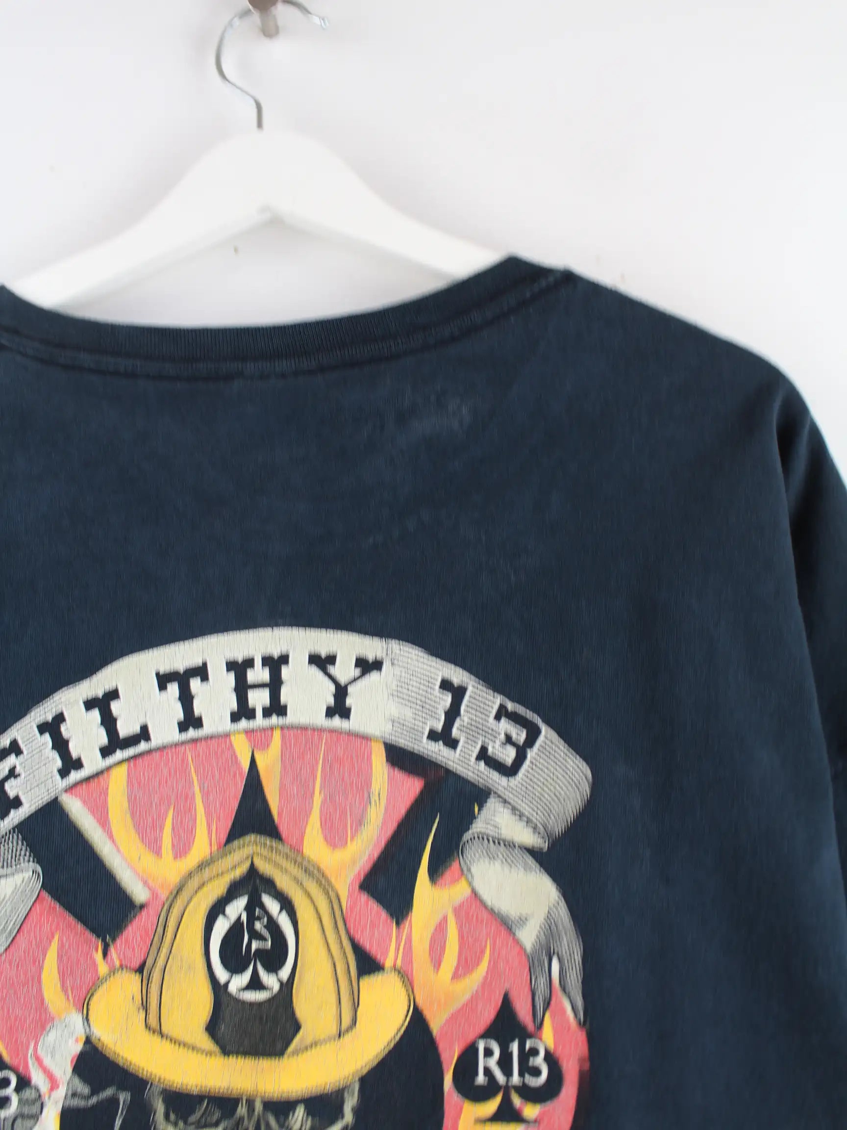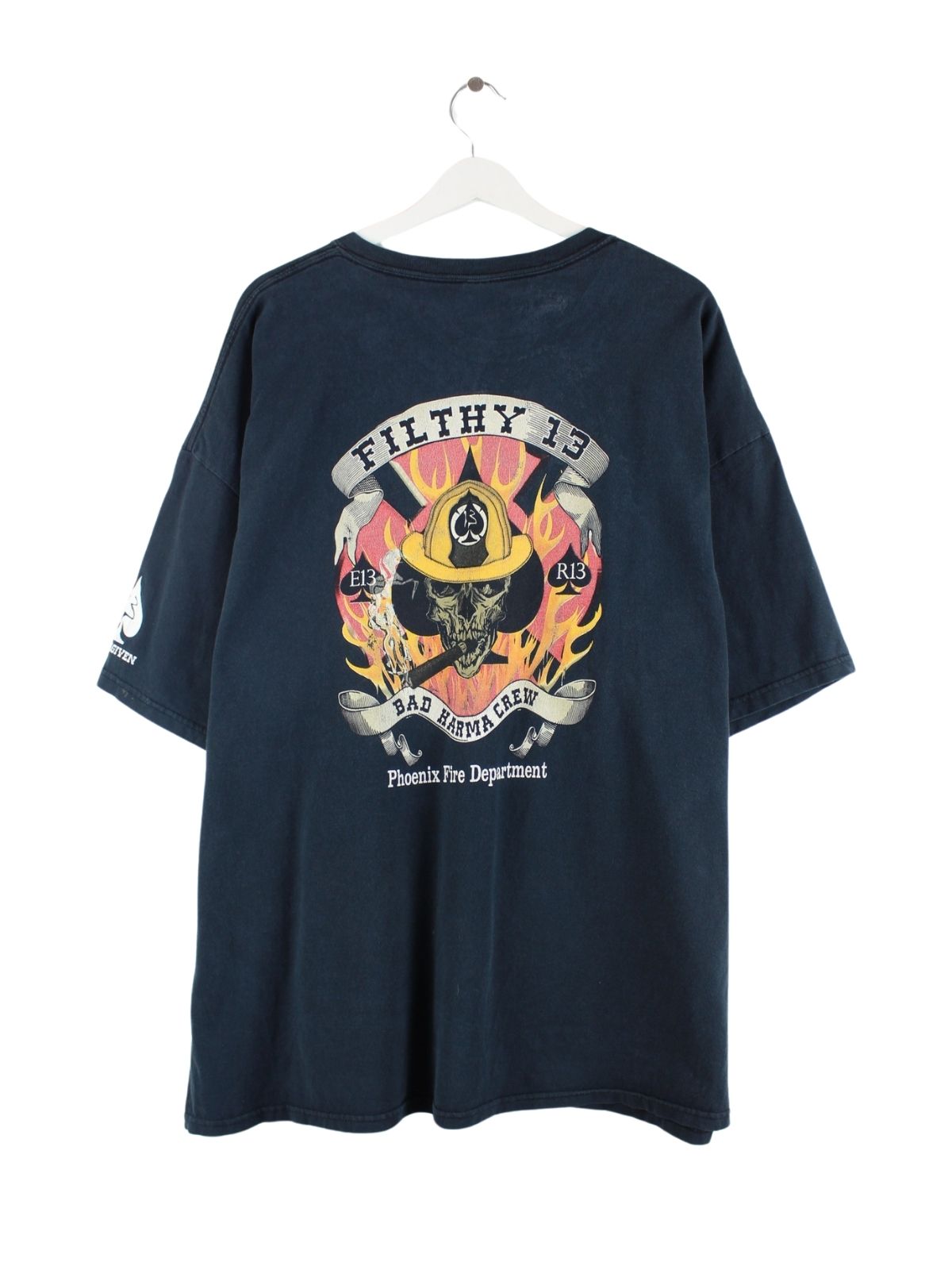 Blaues T-Shirt vom Brand Gildan in Größe 3XL. Es ist aus Baumwolle angefertigt und in gutem Zustand vorrätig. Mit chiquem Firefighter Print.