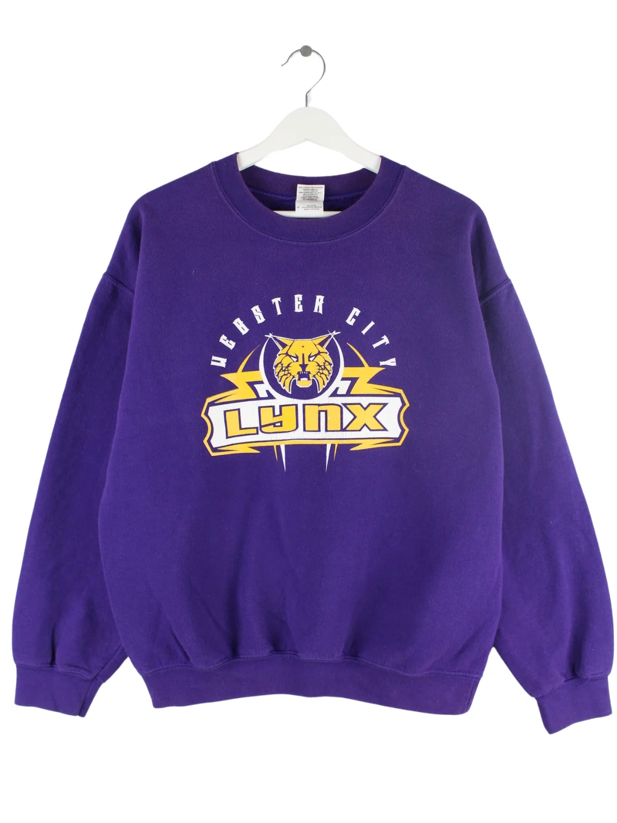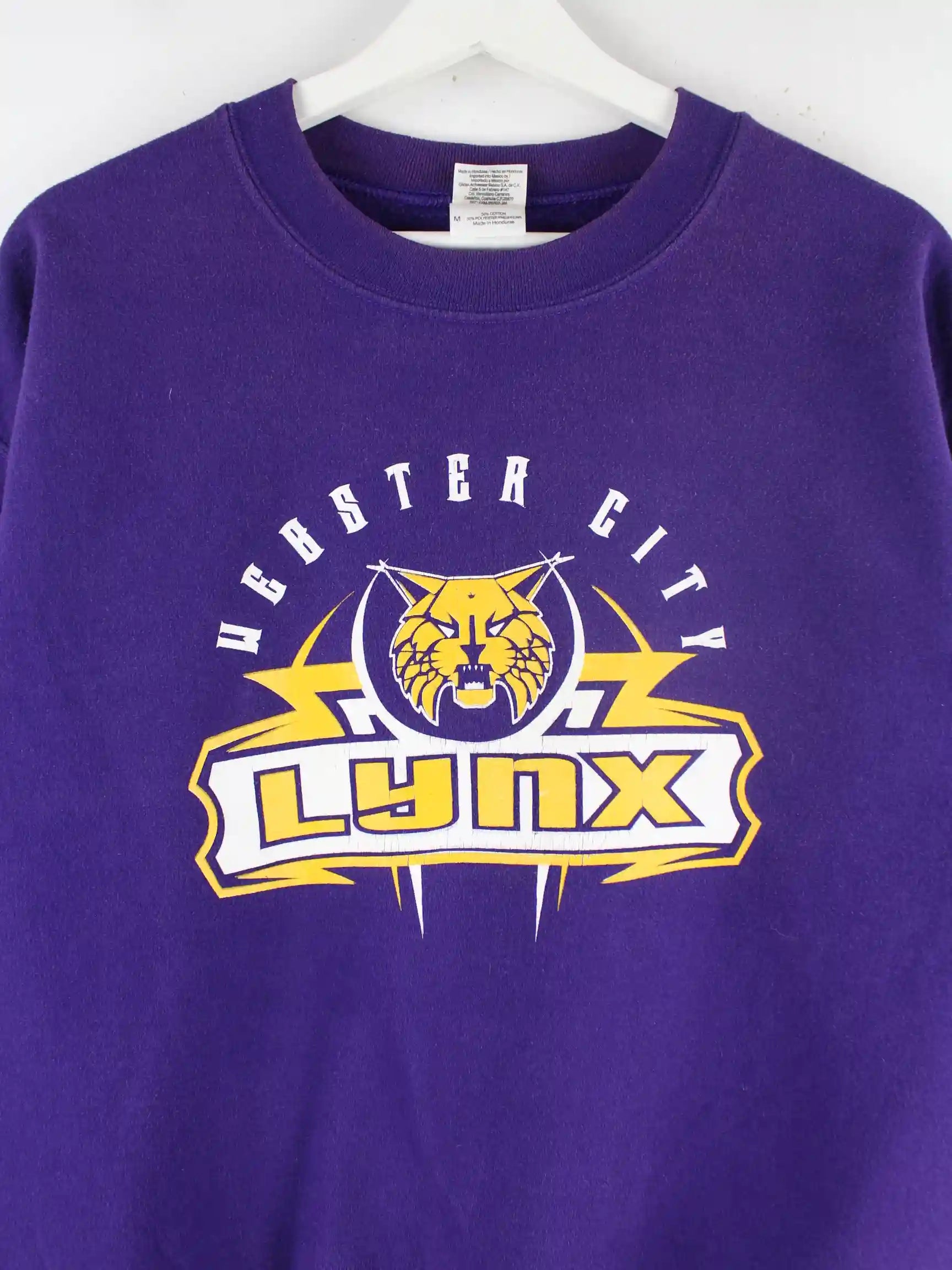 Sweater der Marke Gildan in Größe M. Er ist aus einer Baumwollmischung gefertigt und in Lila zu haben. Mit chiquem Lynx Print.