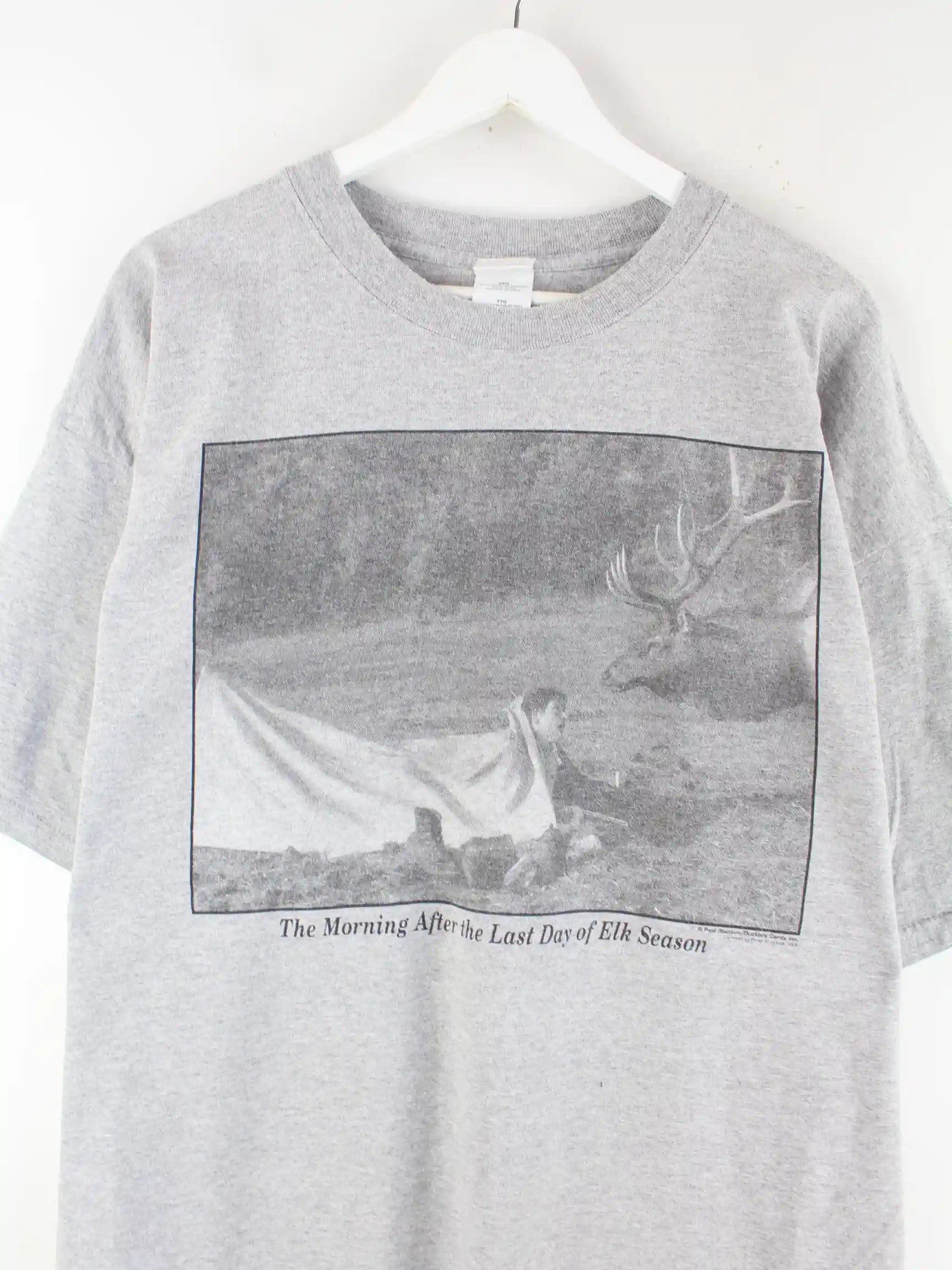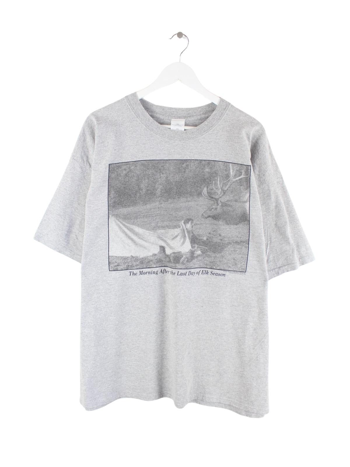 T-Shirt vom Label Gildan in Größe XXL. Es ist aus Baumwolle und in Grau bei uns vorrätig. Mit chiquem Elk Print.