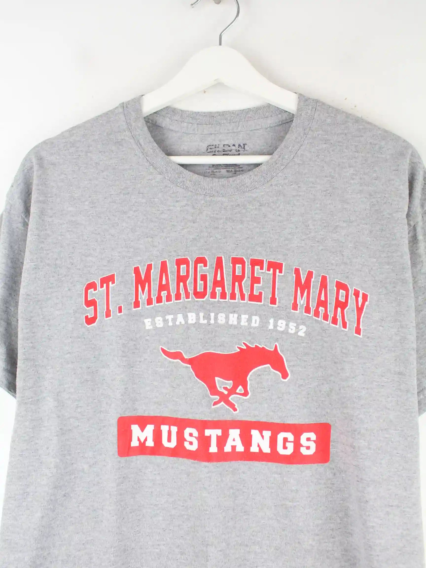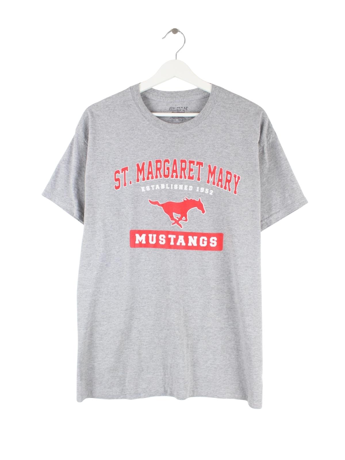 Graues T-Shirt vom Brand Gildan in Größe L. Es ist aus Baumwolle hergestellt und in sehr gutem Zustand lieferbar. Mit schickem Mustangs Print.