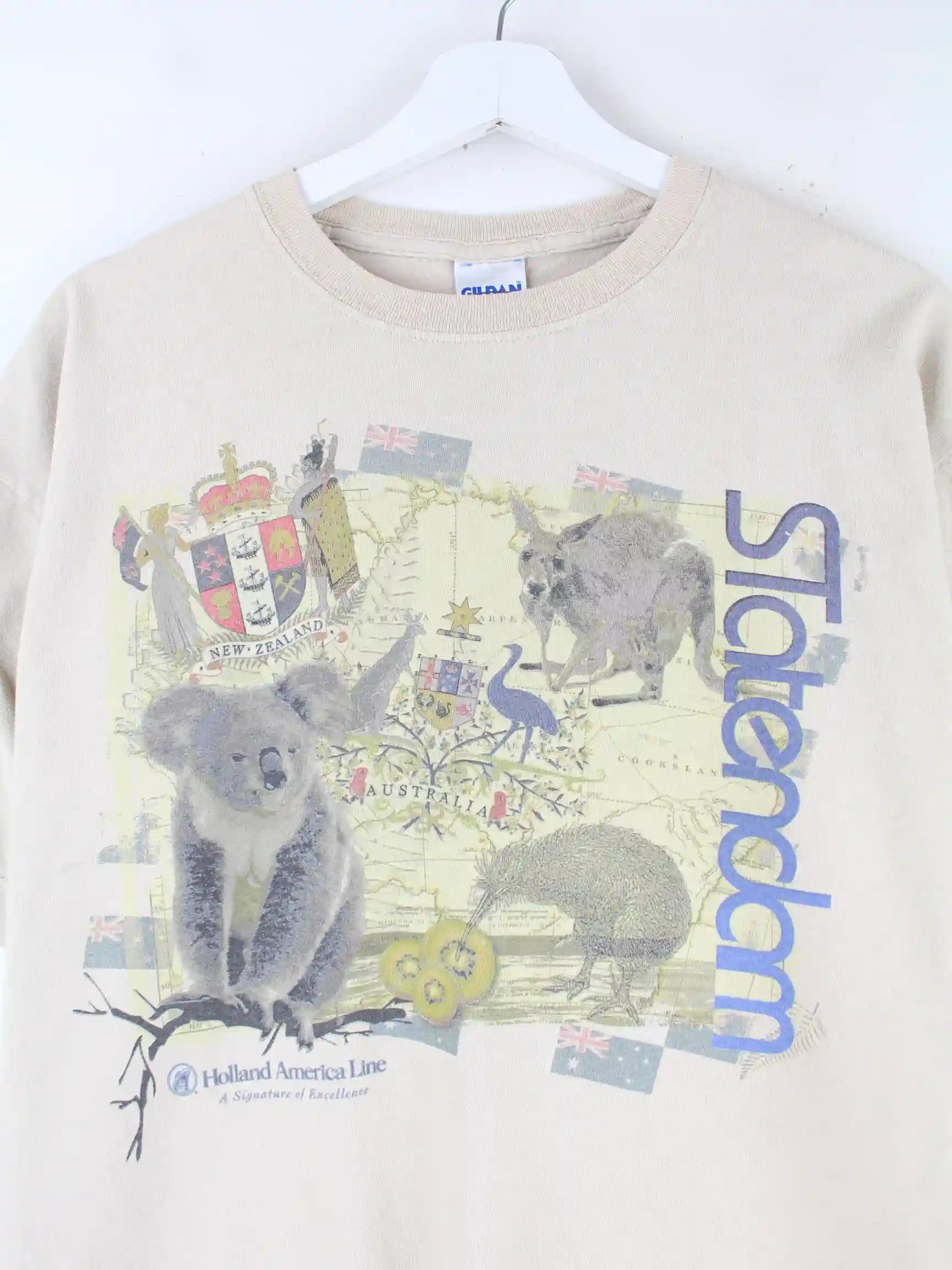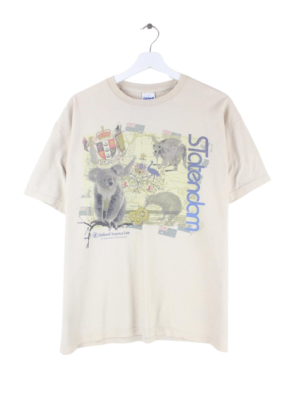 Beigefarbenes T-Shirt der Marke Gildan in Größe L. Es ist aus Baumwolle gemacht und in gutem Zustand auf Lager. Mit seltenem Outback Print.