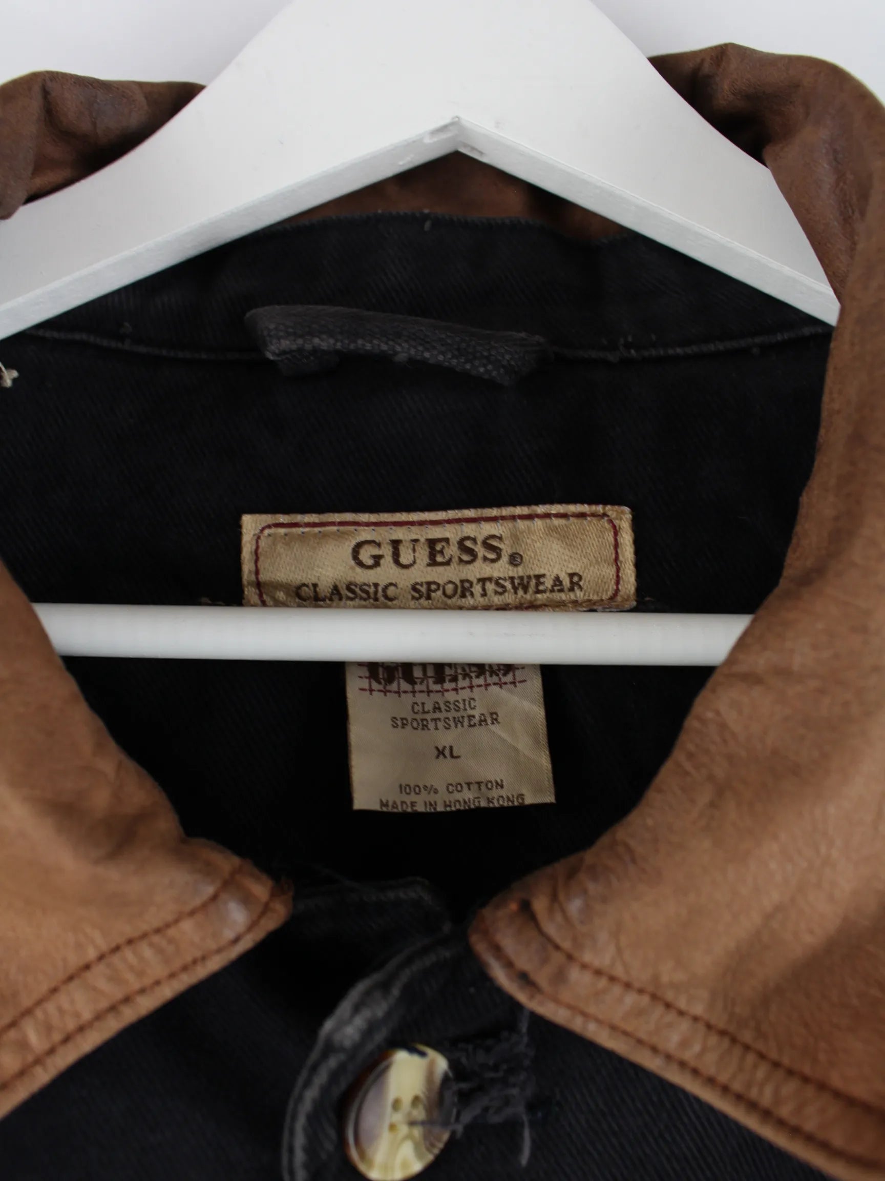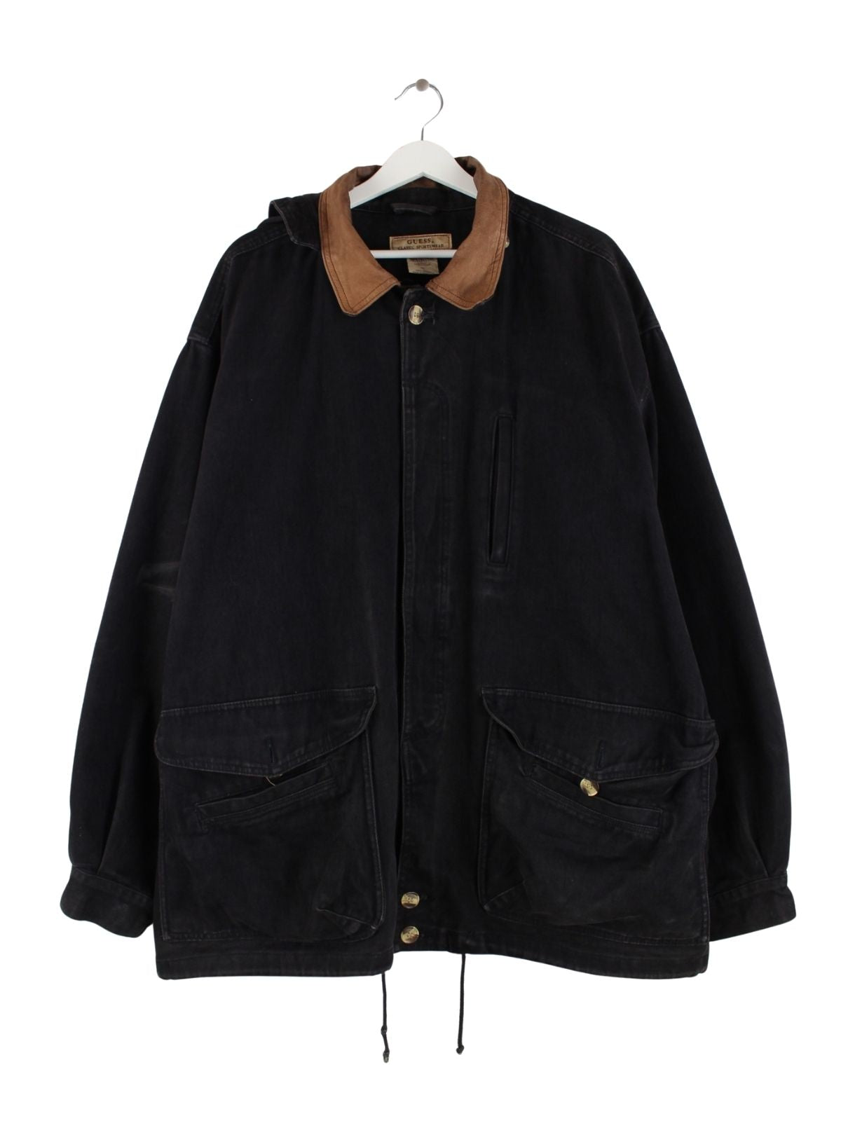 Schwarze Jacke aus dem Hause Guess aus den 90'ern in Größe XL. Sie ist aus Baumwolle gefertigt. Den Zustand würden wir als 'In Ordnung' bezeichnen (vergl. Bilder).