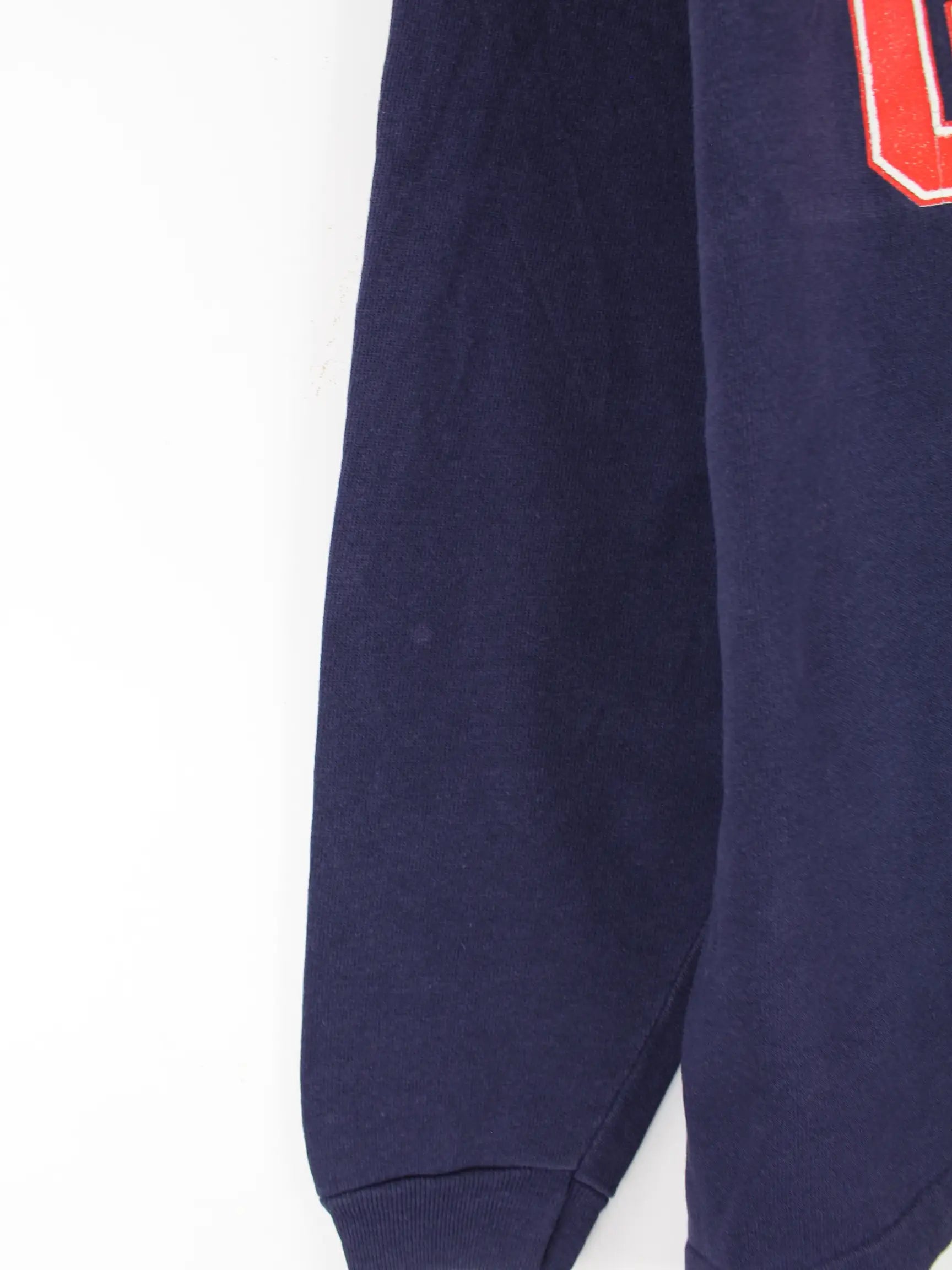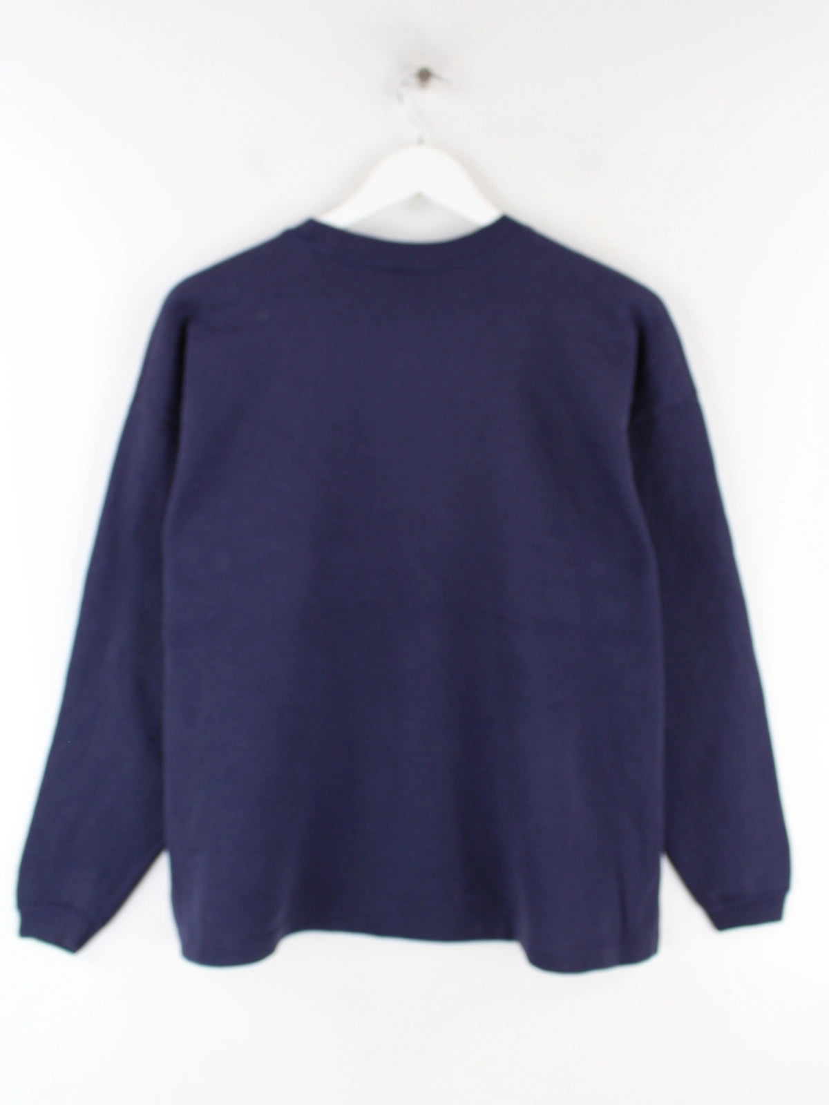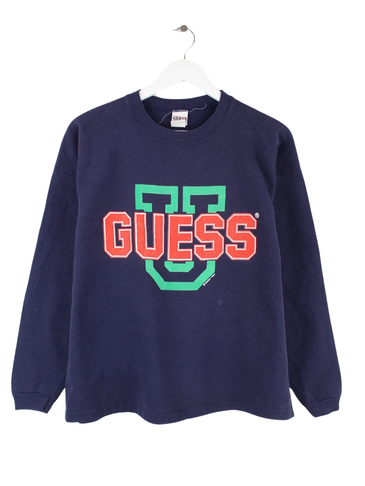 Blauer Sweater des Labels Guess in Größe M. Er ist aus einer Baumwollmischung produziert und in gutem Zustand bei uns vorrätig. Mit tollem Vintage Print.