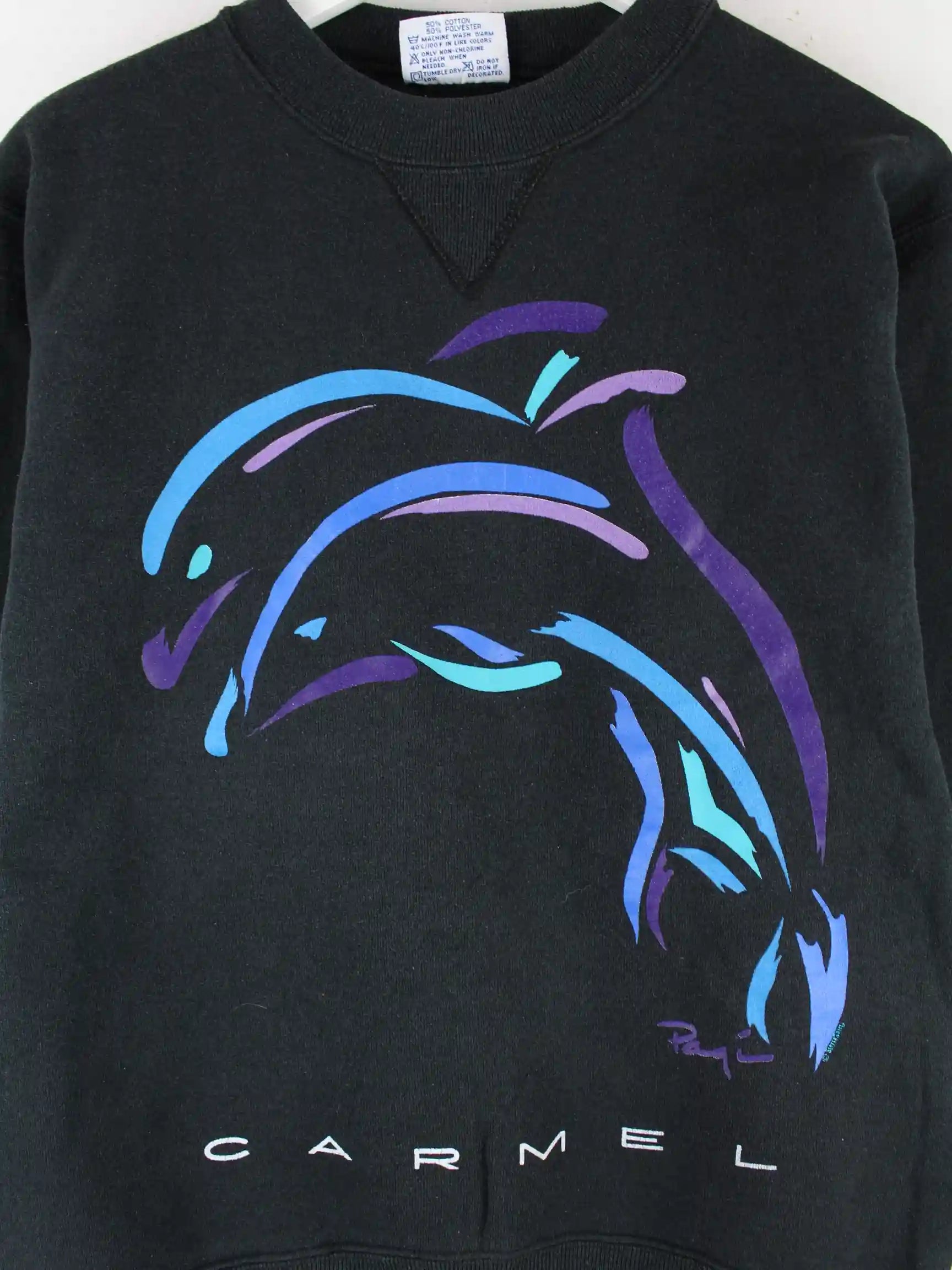 Sweater der Marke Hanes in Größe S aus den 90'ern. Er ist aus einer Baumwollmischung produziert und in Schwarz zu haben. Mit seltenem Carmel Print.