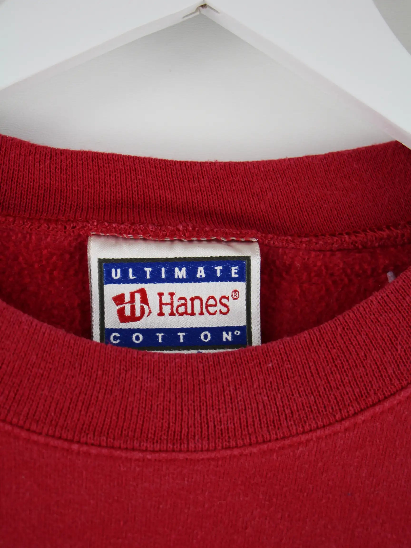Roter Sweater von Hanes aus den 90'ern in Größe XL. Er ist aus einer Baumwollmischung angefertigt und in gutem Zustand vorrätig.