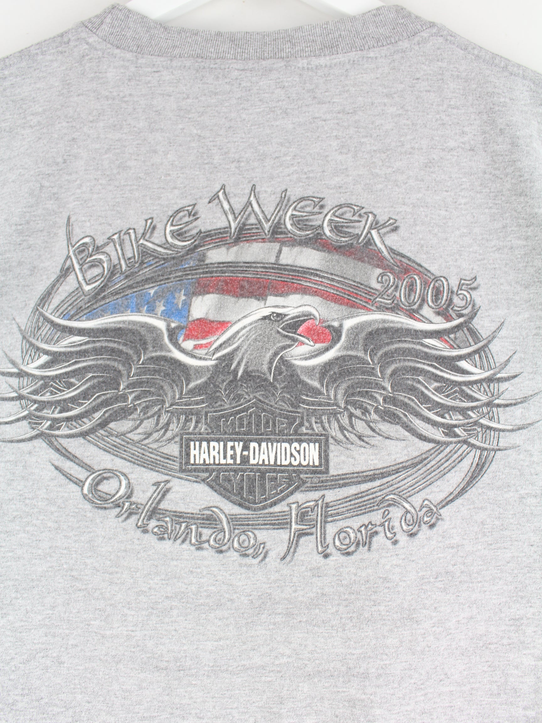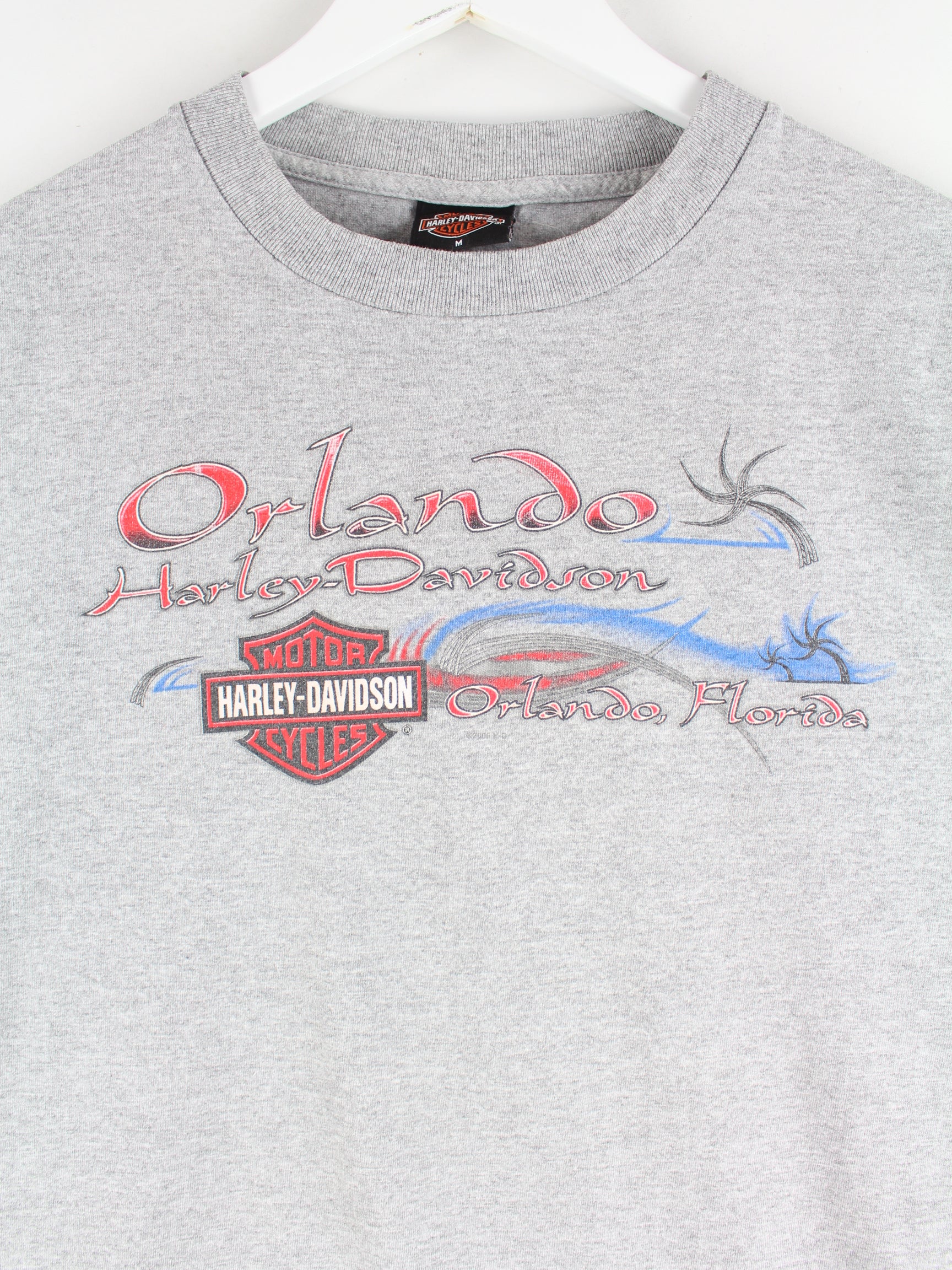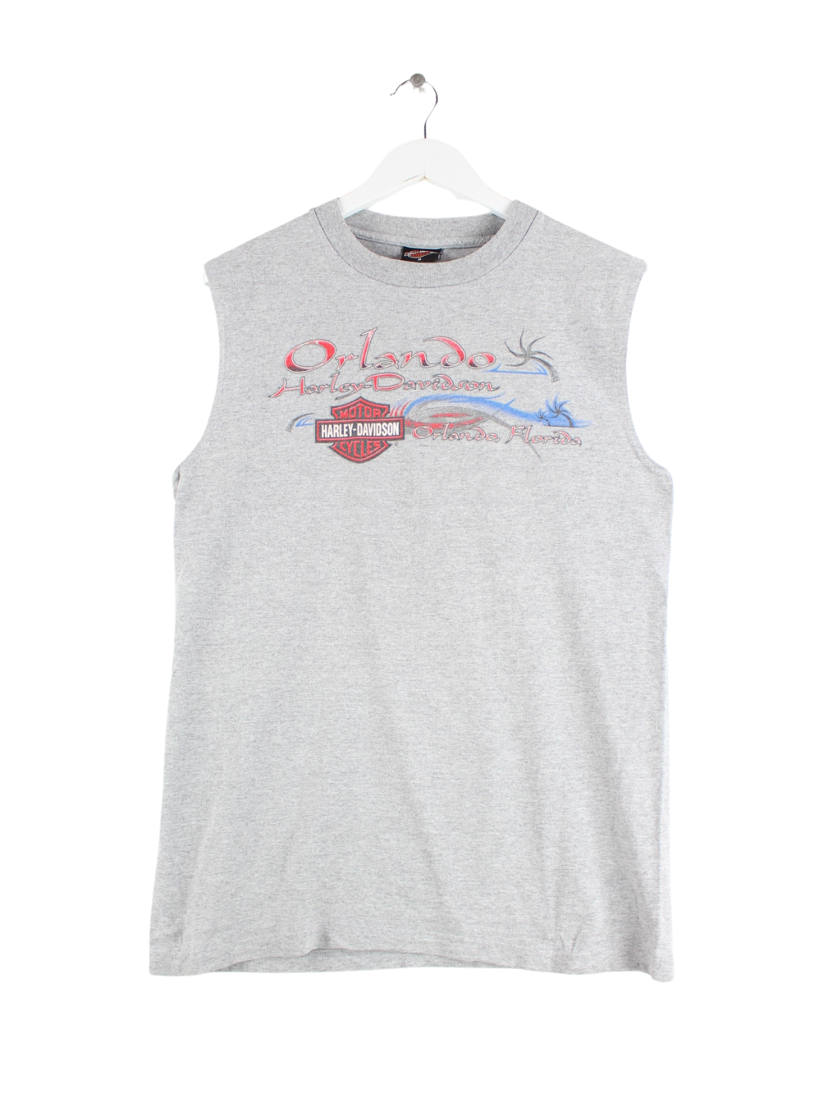 Grey tank top from the Harley Davidson label in size M. It is made of cotton and is available from us in very good condition. With a chic Orlando print.