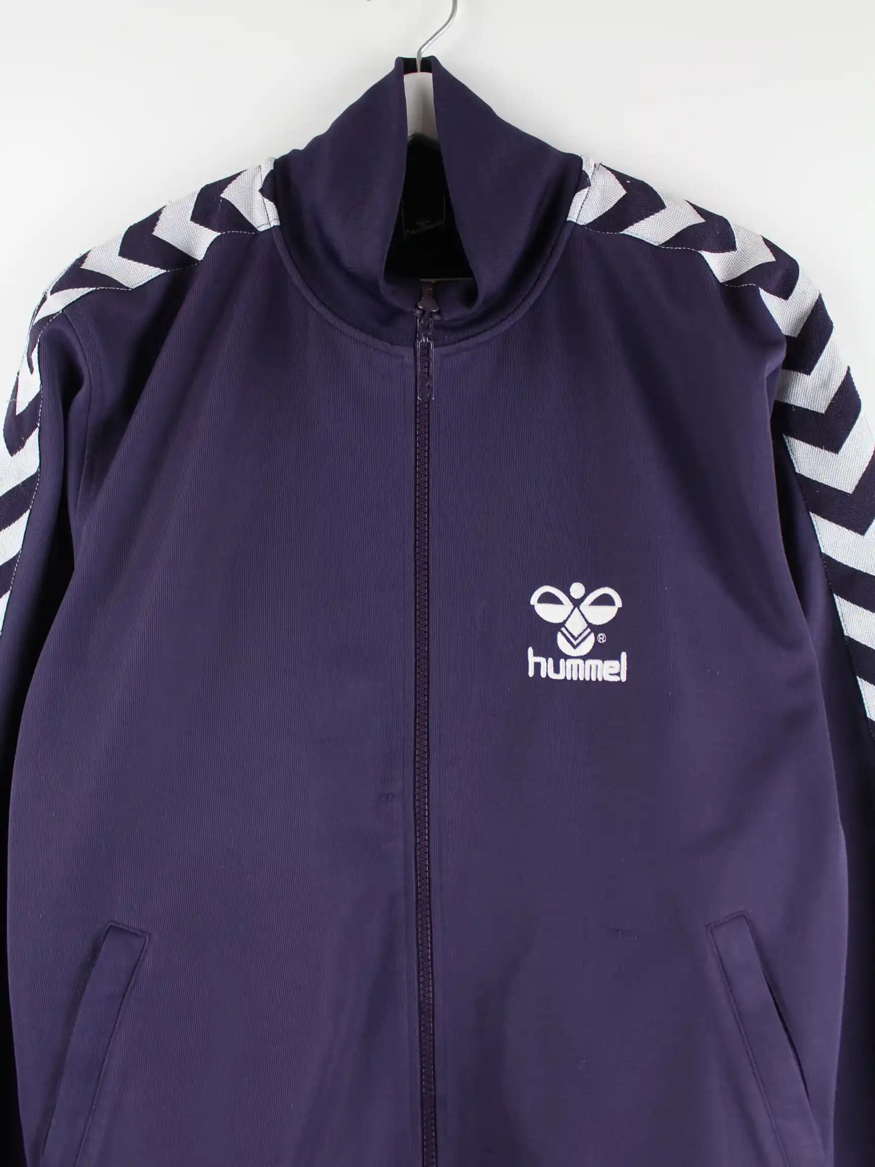 Trainingsjacke der Marke Hummel in Größe XL. Sie ist aus Synthetik gemacht und in Lila bei uns vorrätig.