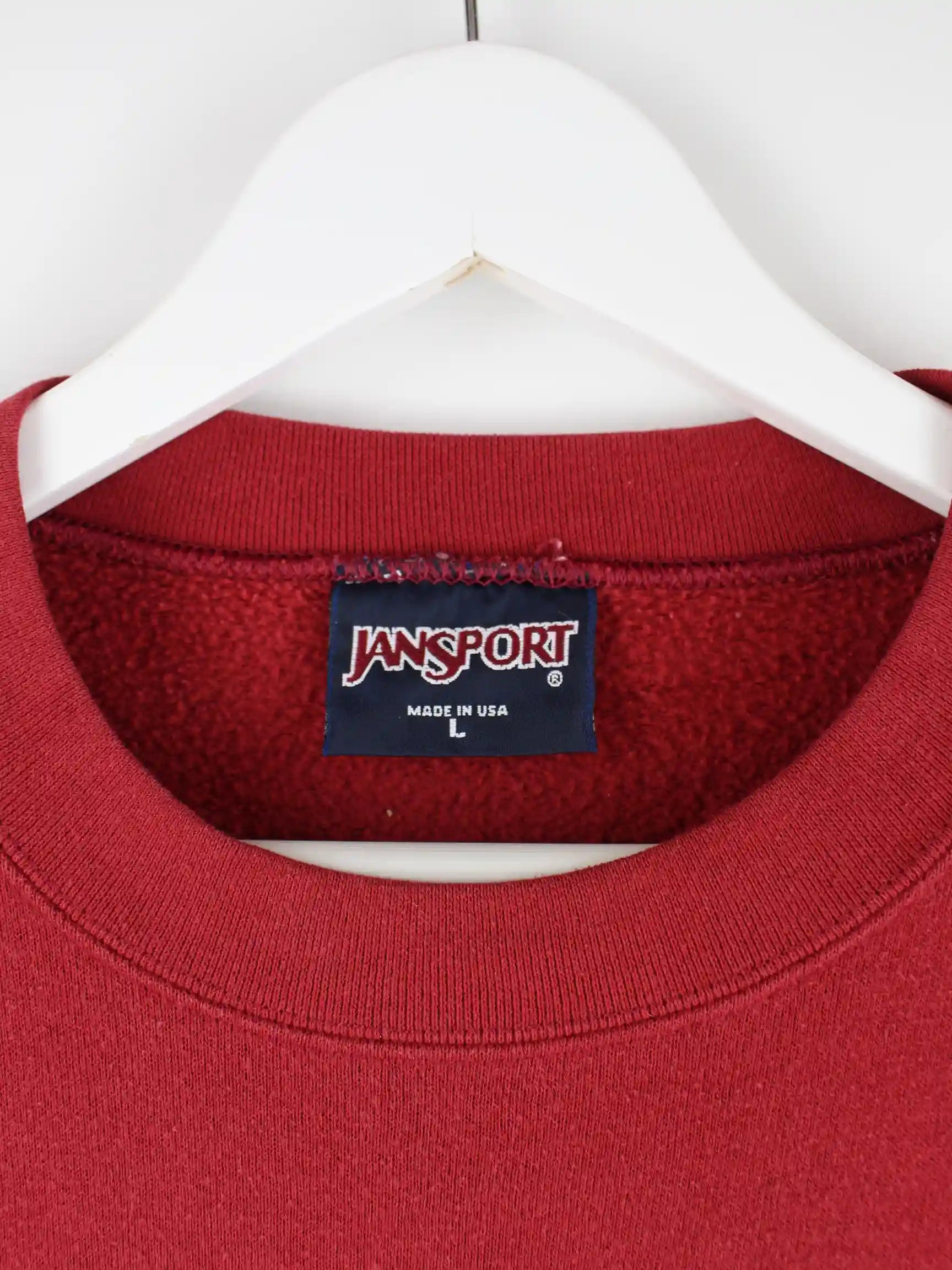 Sweater von Jansport in Größe L aus den 90'ern. Er ist aus einer Baumwollmischung hergestellt und in Rot in Stock.