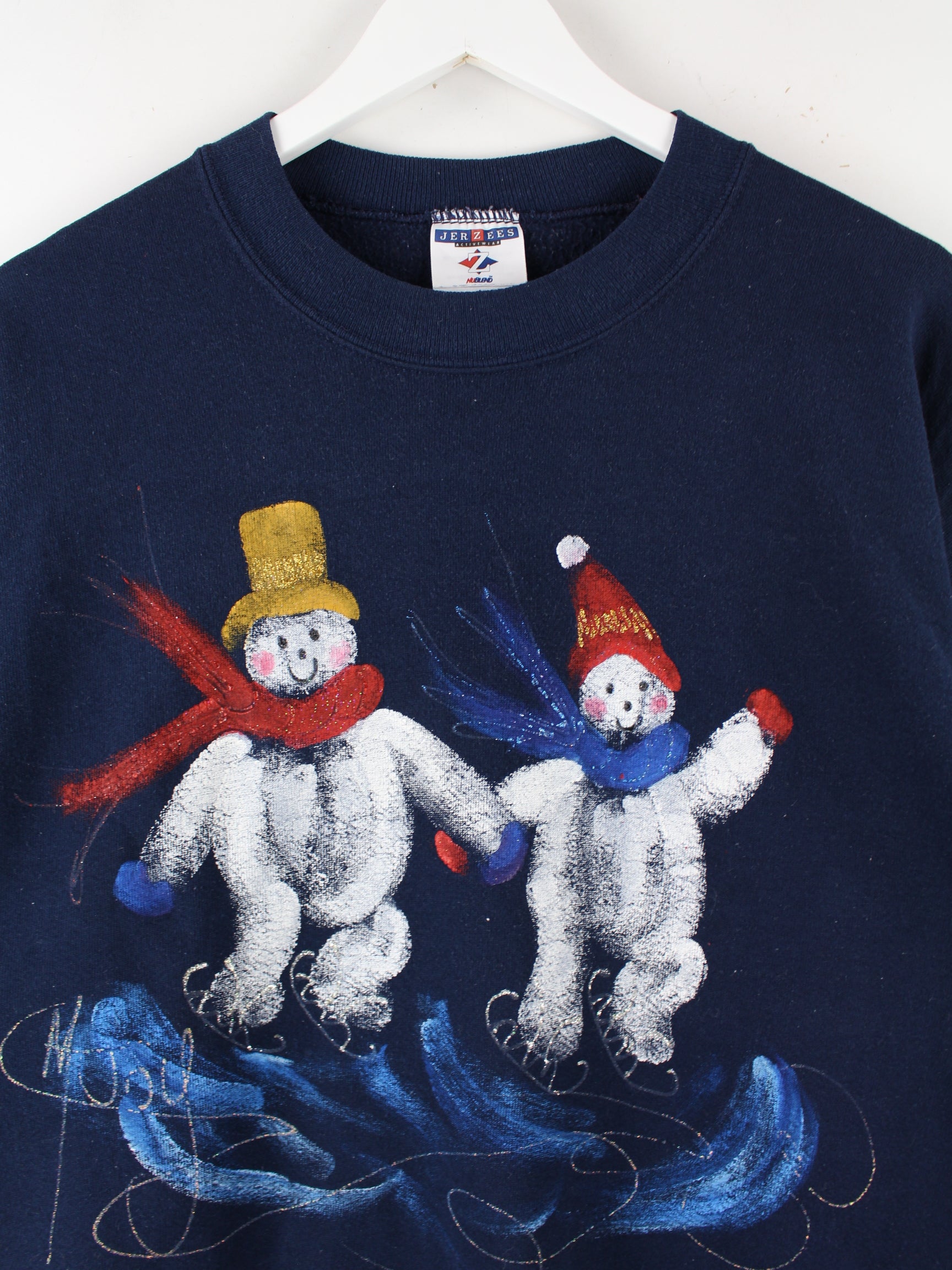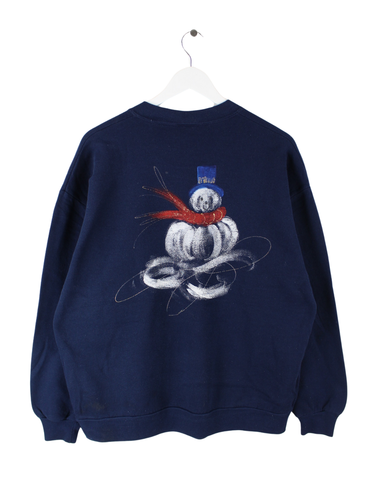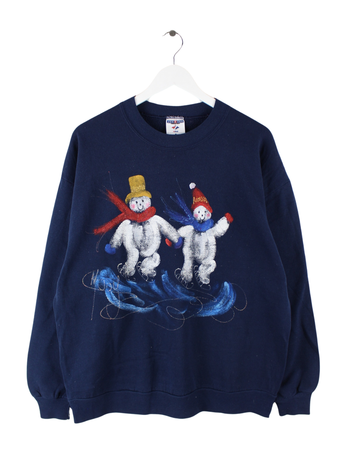 Sweater vom Brand Jerzees in Größe XL aus den 90'ern. Er ist aus einer Baumwollmischung hergestellt und in Blau bei uns vorrätig. Mit schickem Christmas Print.