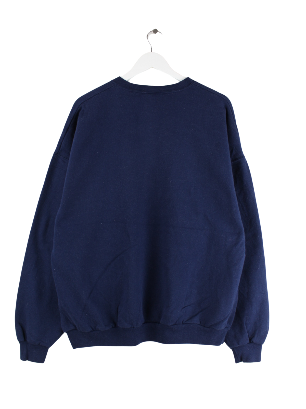 Blauer Sweater vom Label Jerzees aus den 90'ern in Größe XXL. Er ist aus einer Baumwollmischung angefertigt und in sehr gutem Zustand vorrätig. Mit tollem Wolf Print.