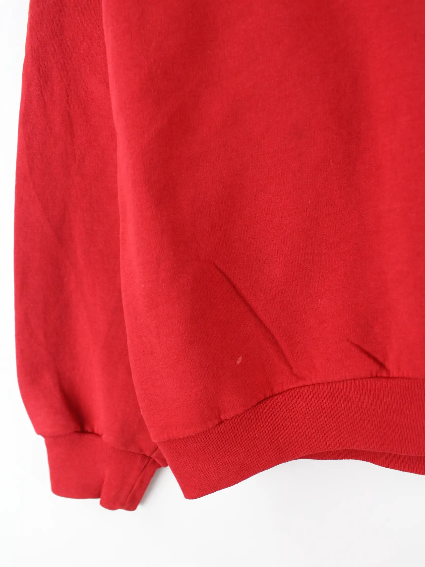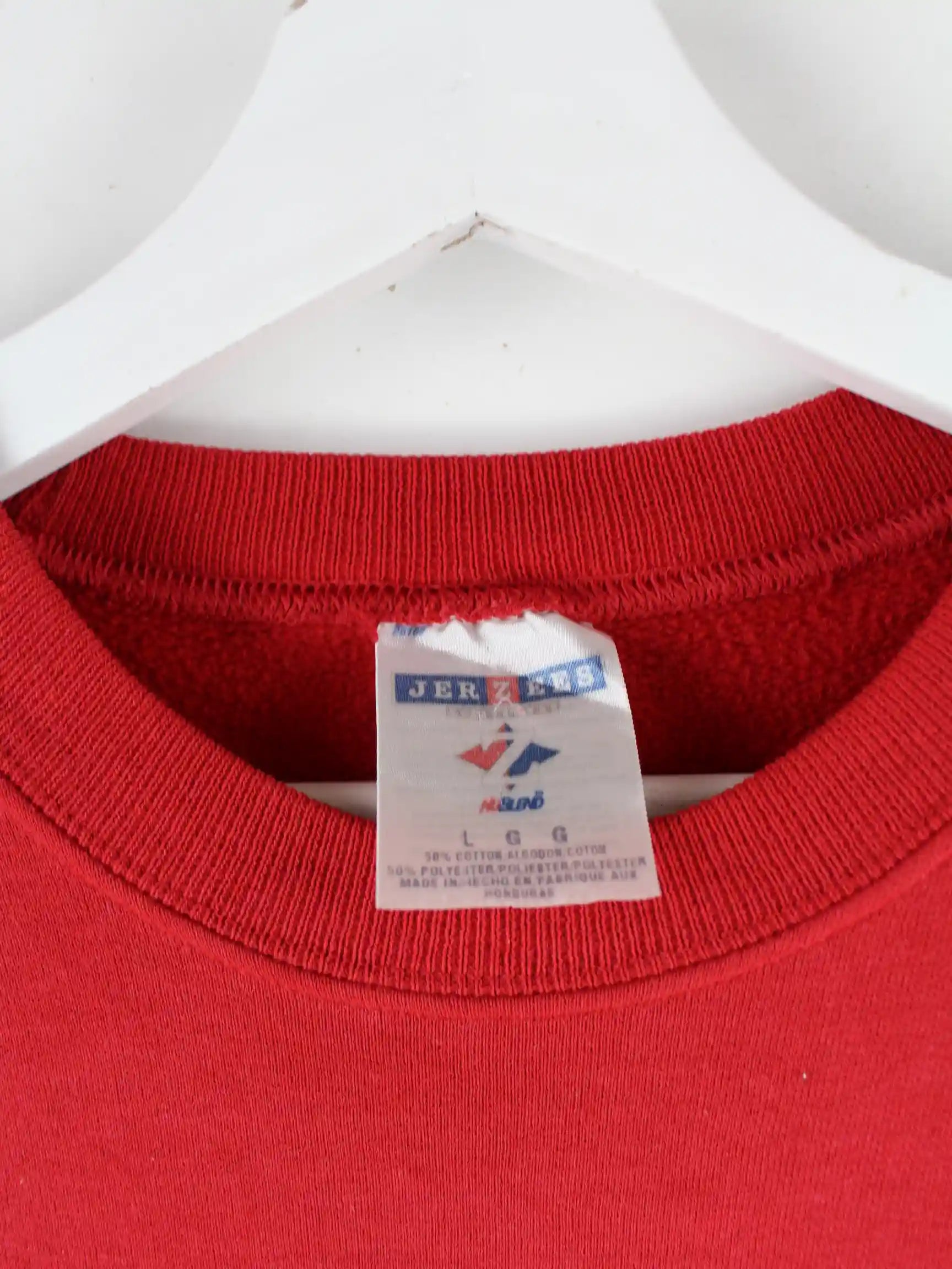 Roter Sweater mit Stickereien der Marke Jerzees aus den 90'ern in Größe L. Er ist aus einer Baumwollmischung produziert und in gutem Zustand bei uns vorrätig.