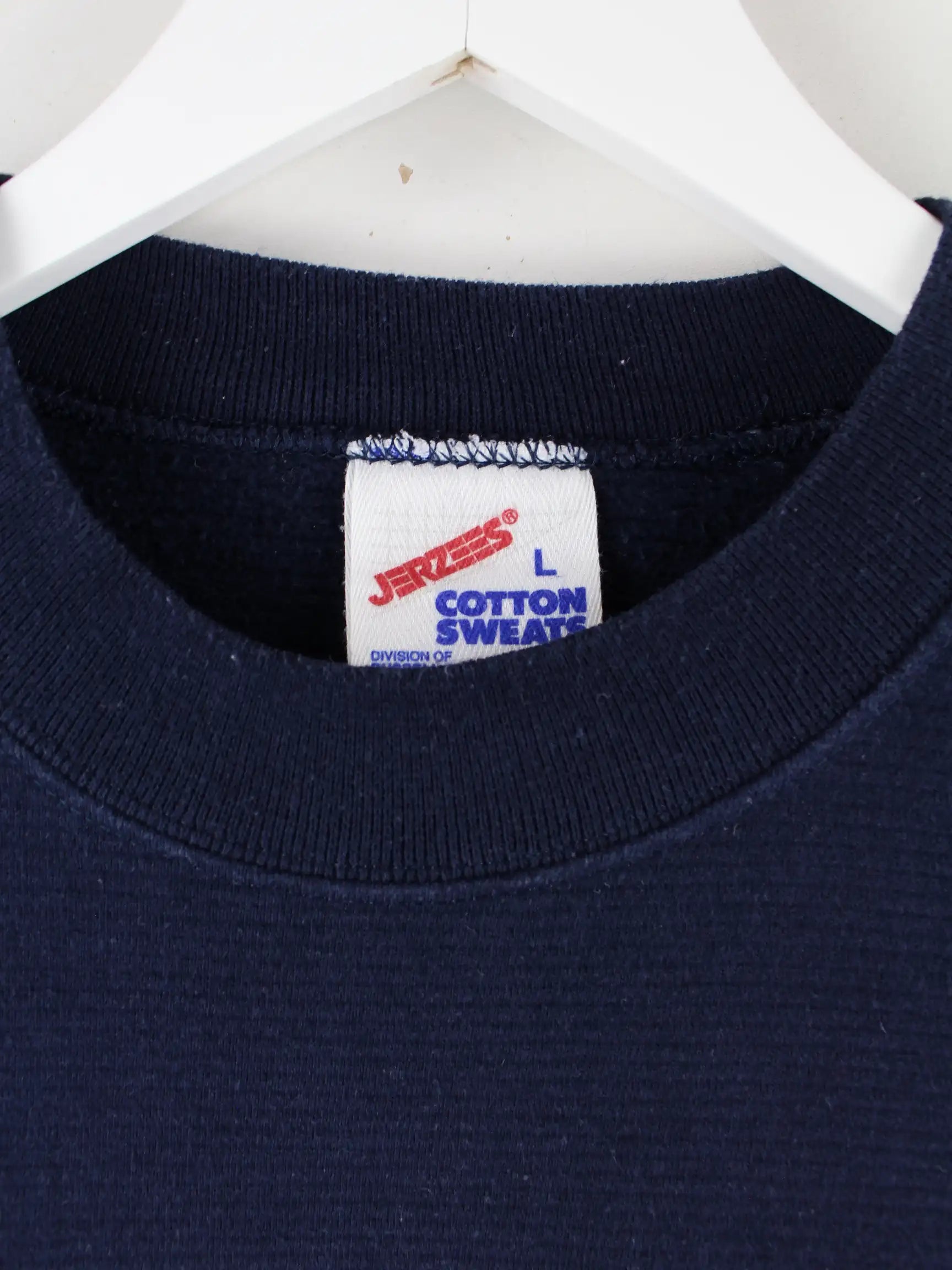 Sweater von Jerzees mit Stickereien in Größe L aus den 90'ern. Er ist aus einer Baumwollmischung hergestellt und in Blau zu bekommen.