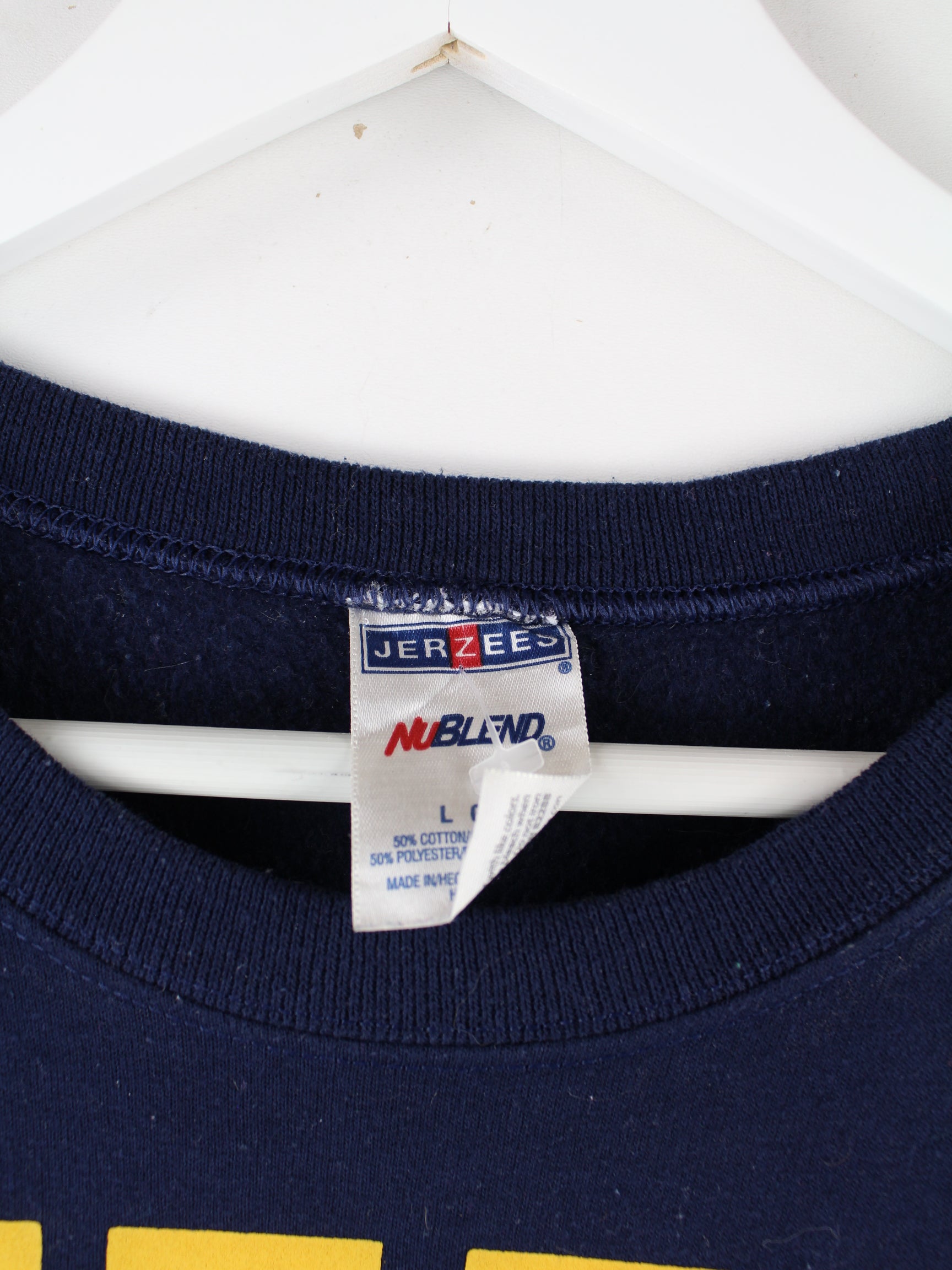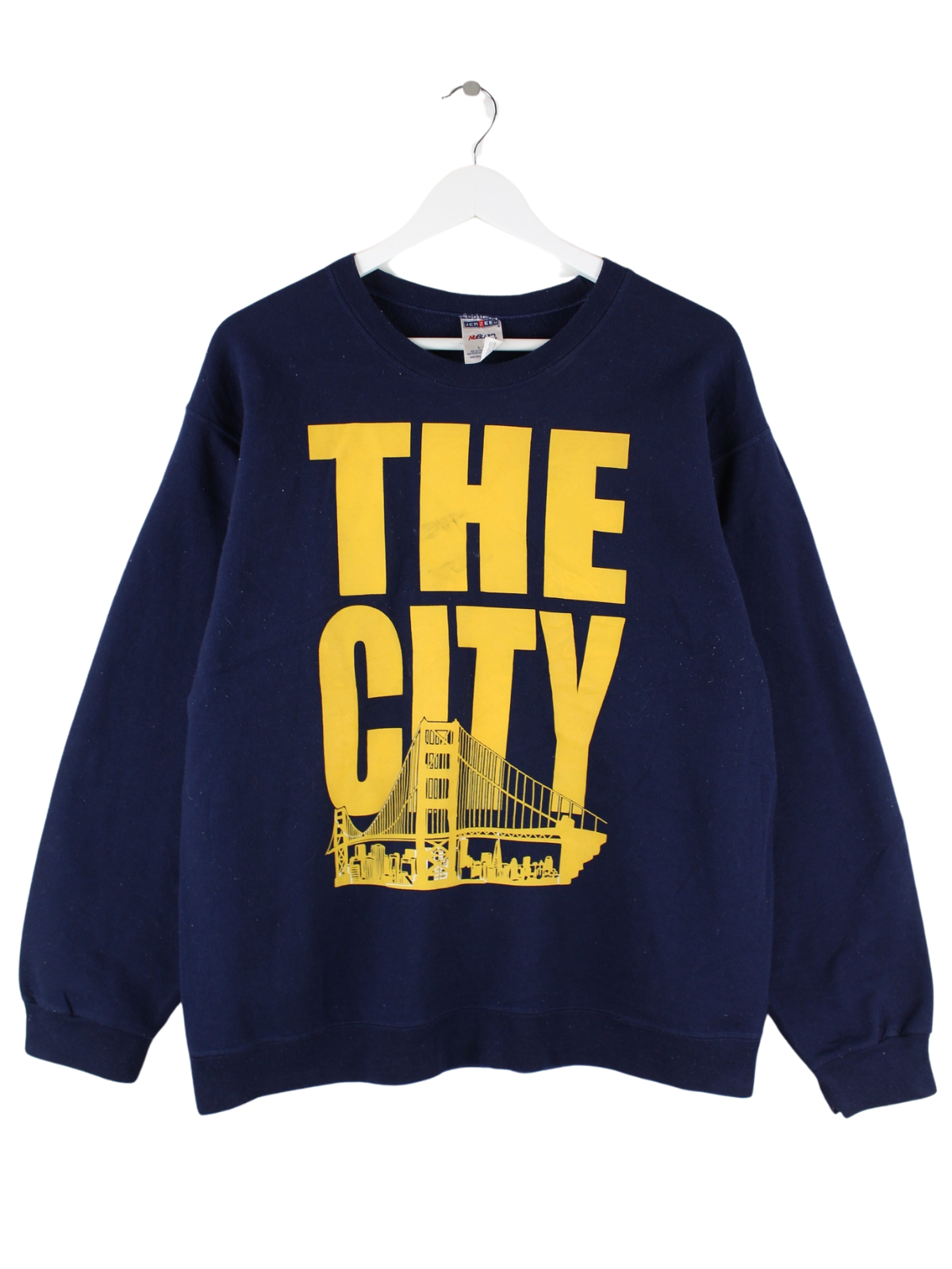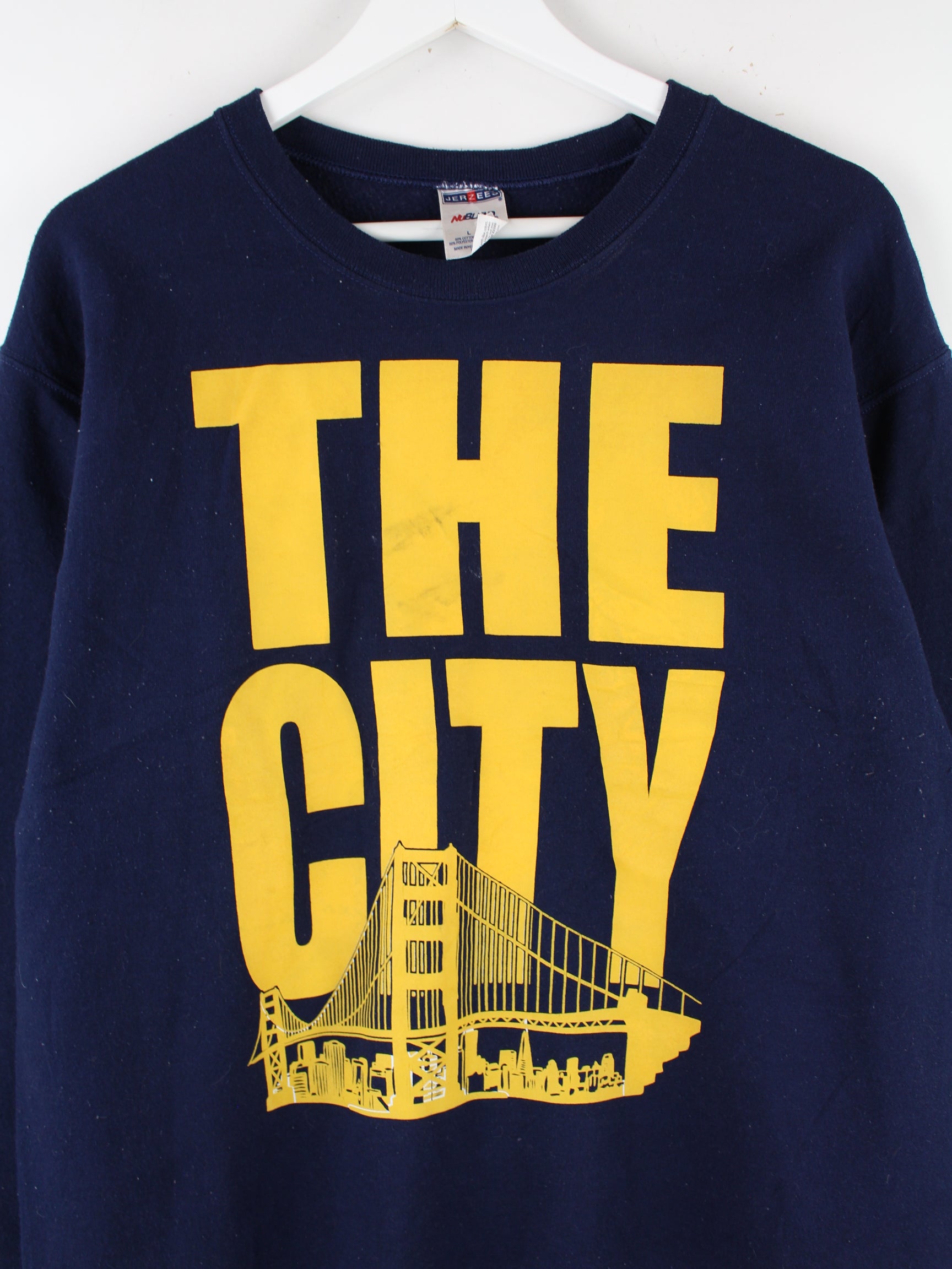 Blauer Sweater von Jerzees aus den 90'ern in Größe L. Er ist aus einer Baumwollmischung und in gutem Zustand im Bestand. Mit seltenem City Print.