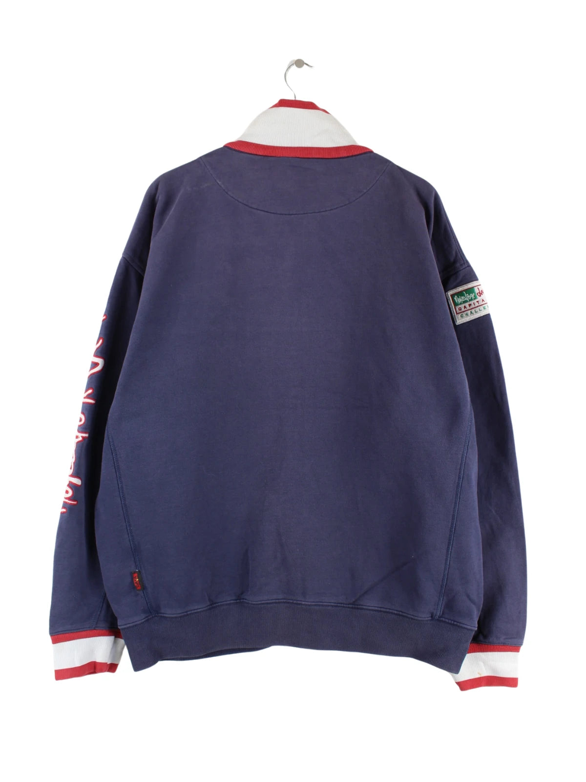 Blaue Sweatjacke mit gestickten Motiven von Kappa in Größe 3XL. Sie ist aus einer Baumwollmischung gefertigt und in sehr gutem Zustand zu haben.