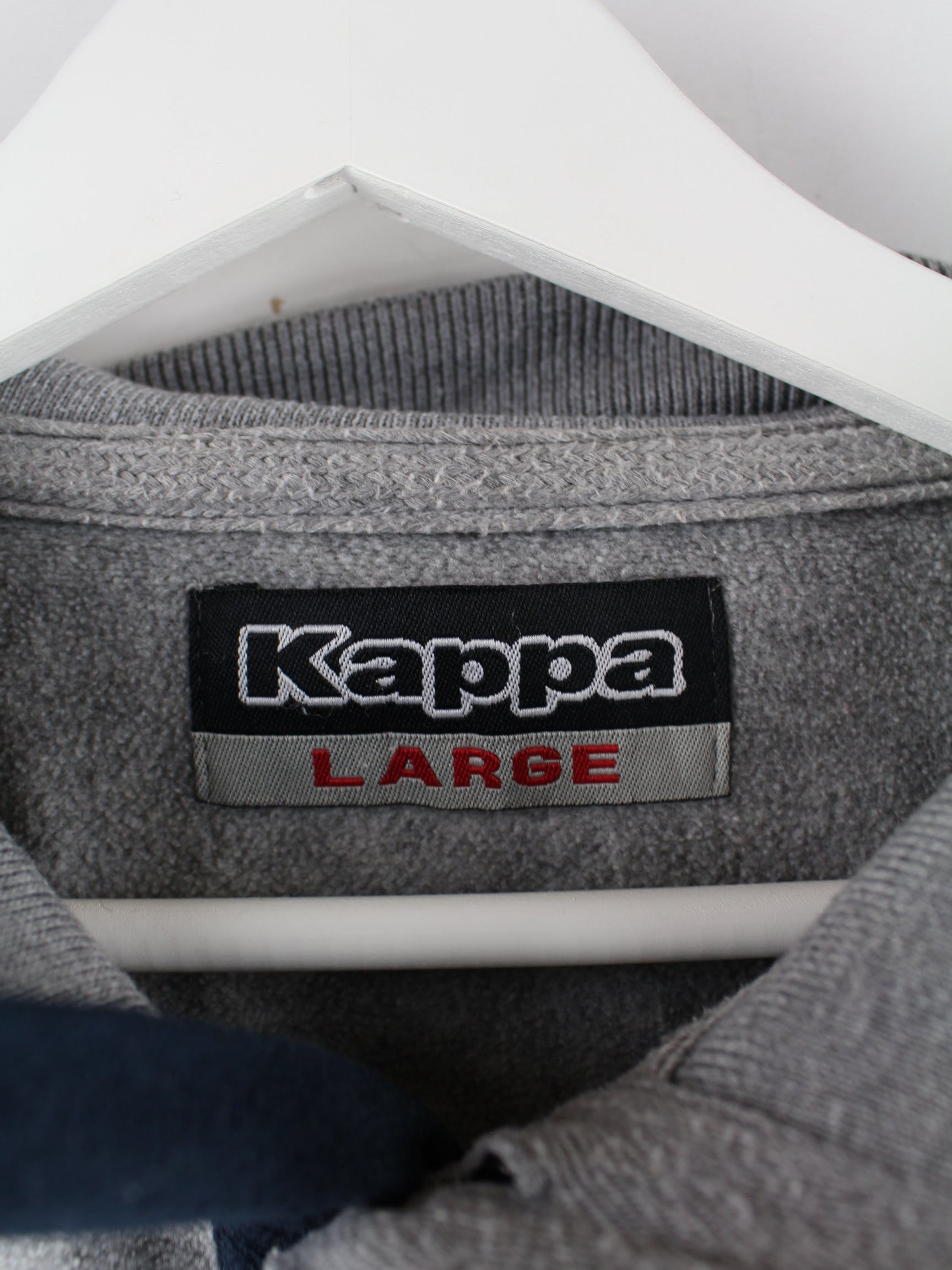 Grauer Sweater mit Stick vom Brand Kappa in Größe L. Er ist aus gemütlichem Fleece und in sehr gutem Zustand zu haben.