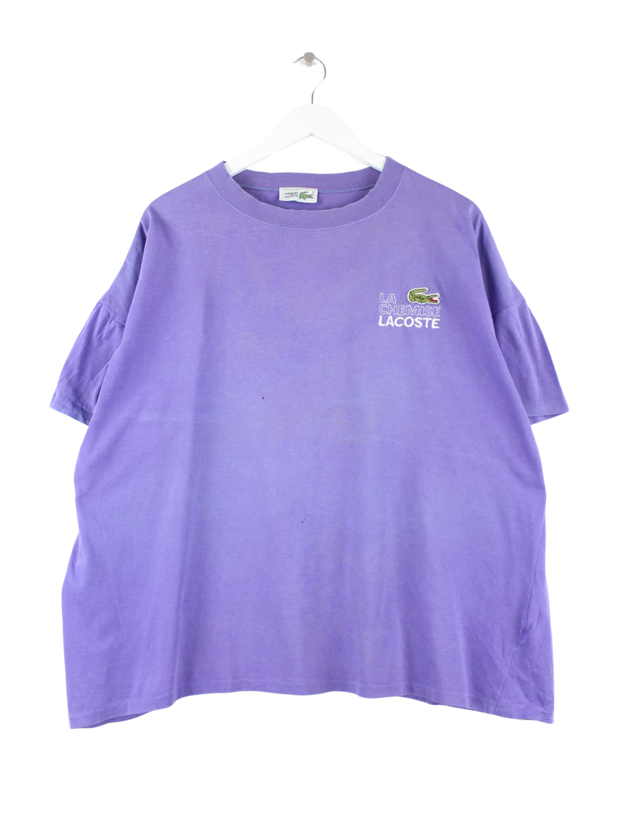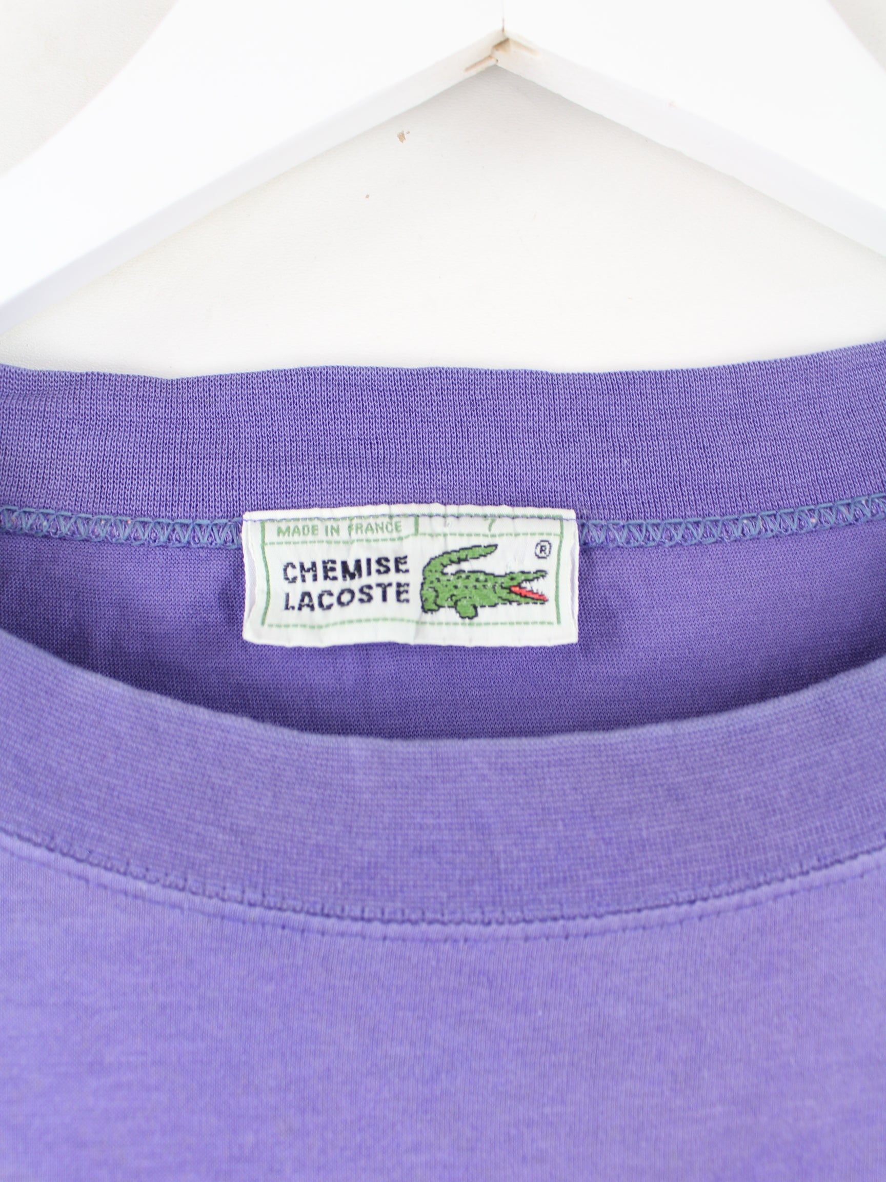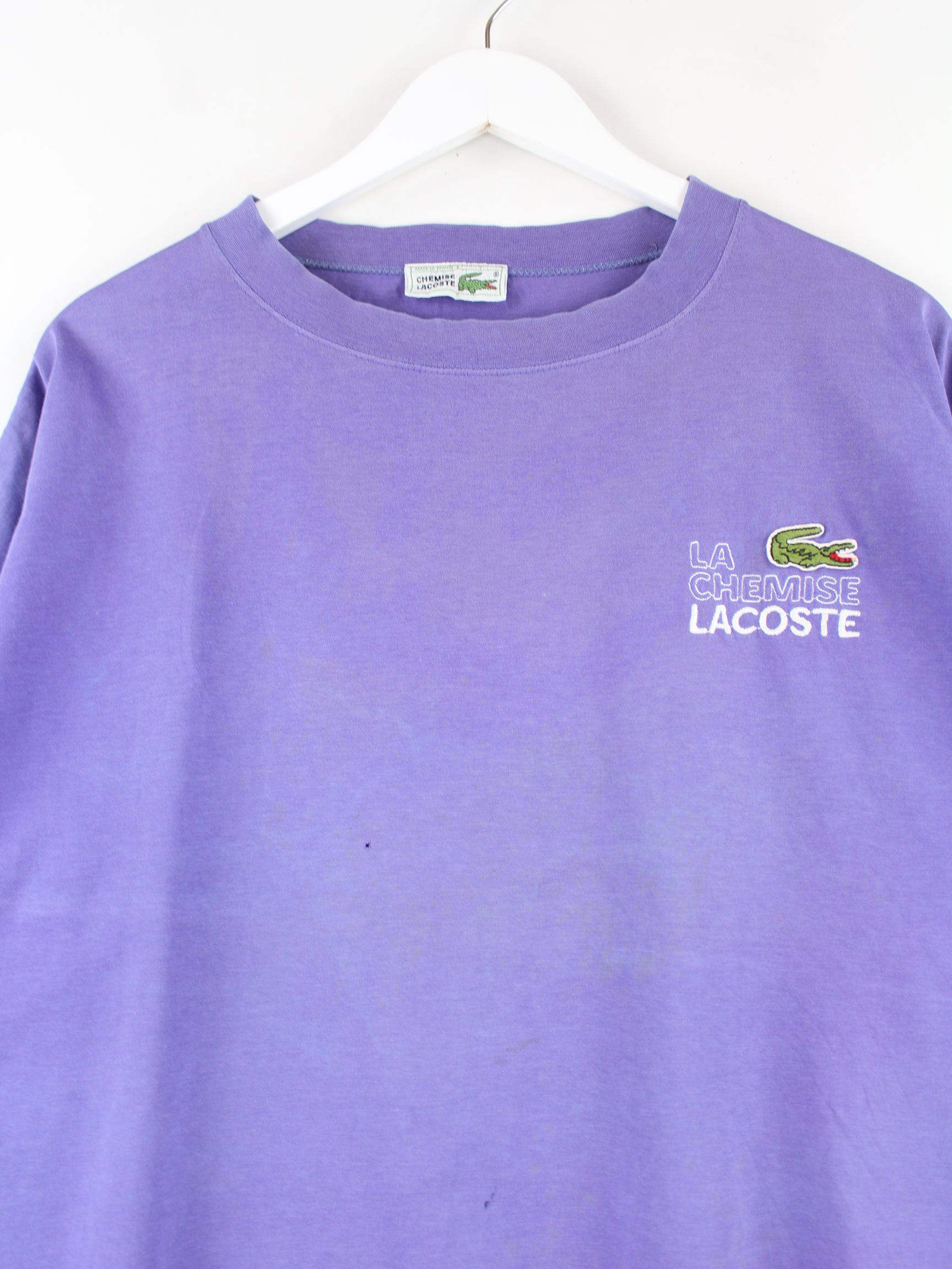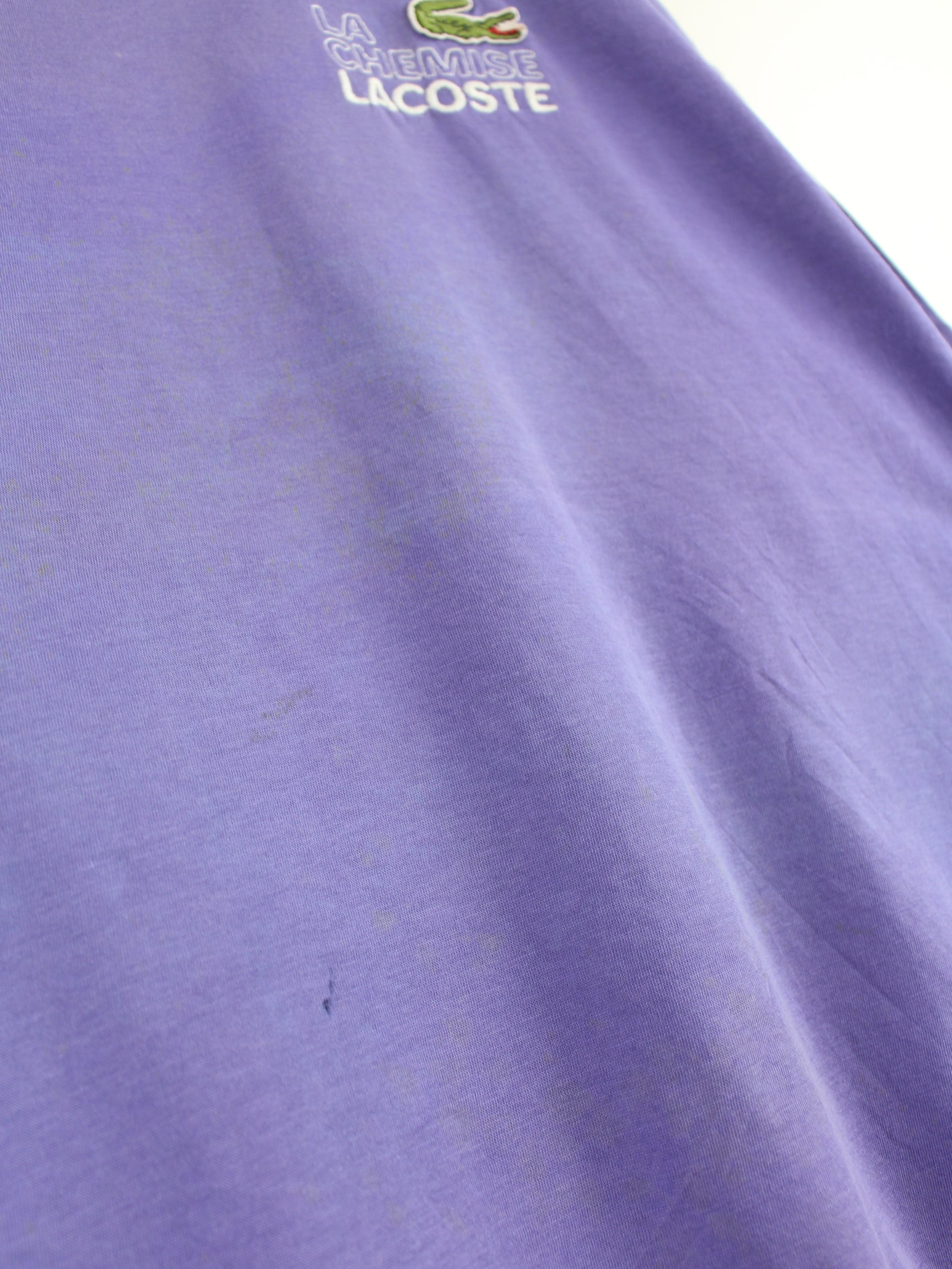 Purple embroidered T-shirt by Lacoste from the 90's in size M. It is made of cotton. We would describe the condition as 'fine' (see pictures).