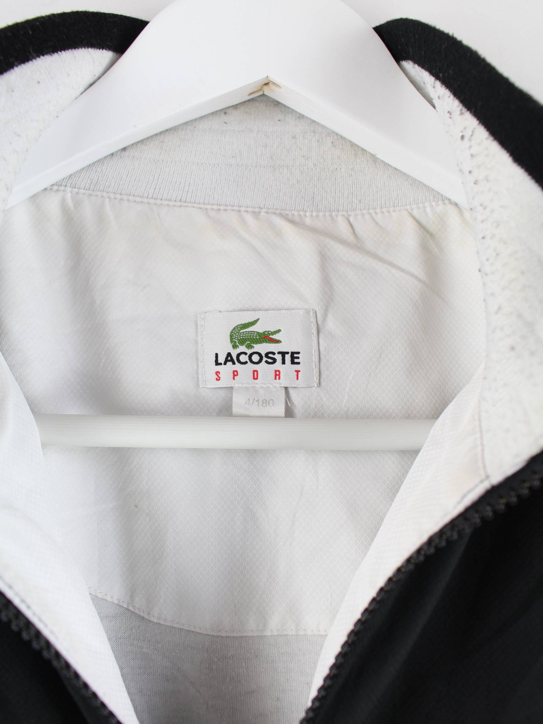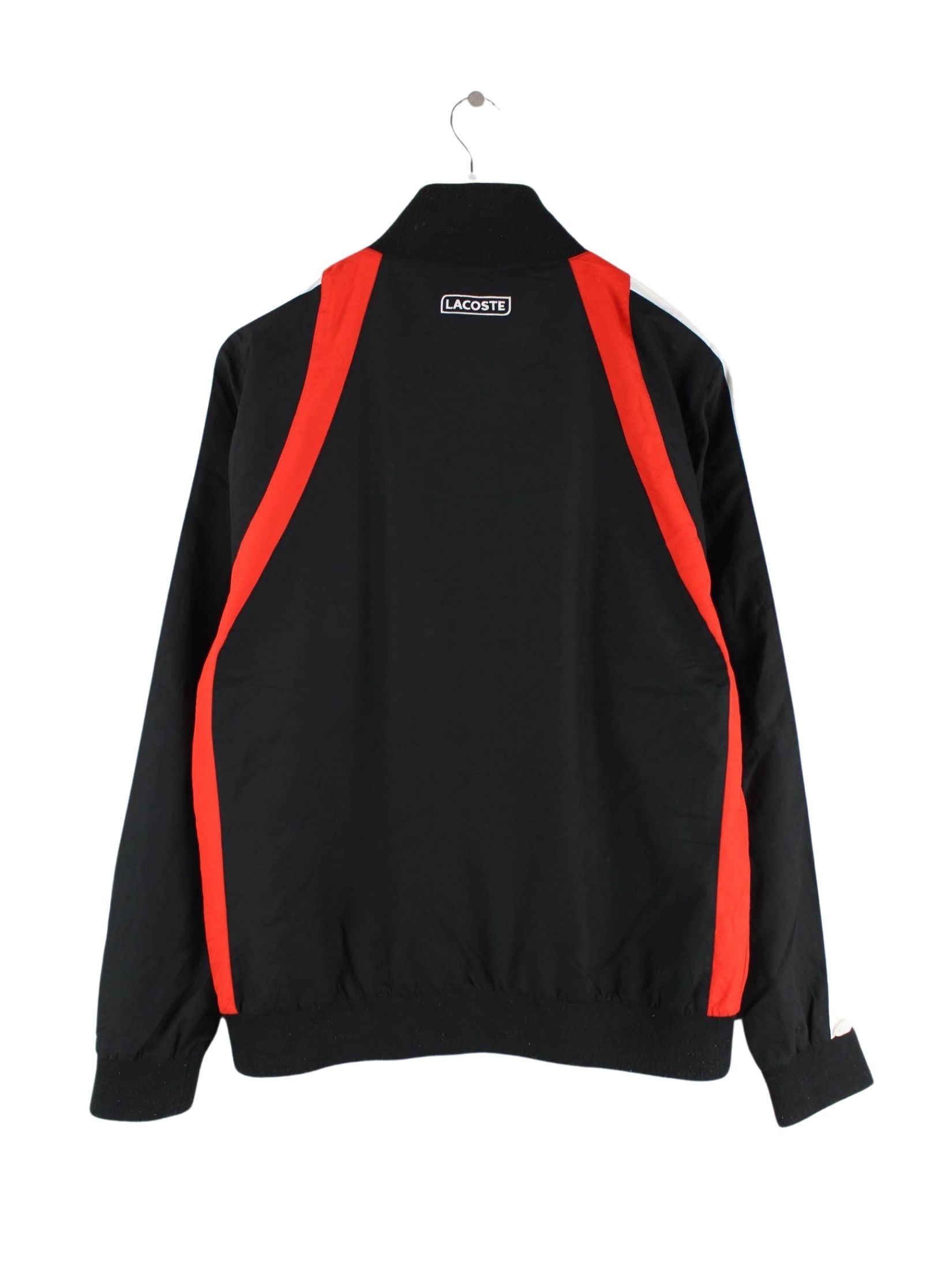 Schwarze Trainingsjacke des Labels Lacoste in Größe L. Sie ist aus Synthetik gemacht und in sehr gutem Zustand in Stock.