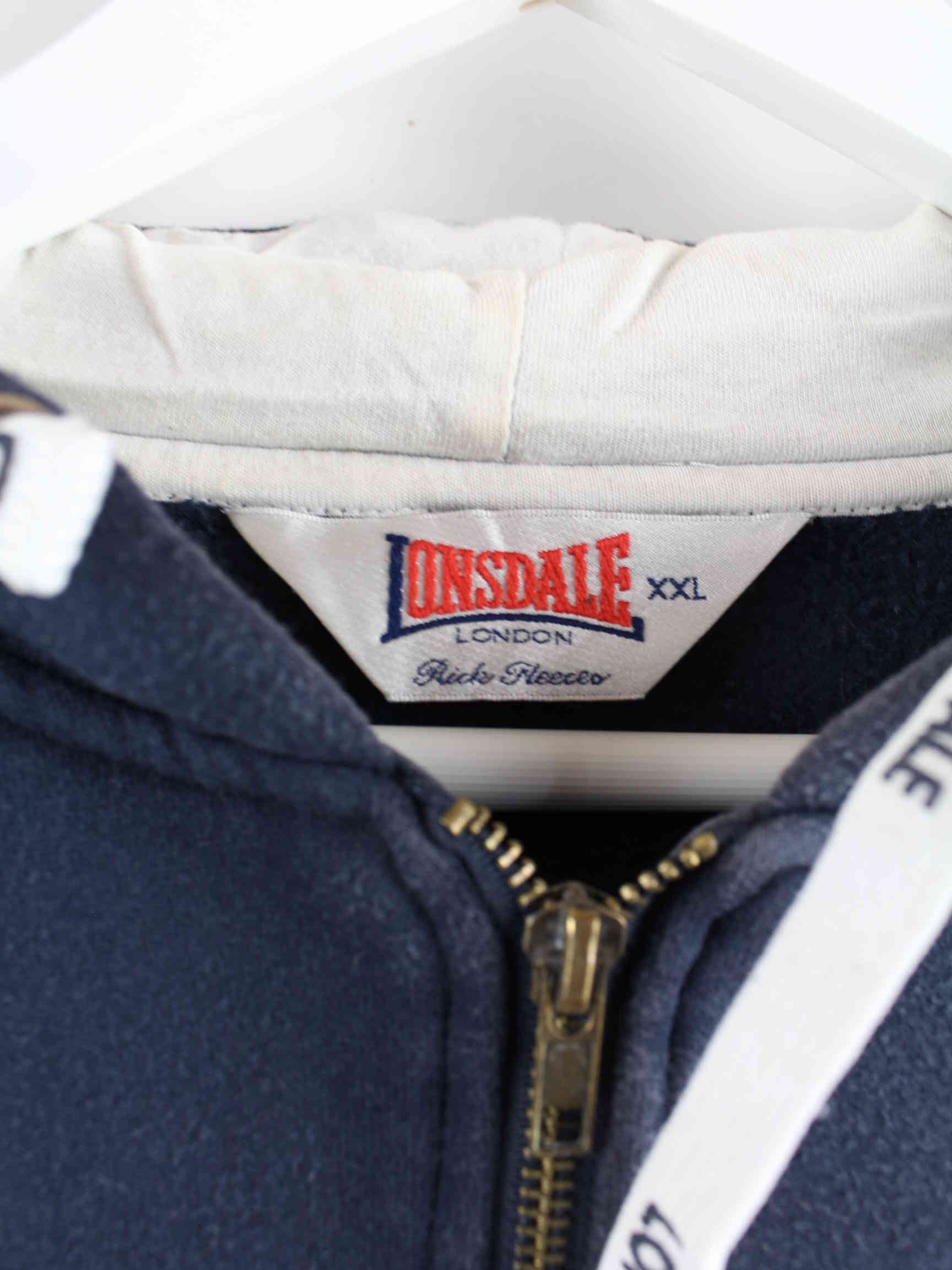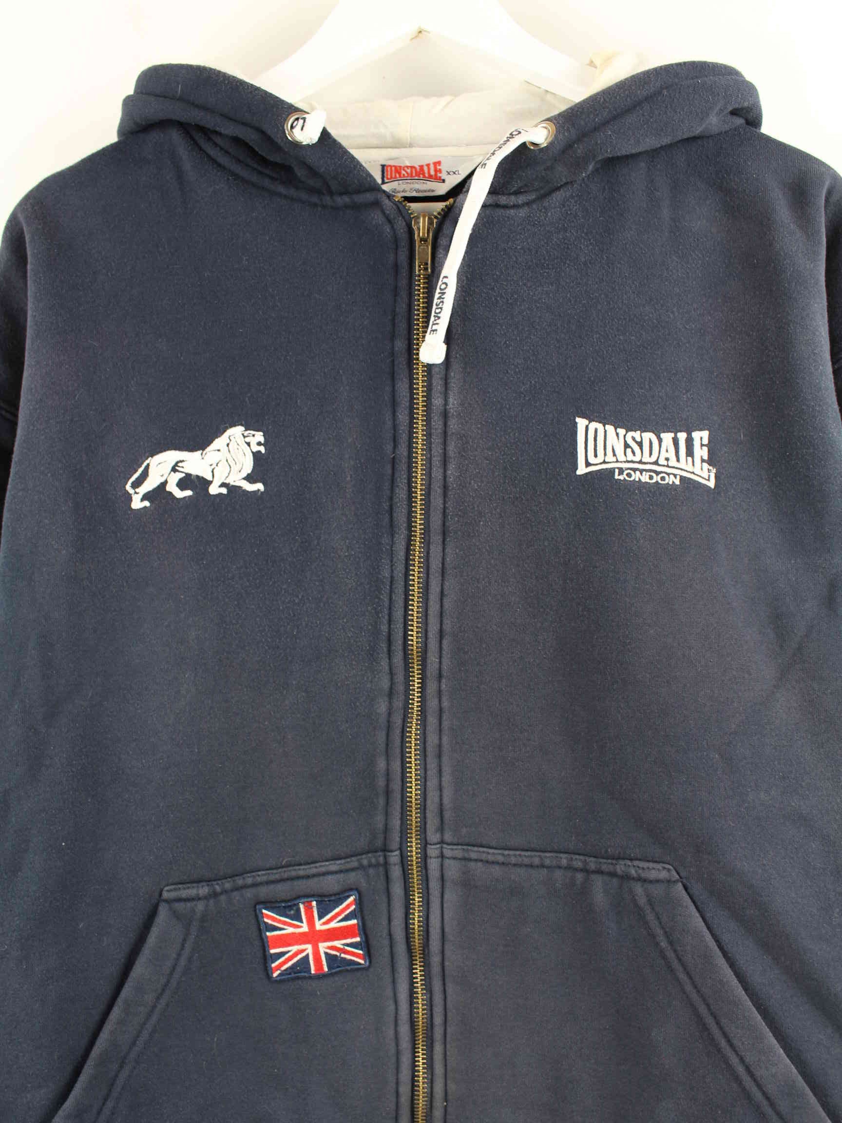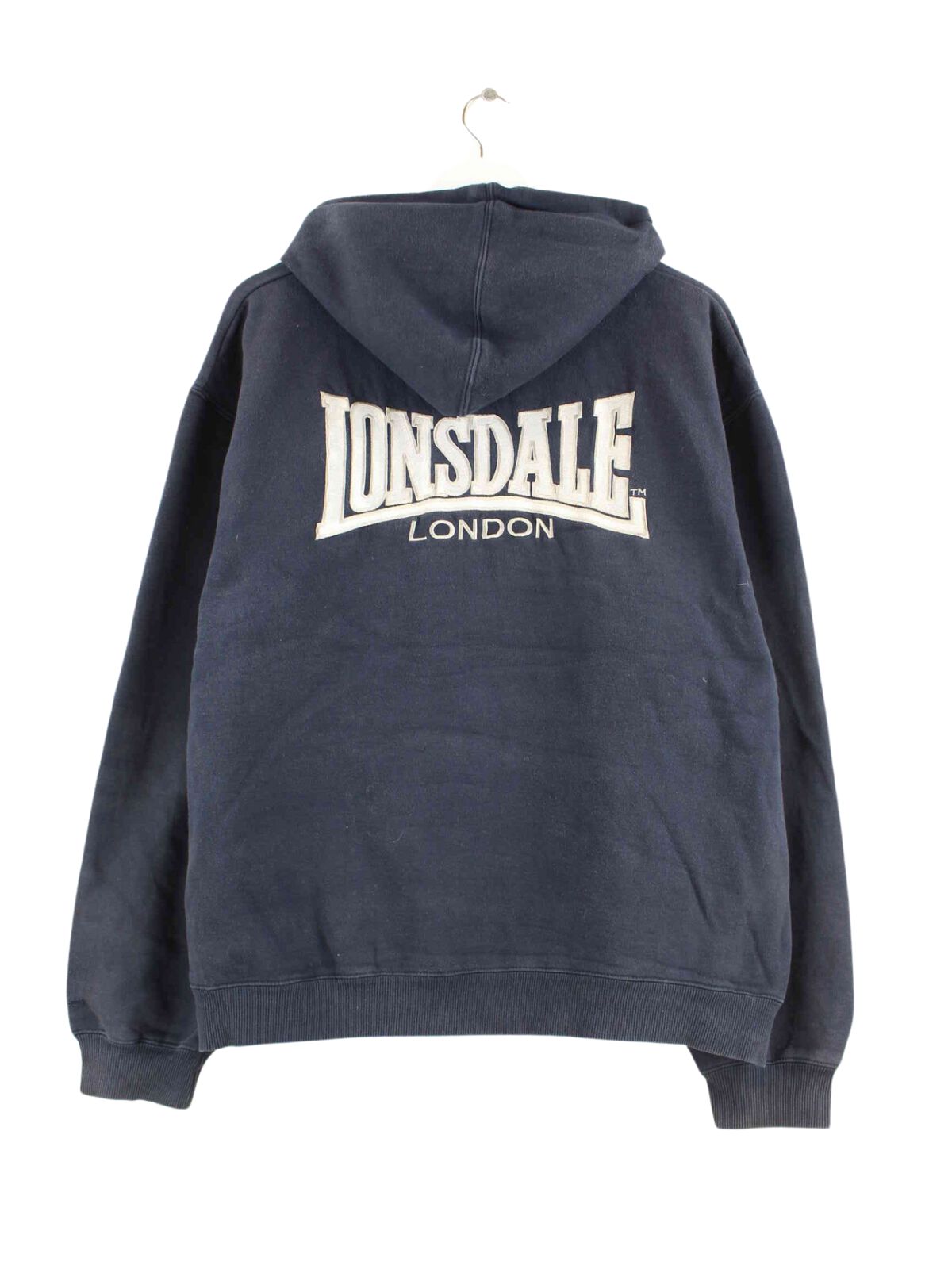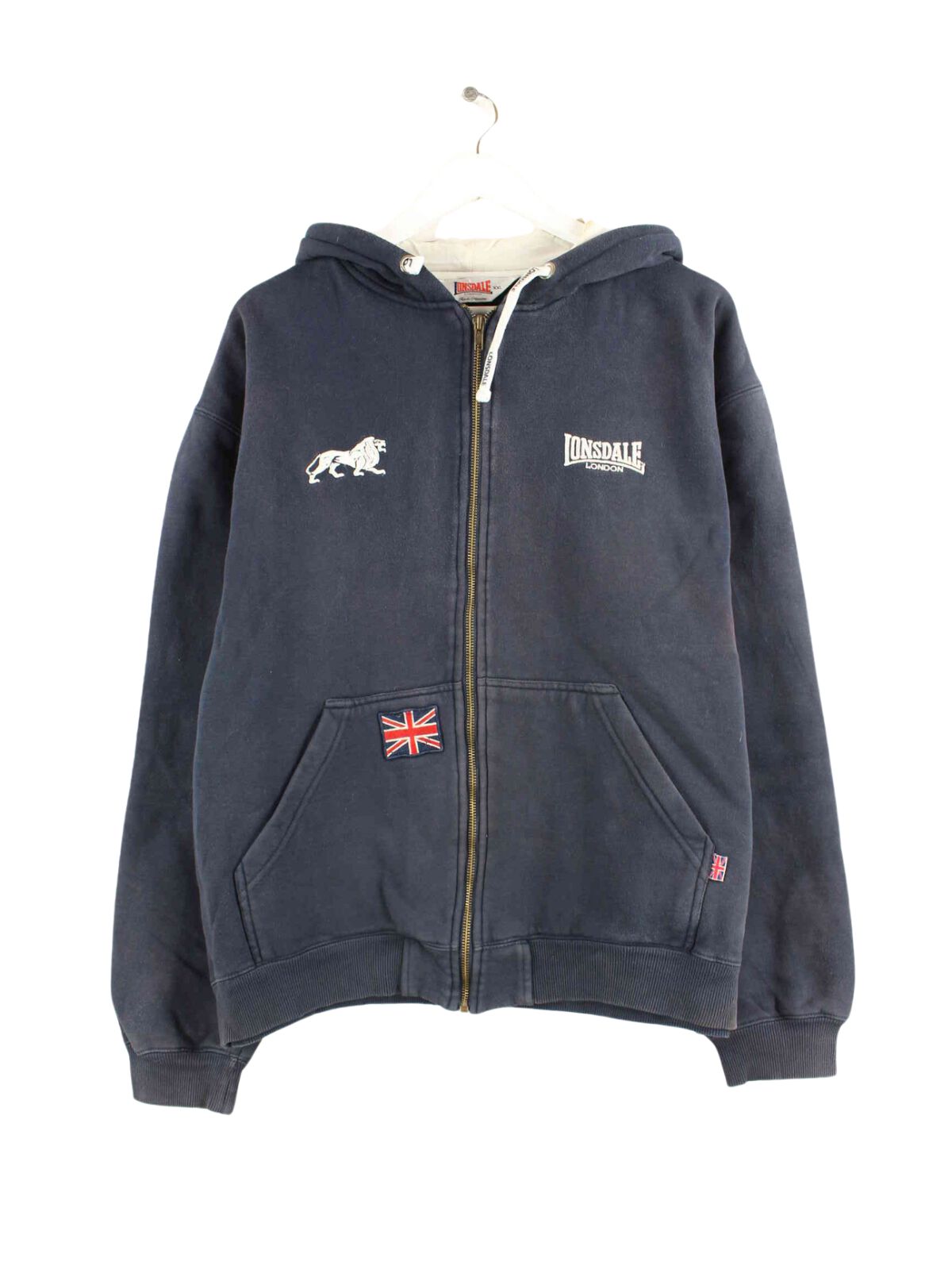 Hoodie from the Lonsdale brand with embroidery and a long zipper in size L from the early 2000s. It is made from a cotton blend and is available in blue.